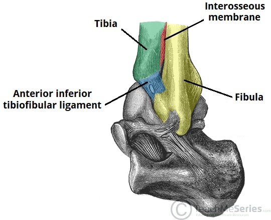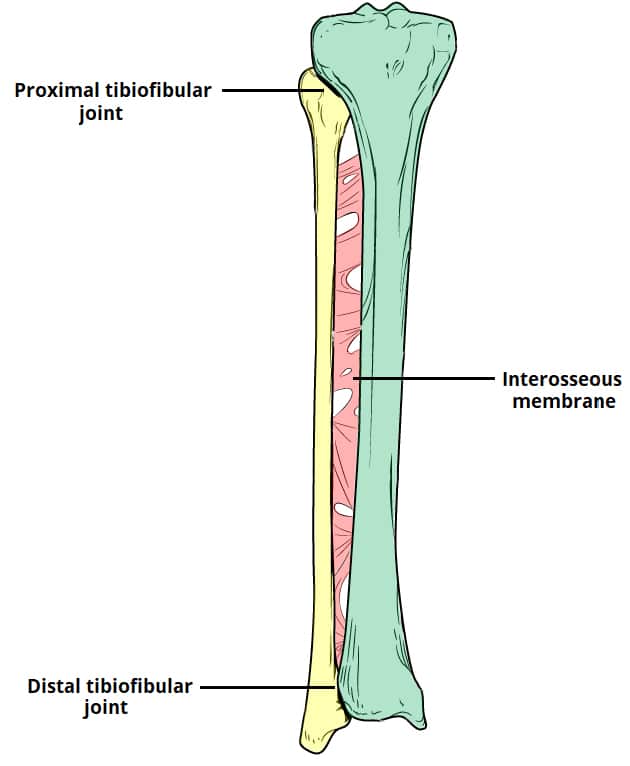 The proximal and distal tibiofibular joints refer to two articulations between the tibia and fibula of the leg. These joints have minimal function in terms of movement but play a greater role in stability and weight-bearing. In this article, we shall look at the anatomy of the proximal and distal tibiofibular joints – their structures, neurovascular supply and clinical relevance. Adapted from work by OpenStax College [CC BY 3.0], via Wikimedia Commons Fig 1Anterior view of the right proximal and distal tibiofibular joints. Pro Feature - 3D Model You've Discovered a Pro Feature Access our 3D Model Library Explore, cut, dissect, annotate and manipulate our 3D models to visualise anatomy in a dynamic, interactive way. Learn More Proximal Tibiofibular Joint Articulating Surfaces The proximal tibiofibular joint is formed by an articulation between the head of the fibula and the lateral condyle of the tibia. It is a plane type synovial joint; where the bones to glide over one another to create movement. Supporting Structures The articular surfaces of the proximal tibiofibular joint are lined with hyaline cartilage and contained within a joint capsule. The joint capsule receives additional support from: Anterior and posterior superior tibiofibular ligaments – span between the fibular head and lateral tibial condyle Lateral collateral ligament of the knee joint Biceps femoris – provides reinforcement as it inserts onto the fibular head. Neurovascular Supply The arterial supply to the proximal tibiofibular joint is via the inferior genicular arteries and the anterior tibial recurrent arteries. The joint is innervated by branches of the common fibular nerve and the nerve to the popliteus (a branch of the tibial nerve). By TeachMeSeries Ltd (2025) Fig 2Posterior view of the left proximal tibiofibular joint. Distal Tibiofibular joint Articulating Surfaces The distal (inferior) tibiofibular joint consists of an articulation between the fibular notch of the distal tibia and the fibula. It is an example of a fibrous joint, where the joint surfaces are by bound by tough, fibrous tissue. Supporting Structures The distal tibiofibular joint is supported by: Interosseous membrane – a fibrous structure spanning the length of the tibia and fibula. Anterior and posterior inferior tibiofibular ligaments Inferior transverse tibiofibular ligament – a continuation of the posterior inferior tibiofibular ligament. As it is a fibrous joint, the distal tibiofibular joint does not have a joint capsule (only synovial joints have a joint capsule). By TeachMeSeries Ltd (2025) Fig 3The left distal tibiofibular joint, supported by the interosseous membrane and the anterior inferior tibiofibular ligament. The posterior ligaments are not visible in this illustration. Neurovascular Supply Arterial supply to the distal tibiofibular joint is via branches of the fibular artery and the anterior and posterior tibial arteries. The nerve supply is derived from the deep peroneal and tibial nerves. Clinical Relevance Dislocation of the Proximal Tibiofibular Joint A proximal tibiofibular joint dislocation is a rare and often missed diagnosis. It accounts for <1% of all knee injuries. The typical mechanism of injury is a fall onto an adducted and flexed knee. They can also occur as a result of high-energy trauma. Common clinical features include inability to weight-bear, lateral knee pain and tenderness/prominence of the fibular head. This type of injury is typically treated with a closed reduction (a reduction is a procedure to restore the joint to its natural alignment). Complications of proximal tibiofibular joint dislocation include common fibular nerve injury (the nerve winds around the neck of the fibula), and recurrent dislocation. Do you think you’re ready? Take the quiz below Pro Feature - Quiz Tibiofibular Joints Question 1 of 3 Submitting... Skip Next Rate question: You scored 0% Skipped: 0/3 1800 More Questions Available Upgrade to TeachMeAnatomy Pro Challenge yourself with over 1800 multiple-choice questions to reinforce learning Learn More Rate This Article