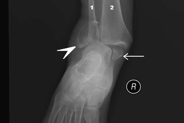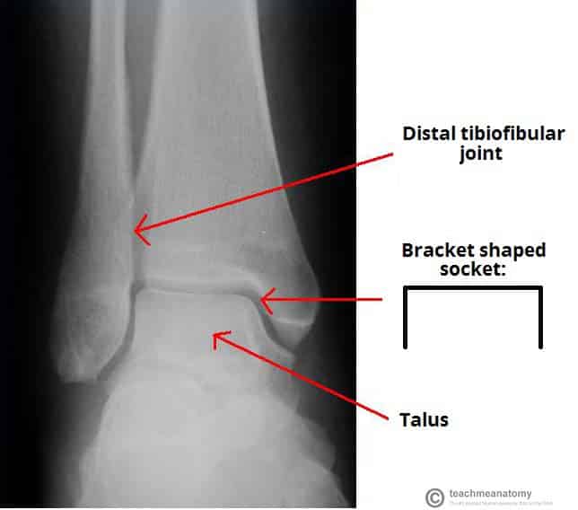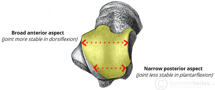 The ankle joint (or talocrural joint) is a synovial joint located in the lower limb. It is formed by the bones of the leg (tibia and fibula) and the foot (talus). Functionally, it is a hinge type joint, permitting dorsiflexion and plantarflexion of the foot. In this article, we shall look at the anatomy of the ankle joint; its articulating surfaces, ligaments, movements, and clinical correlations. By TeachMeSeries Ltd (2025) Fig 1The bones of the ankle joint; tibia, fibula and talus. Note that the calcaneous is not considered part of the ankle joint. Pro Feature - 3D Model You've Discovered a Pro Feature Access our 3D Model Library Explore, cut, dissect, annotate and manipulate our 3D models to visualise anatomy in a dynamic, interactive way. Learn More Articulating Surfaces The ankle joint is formed by three bones; the tibia and fibula of the leg, and the talus of the foot: The tibia and fibula are bound together by strong tibiofibular ligaments. Together, they form a bracket shaped socket, covered in hyaline cartilage. This socket is known as a mortise. The body of the talus fits snugly into the mortise formed by the bones of the leg. The articulating part of the talus is wedge shaped – it is broad anteriorly, and narrow posteriorly: Dorsiflexion – the anterior part of the talus is held in the mortise, and the joint is more stable. Plantarflexion – the posterior part of the talus is held in the mortise, and the joint is less stable. By TeachMeSeries Ltd (2025) Fig 2X-ray of a normal ankle joint. Note the bracket shaped socket formed by the tibia and fibula. By TeachMeSeries Ltd (2025) Fig 3The talus. It is broad anteriorly, which strengthens the joint during dorsiflexion. Ligaments There are two main sets of ligaments, which originate from each malleolus. Medial Ligament The medial ligament (or deltoid ligament) is attached to the medial malleolus (a bony prominence projecting from the medial aspect of the distal tibia). It consists of four ligaments, which fan out from the malleolus, attaching to the talus, calcaneus and navicular bones. The primary action of the medial ligament is to resist over-eversion of the foot. Lateral Ligament The lateral ligament originates from the lateral malleolus (a bony prominence projecting from the lateral aspect of the distal fibula). It resists over-inversion of the foot, and is comprised of three distinct and separate ligaments: Anterior talofibular – spans between the lateral malleolus and lateral aspect of the talus. Posterior talofibular – spans between the lateral malleolus and the posterior aspect of the talus. Calcaneofibular – spans between the lateral malleolus and the calcaneus. By OpenStax College [CC BY 3.0], via Wikimedia Commons Fig 4Ligaments of the ankle joint. Clinical Relevance The Ankle ‘Ring’ The ankle joint and associated ligaments can be visualised as a ring in the coronal plane: The upper part of the ring is formed by the articular surfaces of the tibia and fibula. The lower part of the ring is formed by the subtalar joint (between the talus and the calcaneus). The sides of the ring are formed by the medial and lateral ligaments. A ring, when broken, usually breaks in two places (the best way of illustrating this is with a polo mint – it is very difficult to break one side without breaking the other). When dealing with an injury to the ankle joint, a clinician must bear this in mind. For example, a fracture of the ankle joint may occur in association with ligament damage (which would not be apparent on x-ray). Movements and Muscles Involved The ankle joint is a hinge type joint, with movement permitted in one plane. Thus, plantarflexion and dorsiflexion are the main movements that occur at the ankle joint. Eversion and inversion are produced at the other joints of the foot, such as the subtalar joint. Plantarflexion – produced by the muscles in the posterior compartment of the leg (gastrocnemius, soleus, plantaris and posterior tibialis). Dorsiflexion – produced by the muscles in the anterior compartment of the leg (tibialis anterior, extensor hallucis longus and extensor digitorum longus). Neurovascular Supply The arterial supply to the ankle joint is derived from the malleolar branches of the anterior tibial, posterior tibial and fibular arteries. Innervation is provided by tibial, superficial fibular and deep fibular nerves. Clinical Relevance Ankle Sprain An ankle sprain refers to partial or complete tears in the ligaments of the ankle joint. It usually occurs via excessive inversion to a plantarflexed and weight-bearing foot. The lateral ligament is more likely to be damaged for two main reasons: The lateral ligament is weaker than the medial ligament. The lateral ligament resists inversion. The anterior talofibular ligament is the lateral ligament most at risk of irreversible damage. Clinical Relevance Pott’s Fracture-Dislocation A Pott’s fracture is a term used to describe a bimalleolar (medial and lateral malleoli) or trimalleolar (medial and lateral malleoli, and distal tibia) fracture. This type of injury is produced by forced eversion of the foot. It occurs in a series of stages: Forced eversion pulls on the medial ligaments, producing an avulsion fracture of the medial malleolus. The talus moves laterally, breaking off the lateral malleolus. The tibia is then forced anteriorly, shearing off the distal and posterior part against the talus. By Steven Fruitsmaak [CC BY-SA 3.0], from Wikimedia Commons Fig 5Bimalleolar fracture of the ankle. 1 – Fibula, 2 – Tibia. Do you think you’re ready? Take the quiz below Pro Feature - Quiz The Ankle Joint Question 1 of 3 Submitting... Skip Next Rate question: You scored 0% Skipped: 0/3 1800 More Questions Available Upgrade to TeachMeAnatomy Pro Challenge yourself with over 1800 multiple-choice questions to reinforce learning Learn More Rate This Article
