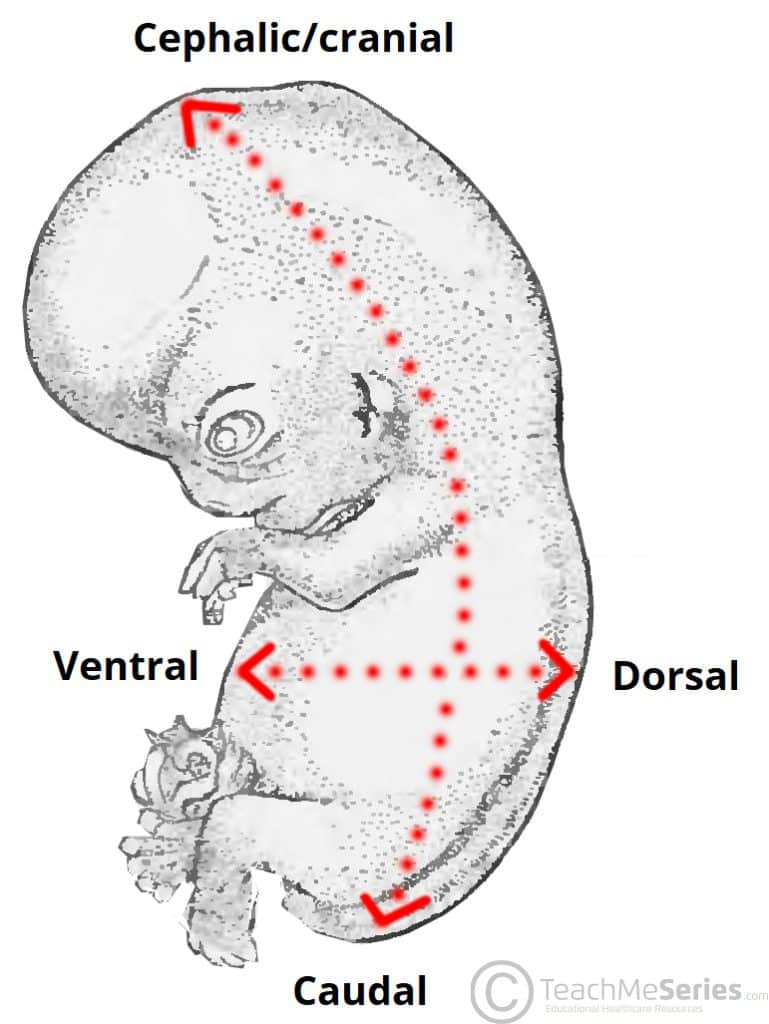 The anatomical terms of location are vital to understanding and using anatomy. They help to avoid any ambiguity that can arise when describing the location of structures. There are some terms that are specifically used in the description of embryology, which have the potential to further complicate an already complex subject! In this article, we shall look at the anatomical terms of location used in describing embryological anatomy. Pro Feature - 3D Model You've Discovered a Pro Feature Access our 3D Model Library Explore, cut, dissect, annotate and manipulate our 3D models to visualise anatomy in a dynamic, interactive way. Learn More Cephalic and Caudal Cephalic refers to the head of the embryo, while caudal refers to the tail (inferior) end. Cranial is often used instead of cephalic when describing a location of one structure relative to another. Examples: The vitelline duct lies caudally to the primitive brain. The foregut is cranial to the midgut. By TeachMeSeries Ltd (2025) Fig 1Cephalic/caudal and ventral/dorsal. Ventral and Dorsal The term ventral refers to the anterior (front) aspect of the embryo, while dorsal refers to the posterior (back). Examples: The gut tube lies ventrally to the spinal cord. The spinal cord is dorsal to the developing trachea Neuroembryological terms Rostral and caudal are only used to describe structures within the central nervous system, above the level of the spinal cord (e.g brainstem, cerebrum and cerebellum). They are more commonly used in neuroanatomy, but can be applied to embryology. Rostral and Caudal Rostral is taken from the Latin rostrum, to mean towards the nose/beak. Rostral therefore refers to the anterior (front) aspect of the head. In this context, caudal refers to the posterior (back) of the head. Examples: The forebrain is rostral to the midbrain. The hindbrain is caudal to the midbrain. By TeachMeSeries Ltd (2025) Fig 2In this context, rostral and caudal are only used to describe neuroanatomy in the head. Ventral and Dorsal As described above, ventral and dorsal refer to the anterior and posterior aspects of the body respectively. However in the context of the central nervous system, they have slightly different meanings. Ventral refers to the inferior region of the brain, while dorsal refers to the superior region (towards the scalp). Do you think you’re ready? Take the quiz below Pro Feature - Quiz Terms of Location in Embryology Question 1 of 3 Submitting... Skip Next Rate question: You scored 0% Skipped: 0/3 1800 More Questions Available Upgrade to TeachMeAnatomy Pro Challenge yourself with over 1800 multiple-choice questions to reinforce learning Learn More Rate This Article