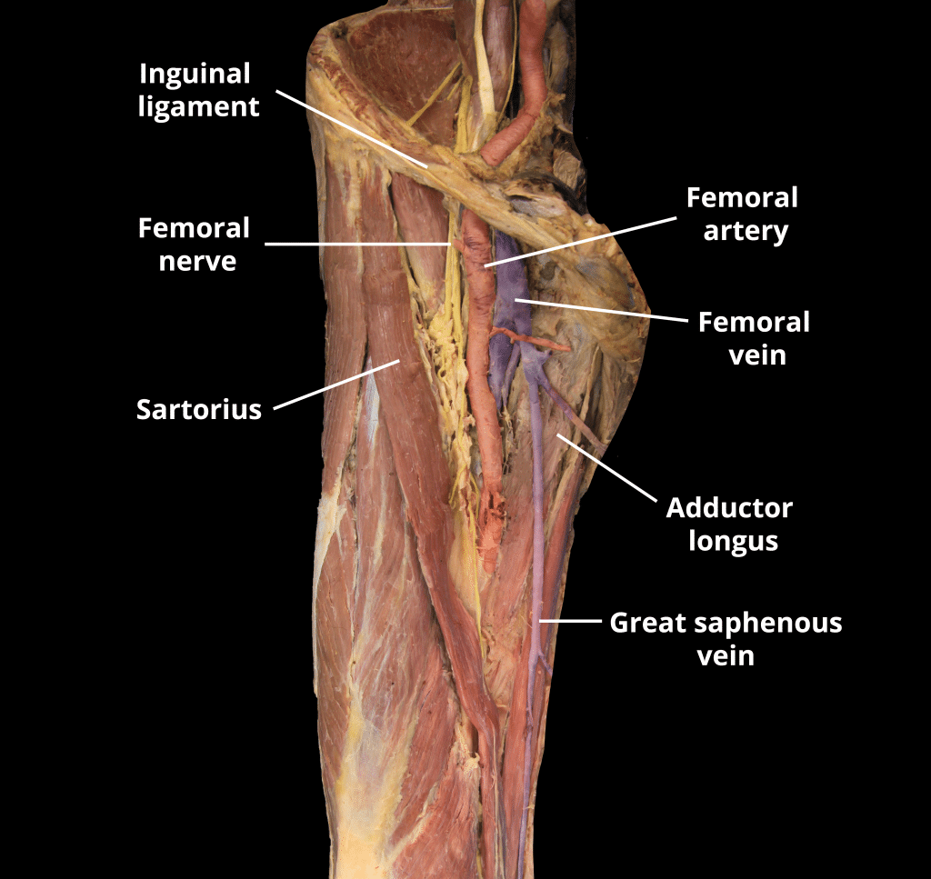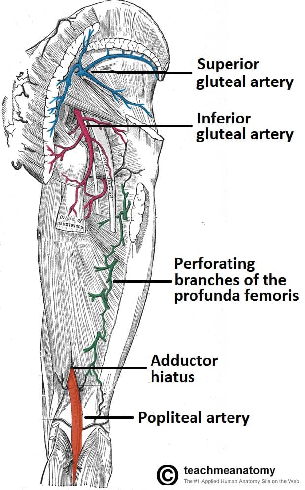 The arterial supply to the lower limb is chiefly supplied by the femoral artery and its branches. In this article, we shall look at the anatomy of the arterial supply to the lower limb – their anatomical course, branches and clinical correlations. Pro Feature - 3D Model You've Discovered a Pro Feature Access our 3D Model Library Explore, cut, dissect, annotate and manipulate our 3D models to visualise anatomy in a dynamic, interactive way. Learn More In the Thigh and Gluteal Region Femoral Artery The main artery of the lower limb is the femoral artery. It is a continuation of the external iliac artery (terminal branch of the abdominal aorta). The external iliac becomes the femoral artery when it crosses under the inguinal ligament and enters the femoral triangle. In the femoral triangle, the profunda femoris artery arises from the posterolateral aspect of the femoral artery. It travels posteriorly and distally, giving off three main branches: Perforating branches – Consists of three or four arteries that perforate the adductor magnus, contributing to the supply of the muscles in the medial and posterior thigh. Lateral femoral circumflex artery – Wraps round the anterolateral aspect of the femur, supplying muscles on the lateral aspect of the thigh. Medial femoral circumflex artery – Wraps round the posteromedial aspect of the femur, supplying its neck and head. In a fracture of the femoral neck this artery can easily be damaged, and avascular necrosis of the femur head can occur. After exiting the femoral triangle, the femoral artery continues down the anterior aspect of the thigh, through a tunnel known as the adductor canal. During its descent, the artery supplies the anterior thigh muscles. The adductor canal ends at an opening in the adductor magnus, called the adductor hiatus. The femoral artery moves through this opening, and enters the posterior compartment of the thigh, proximal to the knee. The femoral artery is now known as the popliteal artery. By TeachMeSeries Ltd (2025) Fig 1Overview of arterial supply to the thigh via the femoral artery Clinical Relevance Accessing the Femoral Artery The femoral artery is located superficially within the femoral triangle, and is thus easy to access. This makes it suitable for a range of clinical procedures. One such procedure is coronary angiography. Here, the femoral artery is catheterised with a long, thin tube. This tube is navigated up through the external iliac artery, common iliac artery, aorta, and into the coronary vessels. A radio-opaque dye is then injected into the coronary vessels, and any wall thickening or blockages can be visualised via x-ray. Other Arteries of the Thigh In addition to the femoral artery, there are other vessels supplying the lower limb. The obturator artery arises from the internal iliac artery in the pelvic region. It descends via the obturator canal to enter the medial thigh, bifurcating into two branches: Anterior branch – This supplies the pectineus, obturator externus, adductor muscles and gracilis. Posterior branch – This supplies some of the deep gluteal muscles. The gluteal region is largely supplied by the superior and inferior gluteal arteries. These arteries also arise from the internal iliac artery, entering the gluteal region via the greater sciatic foramen. The superior gluteal artery leaves the foramen above the piriformis muscle, the inferior below the muscle. In addition to the gluteal muscles, the inferior gluteal artery also contributes towards the vasculature of the posterior thigh. By TeachMeSeries Ltd (2025) Fig 2Arterial supply to the posterior thigh and gluteal region. Pro Feature - Dissection Images The borders and contents of the femoral triangle The borders and contents of the femoral triangle You've Discovered a Pro Feature Access our Dissection Image Library Enhance your understanding with high-resolution dissection images showcasing real-life anatomy. Learn More In the Leg The popliteal artery descends down the posterior thigh, giving rise to genicular branches that supply the knee joint. It moves through the popliteal fossa, exiting between the gastrocnemius and popliteus muscles. At the lower border of the popliteus, the popliteal artery terminates by dividing into the anterior tibial artery and the tibioperoneal trunk. In turn, the tibioperoneal trunk bifurcates into the posterior tibial and fibular arteries: Posterior tibial artery – continues inferiorly, along the surface of the deep posterior leg muscles (such as tibialis posterior). It enters the sole of the foot via the tarsal tunnel, accompanying the tibial nerve. Fibular (peroneal) artery – descends posteriorly to the fibula, within the posterior compartment of the leg. It gives rise to perforating branches, which penetrate the intermuscular septum to supply muscles in the lateral compartment of the leg. The other division of the popliteal artery, the anterior tibial artery, passes anteriorly between the tibia and fibula, through a gap in the interosseous membrane. It then moves inferiorly down the leg. It runs down the entire length of the leg, and into the foot, where it becomes the dorsalis pedis artery. By TeachMeSeries Ltd (2025) Fig 3Arterial supply to the anterior and posterior leg is via the popliteal artery and its branches. Clinical Relevance Popliteal Aneurysm An aneurysm is a dilation of an artery, which is greater than 50% of the normal diameter. The popliteal fascia (the roof of the popliteal fossa) is tough and non-extensible, and so an aneurysm of the popliteal artery has consequences for the other contents of the popliteal fossa. The tibial nerve is particularly susceptible to compression from the popliteal artery. The major features of tibial nerve compression are: Weakened or absent plantarflexion Paraesthesia of the foot and posterolateral leg An aneurysm of the popliteal artery can be detected by an obvious palpable pulsation in the popliteal fossa. An arterial bruit may be heard on