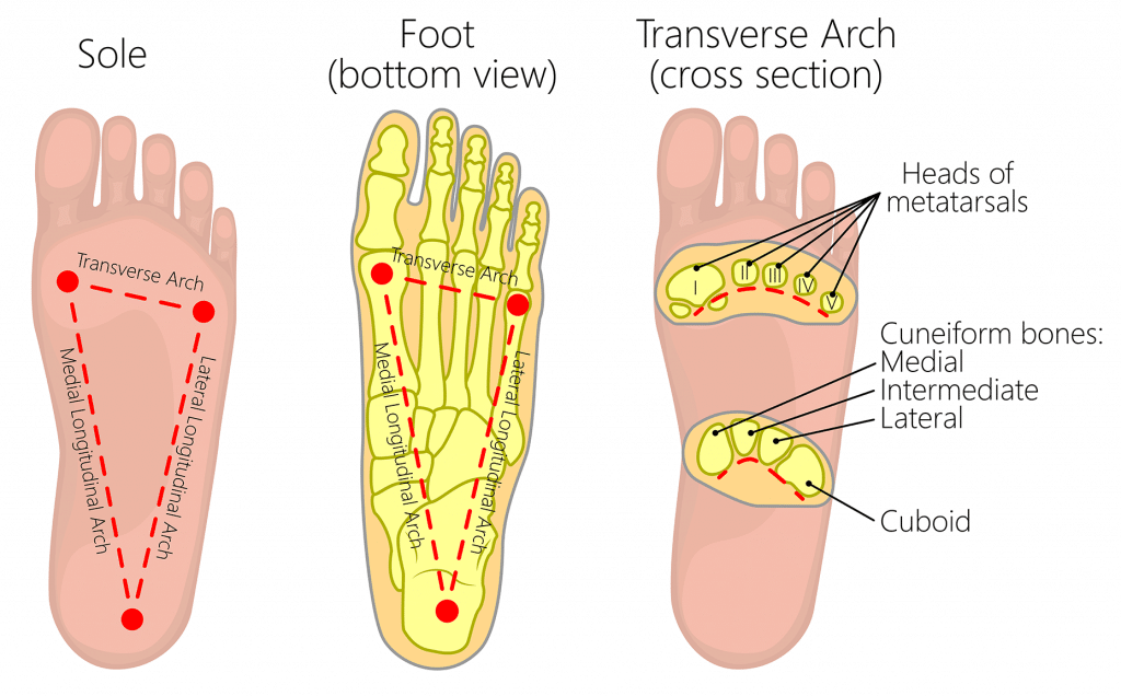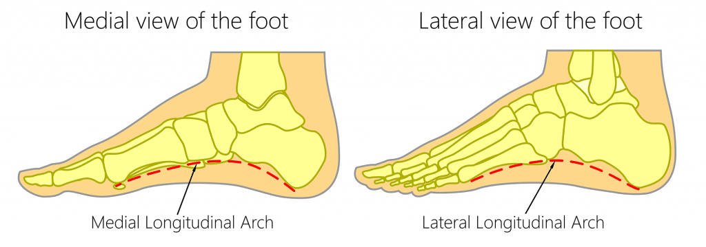 The foot has three arches: two longitudinal (medial and lateral) arches and one anterior transverse arch (Fig. 1). They are formed by the tarsal and metatarsal bones, and supported by ligaments and tendons in the foot. Their shape allows them to act in the same way as a spring, bearing the weight of the body and absorbing the shock produced during locomotion. The flexibility conferred to the foot by these arches facilitates functions such as walking and running. In this article, we shall examine the anatomy of the arches of the foot – their bony and ligamentous structure, the supporting tendons, and their clinical correlations. Adobe Stock, Licensed to TeachMeSeries Ltd Fig 1The transverse, medial longitudinal and lateral longitudinal arches of the foot. Pro Feature - 3D Model You've Discovered a Pro Feature Access our 3D Model Library Explore, cut, dissect, annotate and manipulate our 3D models to visualise anatomy in a dynamic, interactive way. Learn More Longitudinal Arches There are two longitudinal arches in the foot – the medial and lateral arches. They are formed between the tarsal bones and the metatarsal heads Medial Arch The medial arch is the higher of the two longitudinal arches. It is formed by the calcaneus, talus, navicular, three cuneiforms and first three metatarsal bones. It is supported by: Muscular support: Tibialis anterior and posterior, fibularis longus, flexor digitorum longus, flexor hallucis, and the intrinsic foot muscles Ligamentous support: Plantar ligaments (in particular the long plantar, short plantar and plantar calcaneonavicular ligaments), medial ligament of the ankle joint. Bony support: Shape of the bones of the arch. Other: Plantar aponeurosis. Lateral Arch The lateral arch is the flatter of the two longitudinal arches, and lies on the ground in the standing position. It is formed by the calcaneus, cuboid and 4th and 5th metatarsal bones. It is supported by: Muscular support: Fibularis longus, flexor digitorum longus, and the intrinsic foot muscles. Ligamentous support: Plantar ligaments (in particular the long plantar, short plantar and plantar calcaneonavicular ligaments). Bony support: Shape of the bones of the arch. Other: Plantar aponeurosis. Adobe Stock, Licensed to TeachMeSeries Ltd Fig 2The medial and lateral longitudinal arches of the foot. By TeachMeSeries Ltd (2025) Fig 3Supporting structures of the foot arches. Transverse Arch The transverse arch is located in the coronal plane of the foot. It is formed by the metatarsal bases, the cuboid and the three cuneiform bones. It has: Muscular support: Fibularis longus and tibialis posterior. Ligamentous support: Plantar ligaments (in particular the long plantar, short plantar and plantar calcaneonavicular ligaments) and deep transverse metatarsal ligaments. Other support: Plantar aponeurosis. Bony support: The wedged shape of the bones of the arch. Clinical Relevance Pes Cavus (High Arches) Pes cavus is a foot condition characterised by an unusually high medial longitudinal arch. It can appear in early life and become symptomatic with increasing age. Due to the higher arch, the ability to shock absorb during walking is diminished and an increased degree of stress is placed on the ball and heel of the foot. Consequently, symptoms will generally include pain in the foot, which can radiate to the ankle, leg, thigh and hip. This pain is transmitted up the lower limb from the foot due to the unusually high stress placed on the hindfoot during the heel strike of the gait cycle. Causes of pes cavus can be idiopathic, hereditary, due to an underlying congenital foot problem such as club foot, or secondary to neuromuscular damage such as in poliomyelitis. The condition is generally managed by supporting the foot through the use of special shoes or sole cushioning inserts. Reducing the amount of weight the foot has to bear, via overall weight loss can also improve the symptoms. By Benefros at English Wikipedia [CC-BY-SA-3.0], via Wikimedia Commons Fig 4Pes cavus, an abnormally high longitudinal arch. Clinical Relevance Pes Planus (Flat Footed) Pes planus is a common condition in which the longitudinal arches have been lost. Arches do not develop until about 2-3 years of age, meaning flat feet during infancy is normal. Because the arches are formed, in part, by the tight tendons of the foot, damage to these tissues through direct injury or trauma can cause pes planus. However in some people, the arches never formed during development. For most individuals, being flat-footed causes few, if any, symptoms. In children it may result in foot and ankle pain, whereas in adults the feet may ache after prolonged activity. Treatment, if indicated, generally involves the use of arch-supporting inserts for shoes. By TeachMeSeries Ltd (2025) Fig 5Pes planus, an abnormally flattened longitudinal arch. Do you think you’re ready? Take the quiz below Pro Feature - Quiz The Arches of the Foot Question 1 of 2 Submitting... Skip Next Rate question: You scored 0% Skipped: 0/2 1800 More Questions Available Upgrade to TeachMeAnatomy Pro Challenge yourself with over 1800 multiple-choice questions to reinforce learning Learn More Rate This Article