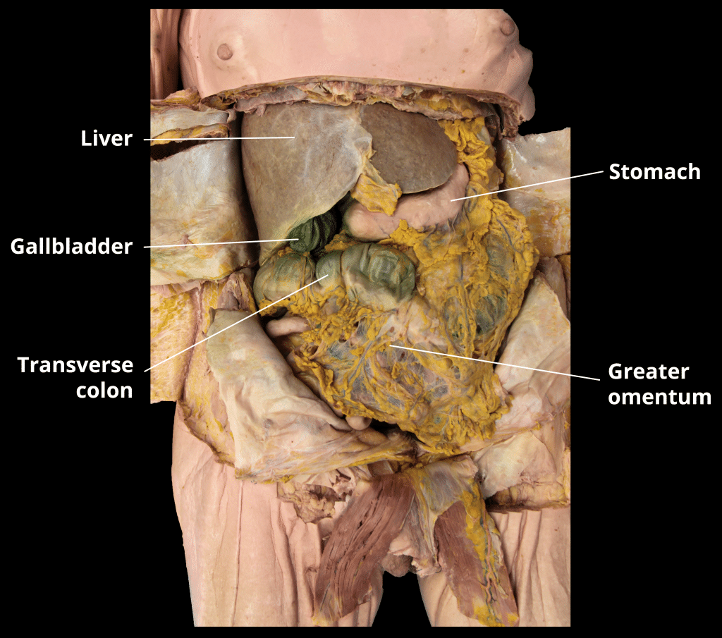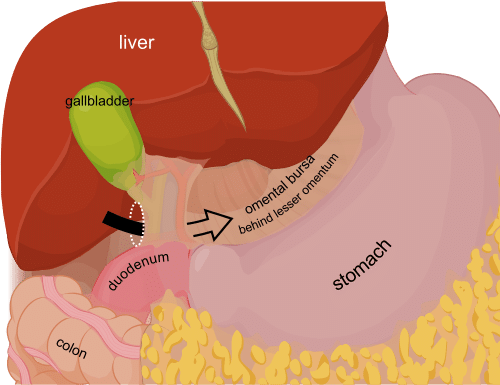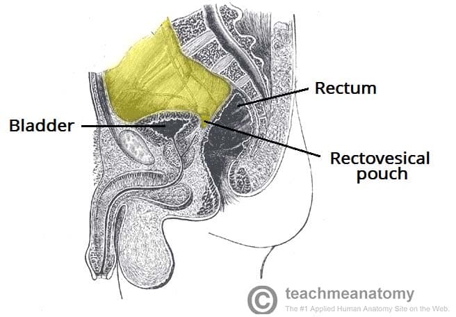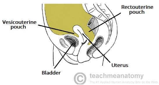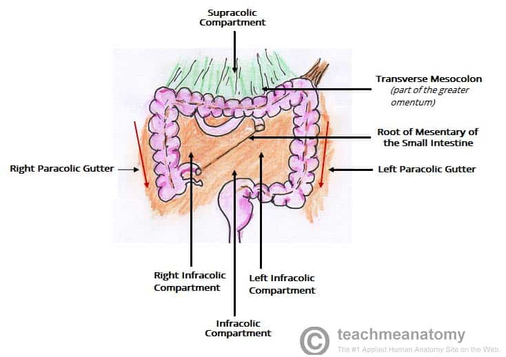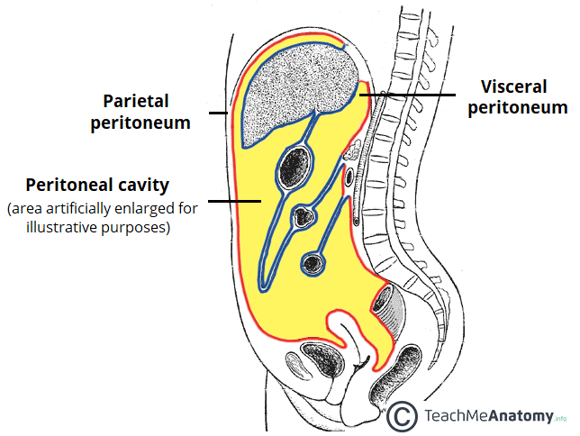 The peritoneal cavity is a potential space between the parietal and visceral peritoneum. It normally contains only a thin film of peritoneal fluid, which consists of water, electrolytes, leukocytes and antibodies. This fluid acts as a lubricant, enabling free movement of the abdominal viscera, and the antibodies in the fluid fight infection. While the peritoneal cavity is ordinarily filled with only a thin film of fluid, it is referred to as a potential space because excess fluid can accumulate in it, resulting in the clinical condition of ascites (see clinical applications). In this article, we shall look at the anatomy of the peritoneal cavity – its subdivisions, structure and clinical correlations. By TeachMeSeries Ltd (2025) Fig 1The peritoneal cavity is a potential space between the parietal and visceral peritoneum. Pro Feature - 3D Model You've Discovered a Pro Feature Access our 3D Model Library Explore, cut, dissect, annotate and manipulate our 3D models to visualise anatomy in a dynamic, interactive way. Learn More Subdivisions of the Peritoneal Cavity The peritoneal cavity can be divided into the greater and lesser peritoneal sacs. The greater sac comprises the majority of the peritoneal cavity. The lesser sac (also known as the omental bursa) is smaller and lies posterior to the stomach and lesser omentum. Greater Sac The greater sac is the larger portion of the peritoneal cavity. It is further divided into two compartments by the mesentery of the transverse colon (known as the transverse mesocolon): Supracolic compartment – lies above the transverse mesocolon and contains the stomach, liver and spleen. Infracolic compartment – lies below the transverse mesocolon and contains the small intestine, ascending and descending colon. The infracolic compartment is further divided into left and right infracolic spaces by the mesentery of the small intestine. The supracolic and infracolic compartments are connected by the paracolic gutters which lie between the posterolateral abdominal wall and the lateral aspect of the ascending or descending colon. By TeachMeSeries Ltd (2025) Fig 2The greater sac can be subdivided into the supracolic and infracolic compartments. Clinical Relevance Subphrenic Abscesses The subphrenic recesses are potential spaces in the supracolic compartment of the greater sac. They are located between the diaphragm and the liver. There are left and right subphrenic spaces, separated by the falciform ligament of the liver. Subphrenic abscesses refer to an accumulation of pus in the left or right subphrenic space. They are more common on the right side due to the increased frequency of appendicitis and ruptured duodenal ulcers (pus from the appendix can track up to the subphrenic space via the right paracolic gutter). Lesser Sac (Omental Bursa) The lesser sac lies posterior to the stomach and lesser omentum. It allows the stomach to move freely against the structures posterior and inferior to it. The omental bursa is connected with the greater sac through an opening in the omental bursa – the epiploic foramen (of Winslow). The epiploic foramen is situated posterior to the free edge of the lesser omentum (the hepatoduodenal ligament). By TeachMeSeries Ltd (2025) Fig 3Sagittal view of the peritoneal cavity. By Olek Remesz [CC BY-SA 3.0], via Wikimedia Commons Fig 4The lesser omentum removed to show the epiploic foramen of Winslow. Pro Feature - Dissection Images Prosection of the liver, stomach, transverse colon within the abdominal cavity. The small intestine and colon are covered by the greater omentum and are not visible in this specimen. Prosection of the liver, stomach, transverse colon within the abdominal cavity. The small intestine and colon are covered by the greater omentum and are not visible in this specimen. You've Discovered a Pro Feature Access our Dissection Image Library Enhance your understanding with high-resolution dissection images showcasing real-life anatomy. Learn More Structure of the Peritoneal Cavity in the Pelvis Due to the presence of different pelvic organs, the peritoneal cavity differs in structure between the sexes. The primary difference in structure is the location of the most distal portion of the cavity. When humans stand or sit upright, any superfluous fluid (which could be blood, pus, or infected fluid) is likely to collect in the most inferior portion of the peritoneal cavity. Thus, it is clinically important to be aware of the differences between males and females. Male In males, the rectovesical pouch is a double folding of peritoneum located between the rectum and the bladder. The peritoneal cavity is completely closed in males. By TeachMeSeries Ltd (2025) Fig 5The rectovesical pouch is the most distal portion of the peritoneal cavity in males. Females In females, there are two areas of note: Rectouterine pouch (of Douglas) – double folding of the peritoneum between the rectum and the posterior wall of the uterus. Vesicouterine pouch – double folding of peritoneum between the anterior surface of the uterus and the bladder. The peritoneal cavity is not completely closed in females – the uterine tubes open into the peritoneal cavity, providing a potential pathway between the female genital tract and the abdominal cavity. Clinically, this means that infections of the vagina, uterus, or uterine tubes may result in infection and inflammation of the peritoneum (peritonitis). Actual passage of infectious material into the peritoneum, however, is rare due to the presence of a mucous plug in the external os (opening) of the uterus which prevents the passage of pathogens but allows sperm to enter the uterus. By TeachMeSeries Ltd (2025) Fig 6The vesicouterine and rectouterine pouches Clinical Relevance Sampling of Peritoneal Fluid Culdocentesis Culdocentesis involves the extraction of fluid from the rectouterine pouch (of Douglas) through a needle inserted through the posterior fornix of the vagina. It can be used to extract