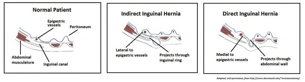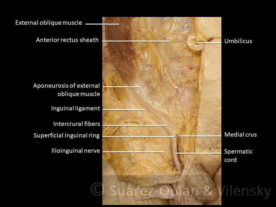 The inguinal canal is a short passage that extends inferiorly and medially through the inferior part of the abdominal wall. It is superior and parallel to the inguinal ligament. The canal serves as a pathway by which structures can pass from the abdominal wall to the external genitalia. It is of clinical importance as a potential weakness in the abdominal wall, and thus a common site of herniation. In this article, we shall look at the anatomy of the inguinal canal – its development, borders and contents. By TeachMeSeries Ltd (2025) Fig 1Overview of the inguinal canal. Clinically it is important to note that the opening to the inguinal canal is located laterally to the inferior epigastric artery. Pro Feature - 3D Model You've Discovered a Pro Feature Access our 3D Model Library Explore, cut, dissect, annotate and manipulate our 3D models to visualise anatomy in a dynamic, interactive way. Learn More Development of the Inguinal Canal During development, the tissue that will become gonads (either testes or ovaries) establish in the posterior abdominal wall, and descend through the abdominal cavity. A fibrous cord of tissue called the gubernaculum attaches the inferior portion of the gonad to the future scrotum or labia, and guides them during their descent. The inguinal canal is the pathway by which the testes (in an individual with an XY karyotype) leave the abdominal cavity and enter the scrotum. In the embryological stage, the canal is flanked by an out-pocketing of the peritoneum (processus vaginalis) and the abdominal musculature. The processus vaginalis normally degenerates, but a failure to do so can cause an indirect inguinal hernia, a hydrocele, or interfere with the descent of the testes. The gubernaculum (once it has shortened in the process of the descent of the testes) becomes a small scrotal ligament, tethering the testes to the scrotum and limiting their movement. Individuals with an XX karyotype also have a gubernaculum, which attaches the ovaries to the uterus and labia majora. Because the ovaries are attached to the uterus by the gubernaculum, they are prevented from descending as far as the testes, instead moving into the pelvic cavity. The gubernaculum then becomes two structures in the adult: the ovarian ligament and round ligament of uterus By TeachMeSeries Ltd (2025) Fig 2The descent and embryological development of the testes. Note that the processus vaginalis normally regresses after the descent of the testes Mid-Inguinal Point and Midpoint of the Inguinal Ligament These two terms are mentioned frequently in this article, and are often (mistakenly) used interchangeably: Mid-inguinal point – halfway between the pubic symphysis and the anterior superior iliac spine. The femoral pulse can be palpated here. Midpoint of the inguinal ligament – halfway between the pubic tubercle and the anterior superior iliac spine (the two attachments of the inguinal ligament). The opening to the inguinal canal is located just above this point. By TeachMeSeries Ltd (2025) Fig 3Coronal view of the pelvis, demonstrating the mid-inguinal point and the midpoint of the inguinal ligament Boundaries The inguinal canal is bordered by anterior, posterior, superior (roof) and inferior (floor) walls. It has two openings – the superficial and deep rings. Walls Anterior wall – aponeurosis of the external oblique, reinforced by the internal oblique muscle laterally. Posterior wall – transversalis fascia. Roof – transversalis fascia, internal oblique, and transversus abdominis. Floor – inguinal ligament (a ‘rolled up’ portion of the external oblique aponeurosis), thickened medially by the lacunar ligament. During periods of increased intra-abdominal pressure, the abdominal viscera are pushed into the posterior wall of the inguinal canal. To prevent herniation of viscera into the canal, the muscles of the anterior and posterior wall contract, and ‘clamp down’ on the canal. By TeachMeSeries Ltd (2025) Fig 4The borders of the inguinal canal. The anterior wall of the left inguinal canal has been removed. DARTMOUTH MEDICAL SCHOOL Fig 5Sagittal view of the inguinal canal, showing the borders. Rings The two openings to the inguinal canal are known as rings. There are two rings – deep (internal) and superficial (external): Deep (internal) ring: Marks the internal opening of the inguinal canal Found above the midpoint of the inguinal ligament (lateral to the epigastric vessels). The ring is created by the transversalis fascia, which invaginates to form a covering of the contents of the inguinal canal. Superficial (external) ring: Marks the external end of the inguinal canal Lies just superior to the pubic tubercle. It is a triangle shaped opening, formed by the invagination of the external oblique, which forms another covering of the inguinal canal contents. It contains intercrural fibres, which run perpendicular to the aponeurosis of the external oblique and prevent the ring from widening. Contents The contents of the inguinal canal include: Spermatic cord (biological males only) – contains neurovascular and reproductive structures that supply and drain the testes. See here for more information. Round ligament (biological females only) – originates from the uterine horn and travels through the inguinal canal to attach at the labia majora. Ilioinguinal nerve – contributes towards the sensory innervation of the genitalia Note: only travels through part of the inguinal canal, exiting via the superficial inguinal ring (it does not pass through the deep inguinal ring) This is the nerve most at risk of damage during an inguinal hernia repair. Genital branch of the genitofemoral nerve – supplies the cremaster muscle and anterior scrotal skin in males, and the skin of the mons pubis and labia majora in females. The walls of the inguinal canal are usually collapsed around their contents, preventing other structures from potentially entering the canal and becoming stuck. Clinical Rele