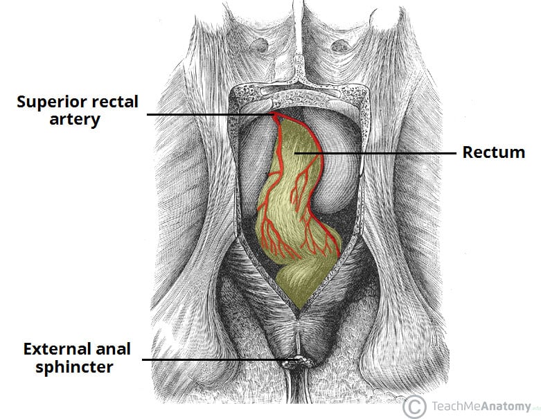 The rectum is located between the large intestine and the anal canal, and enables the temporary store of faeces.