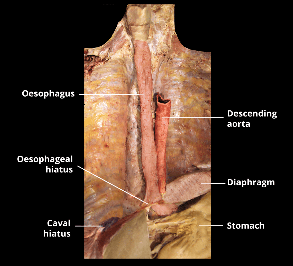 The stomach, is an intraperitoneal digestive organ located between the oesophagus and the duodenum. It has a ‘J’ shape, and features a lesser and greater curvature. The anterior and posterior surfaces are smoothly rounded with a peritoneal covering. In this article, we shall look at the anatomy of the stomach – its position, structure and neurovascular supply. Pro Feature - 3D Model You've Discovered a Pro Feature Access our 3D Model Library Explore, cut, dissect, annotate and manipulate our 3D models to visualise anatomy in a dynamic, interactive way. Learn More Anatomical Position The stomach lies within the superior aspect of the abdomen. It primarily lies in the epigastric and umbilical regions, however, the exact size, shape and position of the stomach can vary from person to person and with position and respiration. Pro Feature - Dissection Images Dissection of the thorax, demonstrating the passage of the oesophagus, inferior vena cava and descending aorta through the diaphragm. Note how the right crus of the diaphragm has a 'pinch-cock' effect on the oesophagus to form the lower oesophageal sphincter Dissection of the thorax, demonstrating the passage of the oesophagus, inferior vena cava and descending aorta through the diaphragm. Note how the right crus of the diaphragm has a 'pinch-cock' effect on the oesophagus to form the lower oesophageal sphincter You've Discovered a Pro Feature Access our Dissection Image Library Enhance your understanding with high-resolution dissection images showcasing real-life anatomy. Learn More Anatomical Structure Divisions of the Stomach The stomach has four main anatomical divisions; the cardia, fundus, body and pylorus: Cardia – surrounds the superior opening of the stomach at the T11 level. Fundus – the rounded, often gas filled portion superior to and left of the cardia. Body – the large central portion inferior to the fundus. Pylorus – This area connects the stomach to the duodenum. It is divided into the pyloric antrum, pyloric canal and pyloric sphincter. The pyloric sphincter demarcates the transpyloric plane at the level of L1. By TeachMeSeries Ltd (2025) Fig 1The parts of the stomach. Greater and Lesser Curvatures The medial and lateral borders of the stomach are curved, forming the lesser and greater curvatures: Greater curvature – forms the long, convex, lateral border of the stomach. Arising at the cardiac notch, it arches backwards and passes inferiorly to the left. It curves to the right as it continues medially to reach the pyloric antrum. The short gastric arteries and the right and left gastro-omental arteries supply branches to the greater curvature. Lesser curvature – forms the shorter, concave, medial surface of the stomach. The most inferior part of the lesser curvature, the angular notch, indicates the junction of the body and pyloric region. The lesser curvature gives attachment to the hepatogastric ligament and is supplied by the left gastric artery and right gastric branch of the hepatic artery. By TeachMeSeries Ltd (2025) Fig 2The greater and lesser curvatures of the stomach Anatomical Relations The anatomical relations of the stomach are given in the table below: Anatomical Relation Structures Superior Oesophagus and left dome of the diaphragm Anterior Diaphragm, greater omentum, anterior abdominal wall, left lobe of liver, gall bladder Posterior Lesser sac, pancreas, left kidney, left adrenal gland, spleen, splenic artery, transverse mesocolon Sphincters of the Stomach There are two sphincters of the stomach, located at each orifice. They control the passage of material entering and exiting the stomach. Inferior Oesophageal Sphincter The oesophagus passes through the diaphragm through the oesophageal hiatus at the level of T10. It descends a short distance to the inferior oesophageal sphincter at the T11 level which marks the transition point between the oesophagus and stomach (in contrast to the superior oesophageal sphincter, located in the pharynx). It allows food to pass through the cardiac orifice and into the stomach and is not under voluntary control. Pyloric Sphincter The pyloric sphincter lies between the pylorus and the first part of the duodenum. It controls of the exit of chyme (food and gastric acid mixture) from the stomach. In contrast to the inferior oesophageal sphincter, this is an anatomical sphincter. It contains smooth muscle, which constricts to limit the discharge of stomach contents through the orifice. Emptying of the stomach occurs intermittently when intragastric pressure overcomes the resistance of the pylorus. The pylorus is normally contracted so that the orifice is small and food can stay in the stomach for a suitable period. Gastric peristalsis pushes the chyme through the pyloric canal into the duodenum for further digestion. By TeachMeSeries Ltd (2025)Fig 3The peristaltic ejection waves of the stomach Greater and Lesser Omenta Within the abdominal cavity, a double layered membrane called the peritoneum. supports most of the abdominal viscera and assists with their attachment to the abdominal wall. The greater and lesser omenta are two structures that consist of peritoneum folded over itself (two layers of peritoneum – four membrane layers). Both omenta attach to the stomach, and are useful anatomical landmarks: Greater omentum – hangs down from the greater curvature of the stomach and folds back upon itself where it attaches to the transverse colon It contains many lymph nodes and may adhere to inflamed areas , therefore playing a key role in gastrointestinal immunity and minimising the spread of intraperitoneal infections. Lesser omentum– continuous with peritoneal layers of the stomach and duodenum, this smaller peritoneal fold arises at the lesser curvature and ascend to attach to the liver. The main function of the lesser omentum is to attach the stomach and duodenum to the liver. Together, the greater and lesser omenta divide the abdominal cavity into two; 