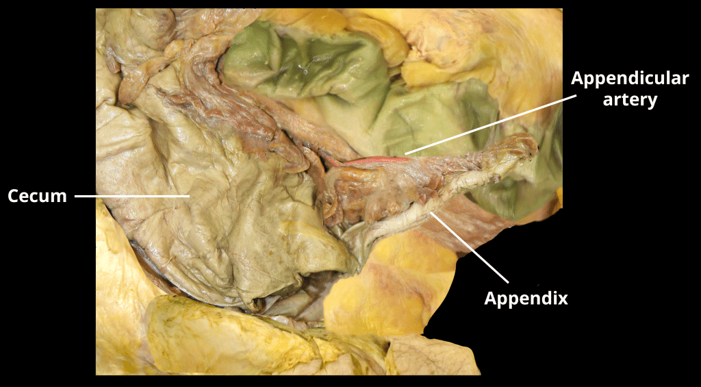 The appendix is a narrow blind-ended tube that is attached to the posteromedial end of the cecum (large intestine). It contains a large amount of lymphoid tissue but is not thought to have any vital functions in the human body. In this article, we shall look at the anatomy of the appendix – its anatomical structure and relations, neurovascular supply and lymphatic drainage. Pro Feature - 3D Model You've Discovered a Pro Feature Access our 3D Model Library Explore, cut, dissect, annotate and manipulate our 3D models to visualise anatomy in a dynamic, interactive way. Learn More Anatomical Structure and Relations The appendix originates from the posteromedial aspect of the cecum. It is supported by the mesoappendix, a fold of mesentery which suspends the appendix from the terminal ileum. The position of the free-end of the appendix is highly variable and can be categorised into seven main locations depending on its relationship to the ileum, caecum or pelvis. The most common position is retrocecal. They may also be remembered by their relationship to a clock face: Pre-ileal – anterior to the terminal ileum – 1 or 2 o’clock. Post-ileal – posterior to the terminal ileum – 1 or 2 o’clock. Sub-ileal – parallel with the terminal ileum – 3 o’clock. Pelvic – descending over the pelvic brim – 5 o’clock. Subcecal – below the cecum – 6 o’clock. Paracecal – alongside the lateral border of the cecum – 10 o’clock. Retrocecal – behind the cecum – 11 o’clock. By TeachMeSeries Ltd (2025) Fig 1The cecum. Note the blind end inferiorly, and its continuity with the ascending colon superiorly. By TeachMeSeries Ltd (2025) Fig 2The common positions of the appendix. The most common position is retrocecal. Pro Feature - Dissection Images Origin of the appendix from the cecum with blood supply from the appendicular artery Origin of the appendix from the cecum with blood supply from the appendicular artery You've Discovered a Pro Feature Access our Dissection Image Library Enhance your understanding with high-resolution dissection images showcasing real-life anatomy. Learn More Neurovascular Supply The appendix is derived from the embryologic midgut. Therefore, the vascular supply is via branches of the superior mesenteric vessels. Arterial supply is from the appendicular artery (derived from the ileocolic artery, a branch of the superior mesenteric artery) and venous drainage is via the corresponding appendicular vein. Both are contained within the mesoappendix. Sympathetic and parasympathetic branches of the autonomic nervous system innervate the appendix. This is achieved by the ileocolic branch of the superior mesenteric plexus. It accompanies the ileocolic artery to reach the appendix. Note: Of clinical relevance, the sympathetic afferent fibres of the appendix arise from T10 of the spinal cord – thus explaining why the visceral pain of early appendicitis is felt centrally within the abdomen. By TeachMeSeries Ltd (2025) Fig 3Arterial supply to the cecum and appendix via the ileocecal artery. Lymphatic Drainage Lymphatic fluid from the appendix drains into lymph nodes within the mesoappendix and into the ileocolic lymph nodes (which surround the ileocolic artery). By TeachMeSeries Ltd (2025) Fig 4Lymphatic drainage of the cecum and appendix. Clinical Relevance Inflammation of the Appendix Inflammation of the appendix is known as appendicitis, and is a common cause for acute severe abdominal pain. In established appendicitis, the abdomen is most tender at McBurney’s point – situated one third of the distance from the right anterior superior iliac spine to the umbilicus. This corresponds to the location of the base of the appendix when it lies in a retrocecal position. The aetiology of appendicitis depends on age. In the young, it is mostly due to an increase in lymphoid tissue size, which occludes the lumen. From 30 years old onwards, it is more likely to be blocked due a faecolith. Initially, pain from the appendix and its visceral peritoneum is referred to the umbilical region. As the appendix becomes increasingly inflamed, it irritates the parietal peritoneum, causing the pain to localise to the right lower quadrant. If the appendix is not removed, it can become necrotic and rupture, resulting in peritonitis (inflammation of the peritoneum). Do you think you’re ready? Take the quiz below Pro Feature - Quiz The Appendix Question 1 of 3 Submitting... Skip Next Rate question: You scored 0% Skipped: 0/3 1800 More Questions Available Upgrade to TeachMeAnatomy Pro Challenge yourself with over 1800 multiple-choice questions to reinforce learning Learn More Rate This Article