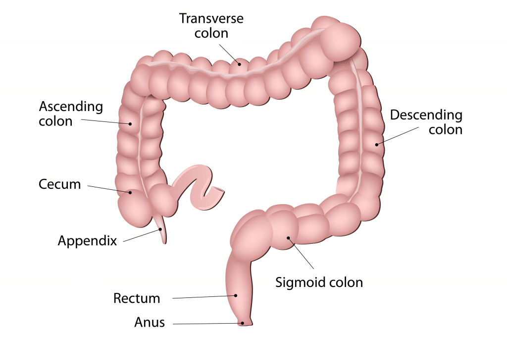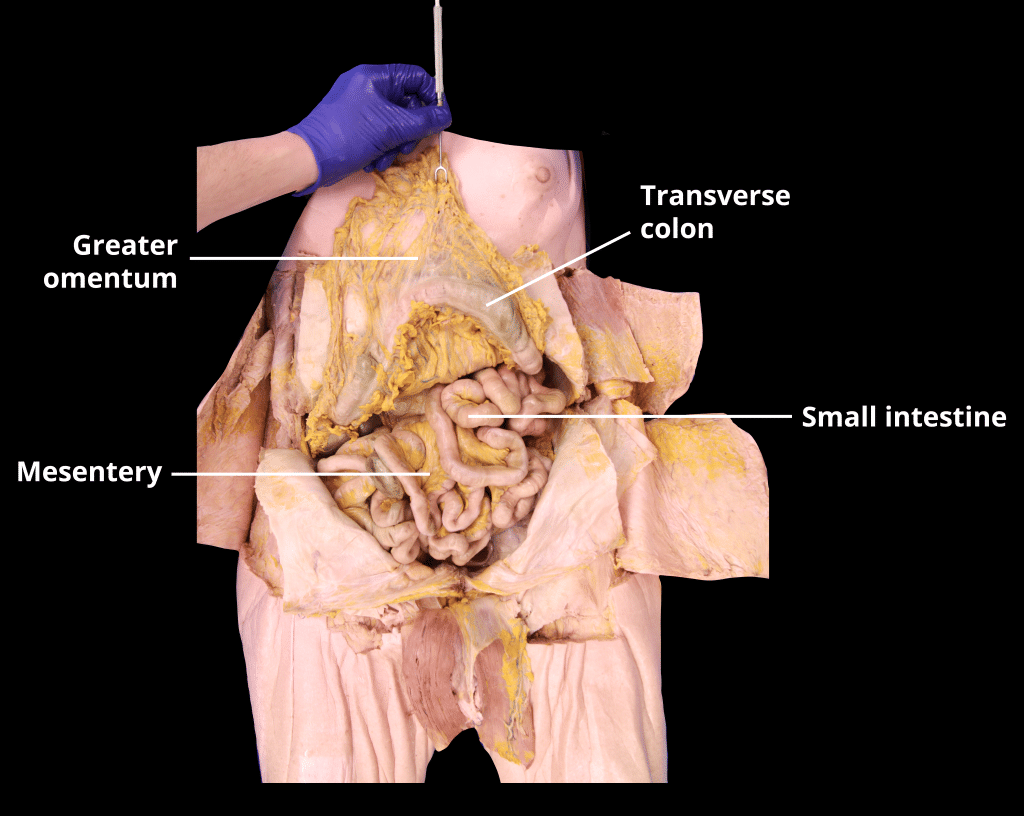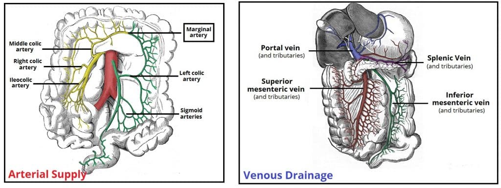 The colon (large intestine) is the distal part of the gastrointestinal tract, extending from the cecum to the anal canal. It receives digested food from the small intestine, from which it absorbs water and electrolytes to form faeces. Anatomically, the colon can be divided into four parts – ascending, transverse, descending and sigmoid. These sections form an arch, which encircles the small intestine. In this article, we shall look at the anatomy of the colon – its anatomical structure and relations, neurovascular supply, and clinical correlations. Pro Feature - 3D Model You've Discovered a Pro Feature Access our 3D Model Library Explore, cut, dissect, annotate and manipulate our 3D models to visualise anatomy in a dynamic, interactive way. Learn More Anatomical Position The colon averages 150cm in length, and can be divided into four parts (proximal to distal): ascending, transverse, descending and sigmoid. Ascending Colon The colon begins as the ascending colon, a retroperitoneal structure which ascends superiorly from the cecum. When it meets the right lobe of the liver, it turns 90 degrees to move horizontally. This turn is known as the right colic flexure (or hepatic flexure), and marks the start of the transverse colon. Transverse Colon The transverse colon extends from the right colic flexure to the spleen, where it turns another 90 degrees to point inferiorly. This turn is known as the left colic flexure (or splenic flexure). Here, the colon is attached to the diaphragm by the phrenicocolic ligament. The transverse colon is the least fixed part of the colon, and is variable in position (it can dip into the pelvis in tall, thin individuals). Unlike the ascending and descending colon, the transverse colon is intraperitoneal and is enclosed by the transverse mesocolon. Descending Colon After the left colic flexure, the colon moves inferiorly towards the pelvis – and is called the descending colon. It is retroperitoneal in the majority of individuals, but is located anteriorly to the left kidney, passing over its lateral border. When the colon begins to turn medially, it becomes the sigmoid colon. Sigmoid Colon The 40cm long sigmoid colon is located in the left lower quadrant of the abdomen, extending from the left iliac fossa to the level of the S3 vertebra. This journey gives the sigmoid colon its characteristic “S” shape. The sigmoid colon is attached to the posterior pelvic wall by a mesentery – the sigmoid mesocolon. The long length of the mesentery permits this part of the colon to be particularly mobile. Adobe Stock, Licensed to TeachMeSeries Ltd Fig 1The large intestine extends from the cecum to the rectum. It is comprised of the ascending, transverse, descending and sigmoid colon. Paracolic Gutters The paracolic gutters are two spaces between the ascending/descending colon and the posterolateral abdominal wall. These structures are clinically important, as they allow material that has been released from inflamed or infected abdominal organs to accumulate elsewhere in the abdomen. Pro Feature - Dissection Images Prosection of the abdomen with the greater omentum reflected back to reveal the small intestine. Prosection of the abdomen with the greater omentum reflected back to reveal the small intestine. You've Discovered a Pro Feature Access our Dissection Image Library Enhance your understanding with high-resolution dissection images showcasing real-life anatomy. Learn More Anatomical Structure The large intestine has a number of characteristic features, which allows it to be distinguished from the small intestine: Attached to the surface of the large intestine are omental appendices – small pouches of peritoneum, filled with fat. Running longitudinally along the surface of the large bowel are three strips of muscle, known as the teniae coli. They are called the mesocolic, free and omental coli. The teniae coli contract to shorten the wall of the bowel, producing sacculations known as haustra. The large intestine has a much wider diameter compared to the small intestine. These features cease at the rectosigmoid junction, where the smooth muscle of the teniae coli broaden to form a complete layer within the rectum. By OpenStax College [CC BY 3.0], via Wikimedia Commons Fig 2The macroscopic features of the large intestine. Anatomical Relations The colon has numerous important anatomical relations in the abdomen, as shown in Table 1: Anterior Posterior Ascending colon Small intestine Greater omentum Anterior abdominal wall Iliacus and quadratus lumborum Right kidney Iliohypogastric and ilioinguinal nerves Transverse colon Greater omentum Anterior abdominal wall Duodenum Head of the pancreas Jejunum and ileum Descending colon Small intestine Greater omentum Anterior abdominal wall Iliacus and quadratus lumborum Left kidney Iliohypogastric and ilioinguinal nerves Sigmoid colon Urinary bladder Uterus and upper vagina (females only) Rectum Sacrum Ileum Neurovascular Supply The neurovascular supply to the colon is closely linked to its embryological origin: Ascending colon and proximal 2/3 of the transverse colon – derived from the midgut. Distal 1/3 of the transverse colon, descending colon and sigmoid colon – derived from the hindgut. Arterial Supply As a general rule, midgut-derived structures are supplied by the superior mesenteric artery, and hindgut-derived structures by the inferior mesenteric artery. The ascending colon receives arterial supply from two branches of the superior mesenteric artery; the ileocolic and right colic arteries. The ileocolic artery gives rise to colic, anterior cecal and posterior cecal branches – all of which supply the ascending colon. The transverse colon is derived from both the midgut and hindgut, and so it is supplied by branches of the superior mesenteric artery and inferior mesenteric artery: Right colic artery (from the superior mesenteric artery) Middle colic artery (from the superior mesenteric artery) Left colic artery 