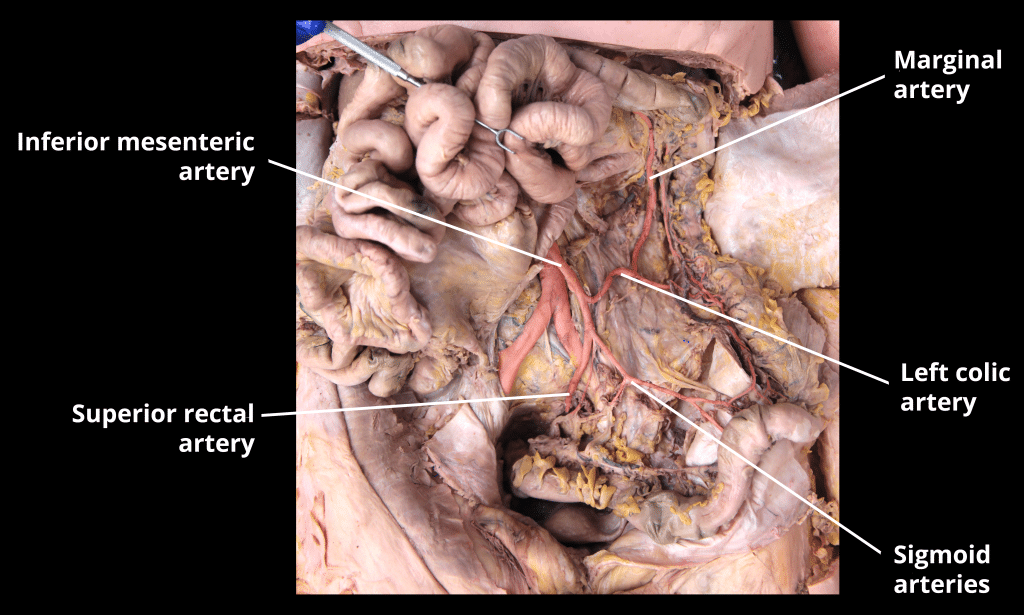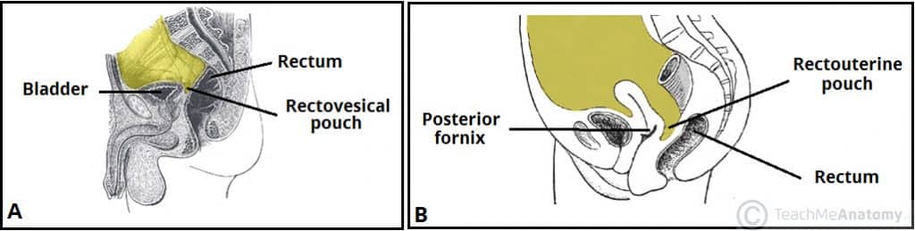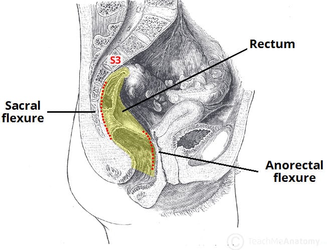 The rectum is the most distal segment of the large intestine, and has an important role as a temporary store of faeces. It is continuous proximally with the sigmoid colon, and terminates into the anal canal. In this article we will discuss the anatomy of the rectum – its structure, anatomical relationships, and clinical relevance. Pro Feature - 3D Model You've Discovered a Pro Feature Access our 3D Model Library Explore, cut, dissect, annotate and manipulate our 3D models to visualise anatomy in a dynamic, interactive way. Learn More Anatomical Structure The rectum begins at the level of the S3 (as a continuation of the sigmoid colon). It is macroscopically distinct from the colon, with an absence of taenia coli, haustra, and omental appendices. The course of the rectum is marked by two major flexures: Sacral flexure – anteroposterior curve with concavity anteriorly (follows the curve of the sacrum and coccyx). Anorectal flexure – anteroposterior curve with convexity anteriorly. This flexure is formed by the tone of the puborectalis muscle, and contributes significantly to faecal continence. There are additionally three lateral flexures (superior, intermediate and inferior), which are formed by transverse folds of the internal rectum wall. The final segment of the rectum, the ampulla, relaxes to accumulate and temporarily store faeces until defecation occurs. It is continuous with the anal canal; which passes through the pelvic floor to end as the anus. By TeachMeSeries Ltd (2025) Fig 1The sacral and anorectal flexures of the rectum. Peritoneal Coverings In the superior third of the rectum, the anterior surface and lateral sides are covered by peritoneum. The middle third only has an anterior peritoneal covering, and the lower 1/3 has no peritoneum associated with it. In males, the reflection of peritoneum from the rectum to the posterior bladder wall forms the rectovesical pouch. In females, the peritoneum reflects to the posterior vagina and cervix, forming the rectouterine pouch (pouch of Douglas). See more about the peritoneal cavity here. By TeachMeSeries Ltd (2025) Fig 2The peritoneal reflections of the rectum in males (A) and females (B). Pro Feature - Dissection Images Inferior mesenteric artery and major branches. Note the marginal artery, which forms an anastamostic network with the superior mesenteric artery. Inferior mesenteric artery and major branches. Note the marginal artery, which forms an anastamostic network with the superior mesenteric artery. You've Discovered a Pro Feature Access our Dissection Image Library Enhance your understanding with high-resolution dissection images showcasing real-life anatomy. Learn More Anatomical Relations The rectum is located within the pelvic cavity, and is the most posterior of the pelvic viscera. Its anatomical relations are different in men and women: Anterior Posterior Male Female Sacrum and coccyx Piriformis Coccygeus Levator ani Sacral plexus Rectovesical pouch Sigmoid colon Ileum Bladder Prostate Seminal vesicles Rectouterine pouch Sigmoid colon Ileum Vagina Cervix By TeachMeSeries Ltd (2025) Fig 3Sagittal section of the female pelvis, showing the anatomical position of the rectum. Neurovascular Supply The rectum receives arterial supply through three main arteries: Superior rectal artery – terminal continuation of the inferior mesenteric artery. Middle rectal artery – branch of the internal iliac artery. Inferior rectal artery – branch of the internal pudendal artery. Venous drainage is via the corresponding superior, middle and inferior rectal veins. The superior rectal vein empties into the portal venous system, whilst the middle and inferior rectal veins empty into the systemic venous system. Anastomoses between the portal and systemic veins are located in the wall of anal canal, making this a site of portocaval anastomosis. Note: the rectum is also closely anatomically associated with the rectal venous plexus; however this structure is more functionally related to the anal canal. Innervation The rectum receives sensory and autonomic innervation. Sympathetic nervous supply to the rectum is from the lumbar splanchnic nerves and superior and inferior hypogastric plexuses. Parasympathetic supply is from S2-4 via the pelvic splanchnic nerves and inferior hypogastric plexuses. Visceral afferent (sensory) fibres follow the parasympathetic supply. By TeachMeSeries Ltd (2025) Fig 4The superior rectal artery, supplying the upper aspect of the rectum. Lymphatic Drainage Lymphatic drainage of the rectum is via the pararectal lymph nodes, which drain into the inferior mesenteric nodes. Additionally, the lymph from the lower aspect of the rectum drains directly into the internal iliac lymph nodes. Clinical Relevance Digital Rectal Examination The anterior wall of the rectum has a number of close anatomical structures. These can therefore be palpated digitally via the rectum. Most significant are the prostate and seminal vesicles in males, and cervix in females. Bony structures, such as the sacrum and coccyx, may also be palpated in both sexes. For a guide on performing a digital rectal examination, visit our sister site TeachMeSurgery. By TeachMeSeries Ltd (2025) Fig 5Digital rectal examination of the prostate in males. Do you think you’re ready? Take the quiz below Pro Feature - Quiz The Rectum Question 1 of 3 Submitting... Skip Next Rate question: You scored 0% Skipped: 0/3 1800 More Questions Available Upgrade to TeachMeAnatomy Pro Challenge yourself with over 1800 multiple-choice questions to reinforce learning Learn More Rate This Article