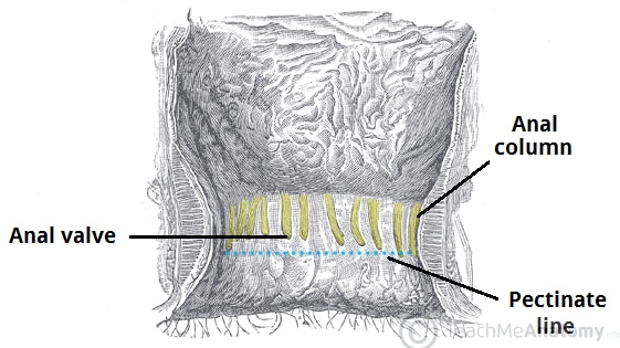 The anal canal is the final segment of the gastrointestinal tract. It has an important role in defecation and maintaining faecal continence. In this article, we shall look at the anatomy of the anal canal – its position, structure, relations and neurovascular supply. Pro Feature - 3D Model You've Discovered a Pro Feature Access our 3D Model Library Explore, cut, dissect, annotate and manipulate our 3D models to visualise anatomy in a dynamic, interactive way. Learn More Anatomical Position The anal canal is located within the anal triangle of the perineum between the right and left ischioanal fossae. It is the final segment of the gastrointestinal tract, around 4cm in length. The canal begins as a continuation of the rectum and passes inferoposteriorly to terminate at the anus. Anatomical Structure Except during defecation, the anal canal is collapsed by the internal and external anal sphincters to prevent the passage of faecal material. Anal Sphincters The anal canal is surrounded by internal and external anal sphincters, which play a crucial role in the maintenance of faecal continence: Internal anal sphincter – surrounds the upper 2/3 of the anal canal. It is formed from a thickening of the involuntary circular smooth muscle in the bowel wall. External anal sphincter – voluntary muscle that surrounds the lower 2/3 of the anal canal (and so overlaps with the internal sphincter). It blends superiorly with the puborectalis muscle of the pelvic floor. At the junction of the rectum and the anal canal, there is a muscular ring – known as the anorectal ring. It is formed by the fusion of the internal anal sphincter, external anal sphincter and puborectalis muscle, and is palpable on digital rectal examination. By TeachMeSeries Ltd (2025) Fig 1The Internal and external anal sphincters. Internal Structure The superior aspect of the anal canal has the same epithelial lining as the rectum (columnar epithelium). However, in the anal canal, the mucosa is organised into longitudinal folds, known as anal columns. These are joined at their inferior ends by anal valves. Above the anal valves are small pouches which are referred to as anal sinuses – these contain glands that secrete mucus. The anal valves collectively form an irregular circle – known as the pectinate line (or dentate line). This line divides the anal canal into upper and lower parts, which differ in both structure and neurovascular supply. This is a result of their different embryological origins: Above the pectinate line – derived from the embryonic hindgut. Below the pectinate line – derived from the ectoderm of the proctodeum. Inferior to the pectinate line, the anal canal is lined by non-keratinised stratified squamous epithelium (known as the anal pecten). It is a pale and smooth surface, which transitions at the level of the intersphincteric groove to true skin (keratinised stratified squamous). By TeachMeSeries Ltd (2025) Fig 2The anal columns, anal valves and pectinate line. Anatomical Relations The anal canal lies in close proximity to several other important structures in the pelvis and perineum: Anteriorly Posteriorly Laterally Male Female Anococcygeal ligament Coccyx and sacrum Ischioanal fossae Perineal body Urogenital diaphragm Urethra Bulb of the penis Perineal body Urogenital diaphragm Vagina Neurovascular Supply and Lymphatics As discussed above, the pectinate line divides the anal canal into two parts – which have a different arterial supply, venous drainage, innervation and lymphatic drainage. Modality Above Pectinate line Below Pectinate line Arterial Supply Superior rectal artery (branch of inferior mesenteric artery) Anastomosing branches from the middle rectal artery. Inferior rectal artery (branch of the internal pudendal artery) Anastomosing branches from the middle rectal artery. Venous Drainage Superior rectal vein, which empties into the inferior mesenteric vein (portal venous system). Inferior rectal vein, which empties into the internal pudendal vein (systemic venous system). Nerve Supply Visceral innervation via the inferior hypogastric plexus. Sensitive to stretch. Somatic innervation via the inferior rectal nerves (branches of the pudendal nerve) Sensitive to pain, temperature, touch and pressure. Lymphatics Internal iliac lymph nodes Superficial inguinal lymph nodes Clinical Relevance – Haemorrhoids Haemorrhoids are vascular cushions found within the anal canal of healthy individuals, which help with the maintenance faecal continence. If they become swollen and distended, they are referred to as pathological haemorrhoids. Pathological haemorrhoids are observed in people who suffer from constipation, prolonged straining when defecating, or raised intra-abdominal pressure (e.g pregnancy, ascites). Upon examination of the anal canal (with the patient in the lithotomy position), the haemorrhoids are typically located at the 3, 7 and 11 o’clock positions. They can cause bleeding and itchiness, and depending on the severity, can be managed conservatively or surgically. By Dr. K.-H. Günther [CC BY 3.0], via Wikimedia Commons Fig 3Haemorrhoids located in the 3, 7, and 11 o’clock positions Do you think you’re ready? Take the quiz below Pro Feature - Quiz The Anal Canal Question 1 of 3 Submitting... Skip Next Rate question: You scored 0% Skipped: 0/3 1800 More Questions Available Upgrade to TeachMeAnatomy Pro Challenge yourself with over 1800 multiple-choice questions to reinforce learning Learn More Rate This Article