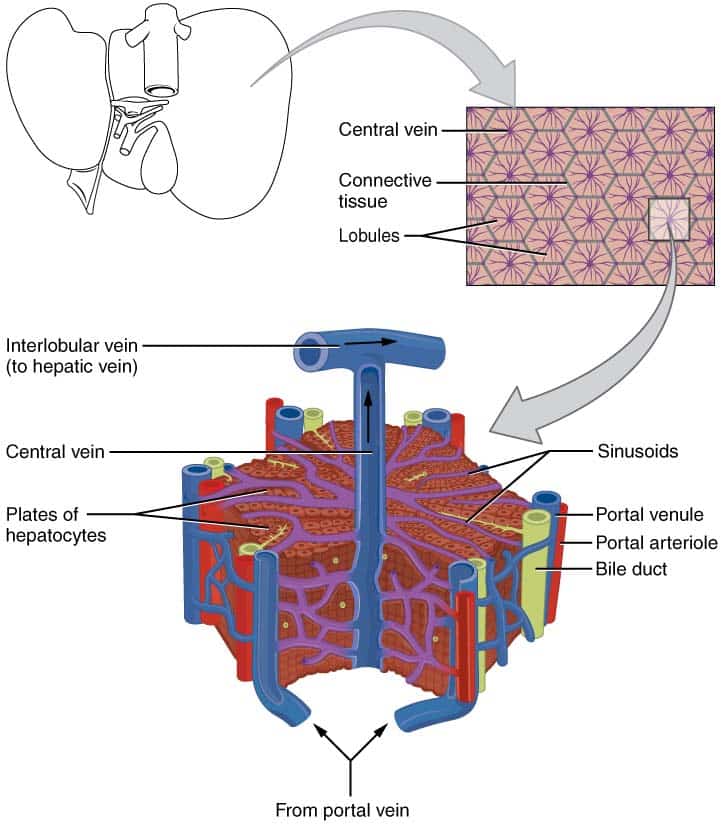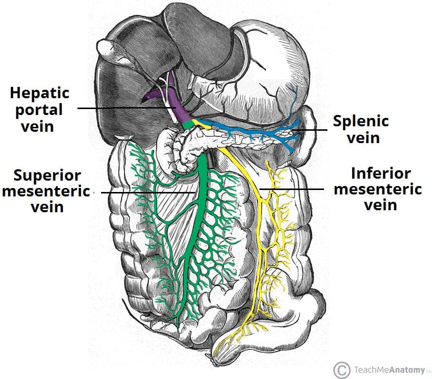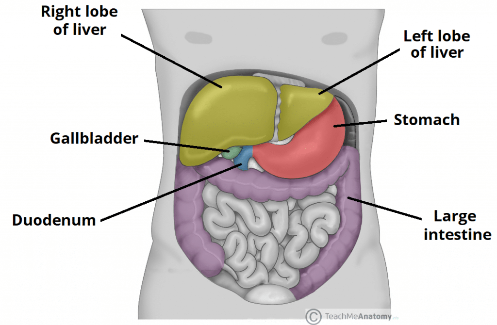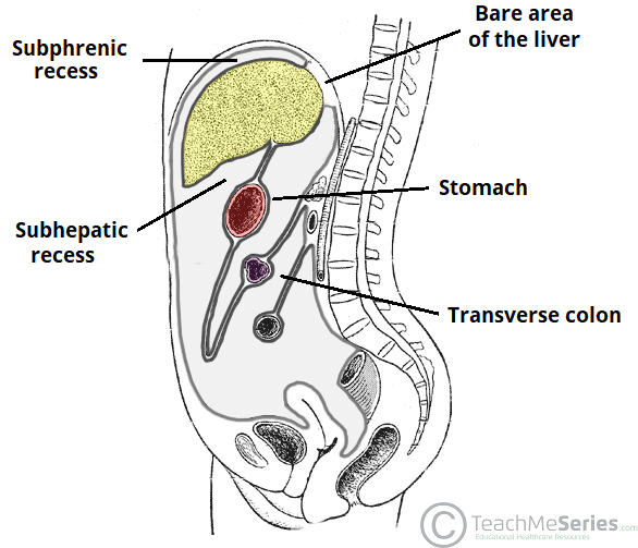 The liver is a peritoneal organ positioned in the right upper quadrant of the abdomen. It is the largest visceral structure in the abdominal cavity, and the largest gland in the human body. An accessory digestion gland, the liver performs a wide range of functions, such as synthesis of bile, glycogen storage and clotting factor production. In this article, we shall look at the anatomy of the liver – its position, structure, and neurovascular supply. Pro Feature - 3D Model You've Discovered a Pro Feature Access our 3D Model Library Explore, cut, dissect, annotate and manipulate our 3D models to visualise anatomy in a dynamic, interactive way. Learn More Anatomical Position The liver is predominantly located in the right hypochondrium and epigastric areas and extends into the left hypochondrium. When discussing the anatomical position of the liver, it is useful to consider its external surfaces, associated ligaments, and the anatomical spaces (recesses) that surround it. By TeachMeSeries Ltd (2025) Fig 1The liver lies in the right hypochondrium of the abdomen and is surrounded by numerous organs. Pro Feature - Dissection Images Prosection of the liver, stomach, transverse colon within the abdominal cavity. The small intestine and colon are covered by the greater omentum and are not visible in this specimen. Prosection of the liver, stomach, transverse colon within the abdominal cavity. The small intestine and colon are covered by the greater omentum and are not visible in this specimen. You've Discovered a Pro Feature Access our Dissection Image Library Enhance your understanding with high-resolution dissection images showcasing real-life anatomy. Learn More Liver Surfaces The external surfaces of the liver are described by their location and adjacent structures. There are two liver surfaces – the diaphragmatic and visceral: Diaphragmatic surface – the anterosuperior surface of the liver. It is smooth and convex, fitting snugly beneath the curvature of the diaphragm. The posterior aspect of the diaphragmatic surface is not covered by visceral peritoneum and is in direct contact with the diaphragm itself (known as the ‘bare area’ of the liver). Visceral surface – the posteroinferior surface of the liver. With the exception of the fossa of the gallbladder and porta hepatis, it is covered with peritoneum. It is moulded by the shape of the surrounding organs, making it irregular and flat. It lies in contact with the right kidney, right adrenal gland, right colic flexure, transverse colon, first part of the duodenum, gallbladder, oesophagus and the stomach. Ligaments of the Liver There are a number of ligaments that attach the liver to the surrounding structures. These are formed by a double layer of peritoneum. Falciform ligament – this sickle-shaped ligament attaches the anterior surface of the liver to the anterior abdominal wall. Its free edge contains the ligamentum teres, a remnant of the umbilical vein. Coronary ligament (anterior and posterior folds) – attaches the superior surface of the liver to the inferior surface of the diaphragm and demarcates the bare area of the liver. The anterior and posterior folds unite to form the triangular ligaments on the right and left lobes of the liver. Triangular ligaments (left and right): The left triangular ligament is formed by the union of the anterior and posterior layers of the coronary ligament at the apex of the liver and attaches the left lobe of the liver to the diaphragm. The right triangular ligament is formed in a similar fashion adjacent to the bare area and attaches the right lobe of the liver to the diaphragm. Lesser omentum – Attaches the liver to the lesser curvature of the stomach and first part of the duodenum. It consists of the hepatoduodenal ligament (extends from the duodenum to the liver) and the hepatogastric ligament (extends from the stomach to the liver). The hepatoduodenal ligament surrounds the portal triad. In addition to these supporting ligaments, the posterior surface of the liver is secured to the inferior vena cava by hepatic veins and fibrous tissue. By TeachMeSeries Ltd (2025) Fig 2Diaphragmatic surface of the liver, demonstrating the three main ligaments. The bare area of the liver lies between the anterior and posterior folds of the coronary ligament. Hepatic Recesses The hepatic recesses are anatomical spaces between the liver and surrounding structures. They are of clinical importance as infection may collect in these areas, forming an abscess. Subphrenic spaces – located between the diaphragm and the anterior and superior aspects of the liver. They are divided into a right and left by the falciform ligament. Subhepatic space – a subdivision of the supracolic compartment (above the transverse mesocolon), this peritoneal space is located between the inferior surface of the liver and the transverse colon. Morison’s pouch – a potential space between the visceral surface of the liver and the right kidney. This is the deepest part of the peritoneal cavity when supine (lying flat), therefore pathological abdominal fluid such as blood or ascites is most likely to collect in this region in a bedridden patient. By TeachMeSeries Ltd (2025) Fig 3The subphrenic and subhepatic recesses. Note the bare area of the liver. Anatomical Structure Macroscopic The liver is covered by a fibrous layer, known as Glisson’s capsule. It is comprised of a large right lobe and smaller left lobe. There are two further ‘accessory‘ lobes that arise from the right lobe, which are located on the visceral surface of liver: Caudate lobe – located on the upper aspect of the visceral surface. It lies between the inferior vena cava and a fossa produced by the ligamentum venosum (a remnant of the foetal ductus venosus). Quadrate lobe – located on the lower aspect of the visceral surface. It lies between the gallbladder and a fossa produced by the ligamentum teres (a remnant of the fetal umbilical vein). Separati