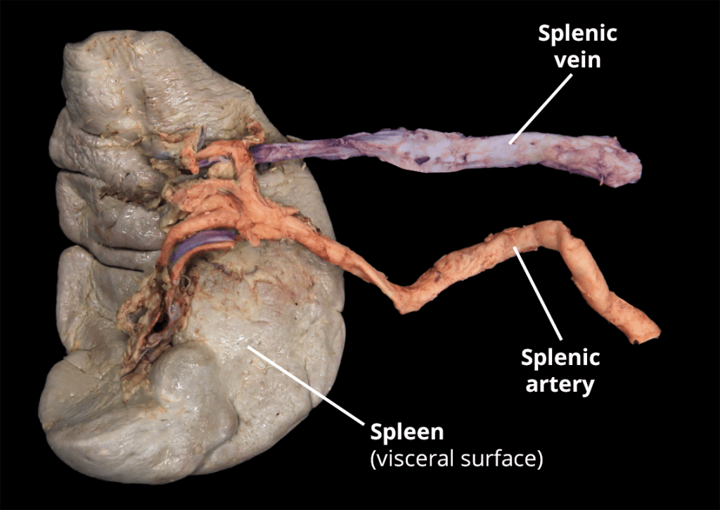 The spleen is an organ located in the upper left abdomen, and is roughly the size of a clenched fist. In the adult, the spleen functions mainly as a blood filter, removing old red blood cells. It also plays a role in both cell-mediated and humoral immune responses. In this article, we shall look at the anatomy of the spleen – its anatomical position, structure and vasculature. By TeachMeSeries Ltd (2025) Fig 1The anatomical position of the spleen in the abdomen. Pro Feature - 3D Model You've Discovered a Pro Feature Access our 3D Model Library Explore, cut, dissect, annotate and manipulate our 3D models to visualise anatomy in a dynamic, interactive way. Learn More Anatomical Position The spleen is located in the upper left quadrant of the abdomen, under cover of the diaphragm and the ribcage – and therefore cannot normally be palpated on clinical examination (except when enlarged). It is an intraperitoneal organ, entirely surrounded by peritoneum (except at the splenic hilum). The spleen is connected to the stomach and kidney by parts of the greater omentum – a double fold of peritoneum that originates from the stomach: Gastrosplenic ligament – anterior to the splenic hilum, connects the spleen to the greater curvature of the stomach. Splenorenal ligament – posterior to the splenic hilum, connects the hilum of the spleen to the left kidney. The splenic vessels and tail of the pancreas lie within this ligament Between these two ligaments is the lesser sac. By TeachMeSeries Ltd (2025) Fig 2The ligaments of the spleen. Note how the splenic vessels run within the splenorenal ligament. Pro Feature - Dissection Images Dissection of the visceral surface of the spleen. Note how the splenic artery divides into five branches - – each supplying vascular segment of the spleen, Dissection of the visceral surface of the spleen. Note how the splenic artery divides into five branches - – each supplying vascular segment of the spleen, You've Discovered a Pro Feature Access our Dissection Image Library Enhance your understanding with high-resolution dissection images showcasing real-life anatomy. Learn More Structure The spleen has a slightly oval shape. It is covered by a weak capsule that protects the organ whilst allowing it to expand in size. The outer surface of the spleen can be anatomically divided into two: Diaphragmatic surface – in contact with diaphragm and ribcage. Visceral surface – in contact with the other abdominal viscera. It has anterior, superior, posteromedial and inferior borders. The posteromedial and inferior borders are smooth, whilst the anterior and superior borders contain notches. In enlargement of the spleen (known as splenomegaly), the superior border moves inferomedially, and its notches can be palpated. Anatomical Relations It lies in close proximity to other structures in the abdomen: Anterior Posterior Inferior Medial Stomach Diaphragm Left lung Ribs 9-11 Left colic flexure (splenic flexure) Left kidney Tail of the pancreas Vasculature The spleen is a highly vascular organ. It receives most of its arterial supply from the splenic artery. This vessel arises from the coeliac trunk, running laterally along the superior aspect of the pancreas, within the splenorenal ligament. As the artery reaches the spleen, it branches into five vessels – each supplying a different part of the organ. These arterial branches do not anastomose with each other – giving rise to vascular segments of the spleen. This enables a surgeon to remove one of these segments without affecting the others (a procedure known as a subtotal splenectomy). Venous drainage occurs through the splenic vein. It combines with the superior mesenteric vein to form the hepatic portal vein. By TeachMeSeries Ltd (2025) Fig 3An overview of the venous portal system – draining into the hepatic portal vein. Innervation The nerve supply to the spleen is from the coeliac plexus. Lymphatics The lymphatic vessels of the spleen follow the splenic vessels mentioned above and drain into the pancreaticosplenic lymph nodes, and ultimately the coeliac nodes. Clinical Relevance Rupture of the Spleen The spleen is the abdominal organ with the highest incidence of injury. A splenic rupture occurs when there is a break in its fibroelastic capsule, disrupting the underlying parenchyma. Rupture is caused by blunt or penetrating trauma. It is often associated with left rib fractures, with a bony fragment easily tearing the capsule. As the spleen is a highly vascular organ, its rupture results in profuse bleeding into the peritoneal cavity. Splenectomy is indicated where injury to the spleen and subsequent haemorrhage are life threatening. This may be done as a sub-total (partial) splenectomy – recall that there are no arterial anastomoses in the spleen – or as a total splenectomy. The liver and bone marrow take over some of the functions of the spleen, however, an individual who has no spleen is more susceptible to some bacterial infections and as such, requires life long antibiotics. Further indications for splenectomy include haematological conditions such as haemolytic anaemia, idiopathic thrombocytopenic purpura, thrombotic thrombocytopenic purpura, hypersplenism and prolieferative disorders such as myelofibrosis of lymphoma. By Hellerhoff [CC-BY-SA-3.0], via Wikimedia Commons Fig 4CT scan of a ruptured spleen. Do you think you’re ready? Take the quiz below Pro Feature - Quiz The Spleen Question 1 of 3 Submitting... Skip Next Rate question: You scored 0% Skipped: 0/3 1800 More Questions Available Upgrade to TeachMeAnatomy Pro Challenge yourself with over 1800 multiple-choice questions to reinforce learning Learn More Rate This Article