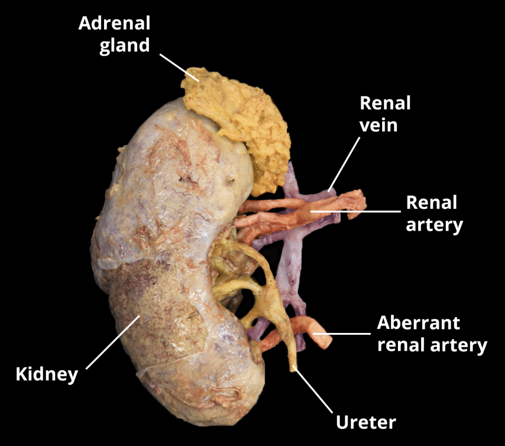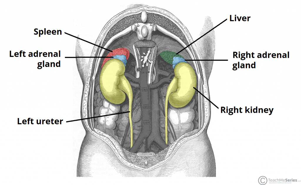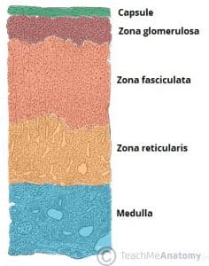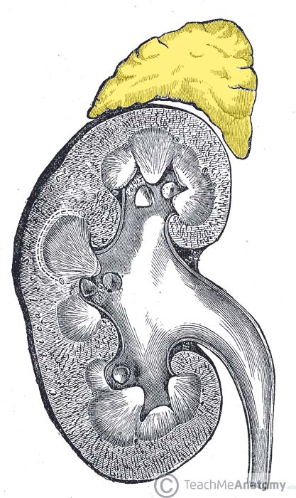 The adrenal (or suprarenal) glands are paired endocrine glands situated over the medial aspect of the upper poles of each kidney. They secrete steroid and catecholamine hormones directly into the blood. In this article, we shall look at the anatomy of the adrenal glands – their location, structure and vascular supply. By TeachMeSeries Ltd (2025) Fig 1The right adrenal gland, situated over the medial aspect of the upper pole of the right kidney. Pro Feature - 3D Model You've Discovered a Pro Feature Access our 3D Model Library Explore, cut, dissect, annotate and manipulate our 3D models to visualise anatomy in a dynamic, interactive way. Learn More Anatomical Location and Relations The adrenal glands are located in the posterior abdomen, between the superomedial kidney and the diaphragm. They are retroperitoneal structures, with parietal peritoneum covering their anterior surface only. The right gland is pyramidal in shape, contrasting with the semi-lunar shape of the left gland. Perinephric (or renal) fascia encloses the adrenal glands and the kidneys. This fascia attaches the glands to the crura of the diaphragm. They are separated from the kidneys by a small amount of fibrous tissue. The adrenal glands sit in close proximity to many other structures in the abdomen: Right adrenal gland Left adrenal gland Anterior Posterior Anterior Posterior Inferior vena cava Right lobe of the liver Right crus of the diaphragm Stomach Pancreas Spleen Left crus of the diaphragm By TeachMeSeries Ltd (2025) Fig 2Posterior view of the abdomen, demonstrating the anatomical relations of the adrenal glands. Pro Feature - Dissection Images Dissected kidney and associated adrenal gland, posterior view. Note the prescence of an aberrant renal artery. Dissected kidney and associated adrenal gland, posterior view. Note the prescence of an aberrant renal artery. You've Discovered a Pro Feature Access our Dissection Image Library Enhance your understanding with high-resolution dissection images showcasing real-life anatomy. Learn More Anatomical Structure The adrenal glands consist of an outer connective tissue capsule, a cortex and a medulla. Veins and lymphatics leave each gland via the hilum, but arteries and nerves enter the glands at numerous sites. The outer cortex and inner medulla are the functional portions of the gland. They are two separate endocrine glands, with different embryological origins: Cortex – derived from the embryonic mesoderm. Medulla – derived from the ectodermal neural crest cells. The cortex and medulla synthesise different hormones. Cortex The cortex is yellowish in colour. It secretes two cholesterol derived hormones – corticosteroids and androgens. Functionally, the cortex can be divided into three regions (superficial to deep): Zona glomerulosa – produces and secretes mineralocorticoids such as aldosterone. Zona fasciculata – produces and secretes corticosteroids such as cortisol. It also secretes a small amount of androgens. Zona reticularis – produces and secretes androgens such as dehydroepiandrosterone (DHES). It also secretes a small amount of corticosteroids. By TeachMeSeries Ltd (2025) Fig 3Histological appearance of the cortex and medulla of the adrenal gland. Medulla The medulla lies in the centre of the gland, and is dark brown in colour. It contains chromaffin cells, which secrete catecholamines (such as adrenaline) into the bloodstream in response to stress. These hormones produce a ‘flight-or-fight‘ response. Chromaffin cells also secrete enkephalins which function in pain control. Vasculature The adrenal glands have a rich blood supply via three main arteries: Superior adrenal artery – arises from the inferior phrenic artery Middle adrenal artery – arises from the abdominal aorta. Inferior adrenal artery – arises from the renal arteries. Right and left adrenal veins drain the glands. The right adrenal vein drains into the inferior vena cava, whereas the left adrenal vein drains into the left renal vein. Innervation The adrenal glands are innervated by the coeliac plexus and greater splanchnic nerves. Sympathetic innervation to the adrenal medulla is via myelinated pre-synaptic fibres, mainly from the T10 to L1 spinal cord segments. Lymphatics Lymph drainage is to the lumbar lymph nodes by adrenal lymphatic vessels. These vessels originate from two lymphatic plexuses – one deep to the capsule, and the other in the medulla. Clinical Relevance Pheochromocytoma A pheochromocytoma is a tumour of the adrenal medulla or preganglionic sympathetic neurones. It secretes adrenaline and noradrenaline uncontrollably, causing blood pressure to greatly increase. Patients may present with palpitations, headaches and diaphoresis (profuse sweating). Phenoxybenzamine, a competitive, irreversible antagonist of adrenaline, can be used in treatment to reduce blood pressure by binding to adrenaline receptors, making less available for adrenaline to act upon. By TeachMeSeries Ltd (2025) Fig 4CT scan of a pheochromocytoma. Do you think you’re ready? Take the quiz below Pro Feature - Quiz The Adrenal Glands Question 1 of 3 Submitting... Skip Next Rate question: You scored 0% Skipped: 0/3 1800 More Questions Available Upgrade to TeachMeAnatomy Pro Challenge yourself with over 1800 multiple-choice questions to reinforce learning Learn More Rate This Article