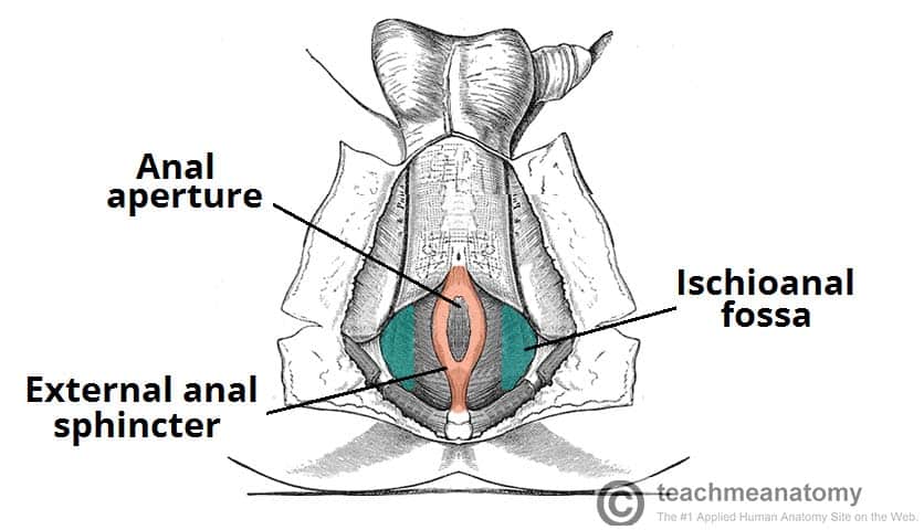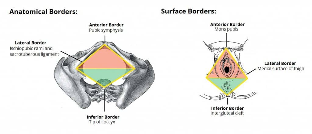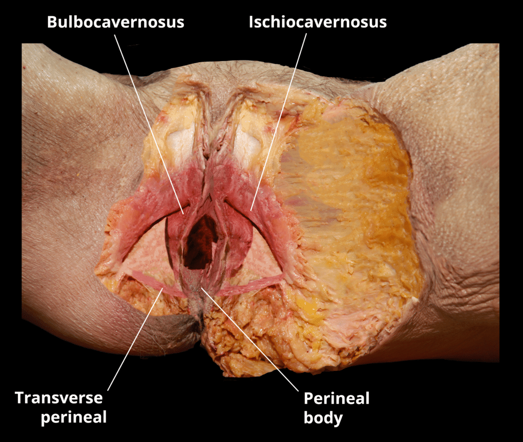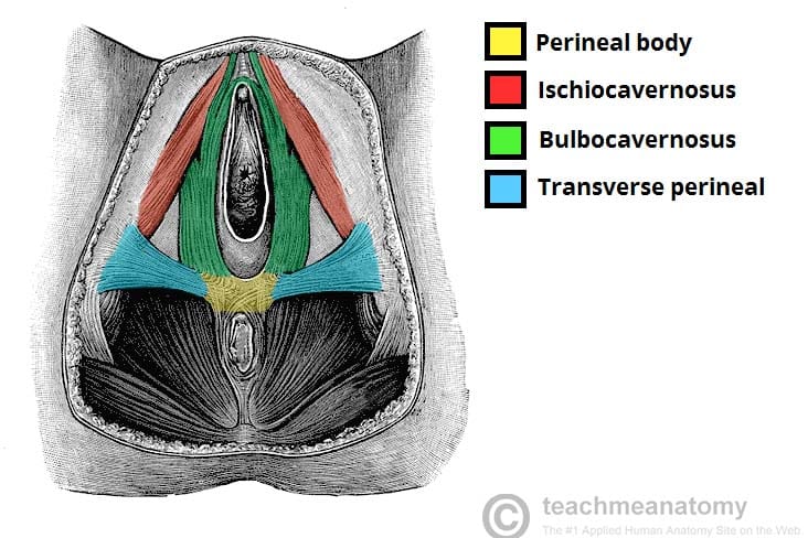The perineum is an anatomical region in the pelvis. It is located between the thighs, and represents the most inferior part of the pelvic outlet. The perineum is separated from the pelvic cavity superiorly by the pelvic floor. This region contains structures that support the urogenital and gastrointestinal systems – and it therefore plays an important role in functions as such micturition, defecation, sexual intercourse and childbirth. In this article, we shall look at the anatomy of the perineum – its boundaries, contents, and clinical correlations. By TeachMeSeries Ltd (2025) Fig 1The perineum is located between the thighs. Pro Feature - 3D Model You've Discovered a Pro Feature Access our 3D Model Library Explore, cut, dissect, annotate and manipulate our 3D models to visualise anatomy in a dynamic, interactive way. Learn More Boundaries In clinical practice, the term “perineum” is frequently used to describe the area between the external genitalia and the anus. However, in anatomical terms, the perineum is a diamond-shaped structure. There are two main ways in which the boundaries of the perineum can be described. The anatomical borders refer to its exact bony margins, whilst the surface borders describe the surface anatomy of the perineum. Anatomical Borders The anatomical borders of the perineum are: Anterior – pubic symphysis. Posterior – tip of the coccyx. Laterally – inferior pubic rami and inferior ischial rami, and the sacrotuberous ligament. Roof – pelvic floor. Base – skin and fascia. The perineum can be subdivided by a theoretical line drawn transversely between the ischial tuberosities. This split forms the anterior urogenital triangle and the posterior anal triangle. These triangles are associated with different components of the perineum. Surface Borders The surface boundaries are best shown when the lower limbs are abducted, and a diamond shape is depicted: Anterior – mons pubis in females, base of the penis in males. Laterally – medial surfaces of the thighs. Posterior – superior end of the intergluteal cleft. By TeachMeSeries Ltd (2025) Fig 2Anatomical and surface borders of the perineum. Pro Feature - Dissection Images Muscles of the female perineum Muscles of the female perineum You've Discovered a Pro Feature Access our Dissection Image Library Enhance your understanding with high-resolution dissection images showcasing real-life anatomy. Learn More Contents The perineum can be subdivided by a theoretical line drawn transversely between the ischial tuberosities. This split forms the anterior urogenital and posterior anal triangles. These triangles are associated with different components of the perineum – which we shall now examine in more detail. Anal Triangle The anal triangle is the posterior half of the perineum. It is bounded by the coccyx, sacrotuberous ligaments, and a theoretical line between the ischial tuberosities. The main contents of the anal triangle are: Anal aperture – the opening of the anus. External anal sphincter muscle – voluntary muscle responsible for opening and closing the anus. Ischioanal fossae (x2) – spaces located laterally to the anus. The anal aperture is located centrally in the triangle with the ischioanal fossae either side. These fossae contain fat and connective tissue, which allow for expansion of the anal canal during defecation. They extend from the skin of the anal region (inferiorly) to the pelvic diaphragm (superiorly). Another important anatomical structure within the anal triangle is the pudendal nerve, which supplies the whole perineum with somatic fibres. By TeachMeSeries Ltd (2025) Fig 3Contents of the anal triangle. Urogenital Triangle The urogenital triangle is the anterior half of the perineum. It is bounded by the pubic symphysis, ischiopubic rami, and a theorectical line between the two ischial tuberosities. The triangle is associated with the structures of the urogenital system – the external genitalia and urethra. Structurally, the urogenital triangle is complex, with a number of fascial layers and pouches. Unlike the anal triangle, the urogenital triangle has an additional layer of strong deep fascia; the perineal membrane. This membrane has pouches on its superior and inferior surfaces. The layers of the urogenital triangle (deep to superficial): Deep perineal pouch – a potential space between the deep fascia of the pelvic floor (superiorly) and the perineal membrane (inferiorly). It contains part of the urethra, external urethral sphincter, and the vagina in the female. In males, it also contains the bulbourethral glands and the deep transverse perineal muscles. Perineal membrane – a layer of tough fascia, which is perforated by the urethra (and the vagina in the female). The role of the membrane is to provide attachment for the muscles of the external genitalia. Superficial perineal pouch – a potential space between the perineal membrane (superiorly) and the superficial perineal fascia (inferiorly). It contains the erectile tissues that form the penis and clitoris, and three muscles – the ischiocavernosus, bulbospongiosus and superficial transverse perineal muscles. The greater vestibular glands (Bartholin’s glands) are also located in the superficial perineal pouch. The pouch is bounded posteriorly to the perineal body. Perineal fascia – a continuity of the abdominal fascia that has two components: Deep fascia: covers the superficial perineal muscles and protruding structures (e.g. penis & clitoris). Superficial fascia is composed of a further two layers of fascia: Superficial layer – continuous with Camper’s fascia of the anterior abdominal wall Deep layer (Colles’ fascia) – continuous with Scarpa’s fascia of the anterior abdominal wall Skin – The urethral and vaginal orifices open out onto the skin. By TeachMeSeries Ltd (2025) Fig 4Coronal section of the male pelvis, showing the layers of the urogenital triangle. The Perineal Body The perineal body 