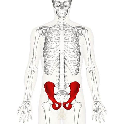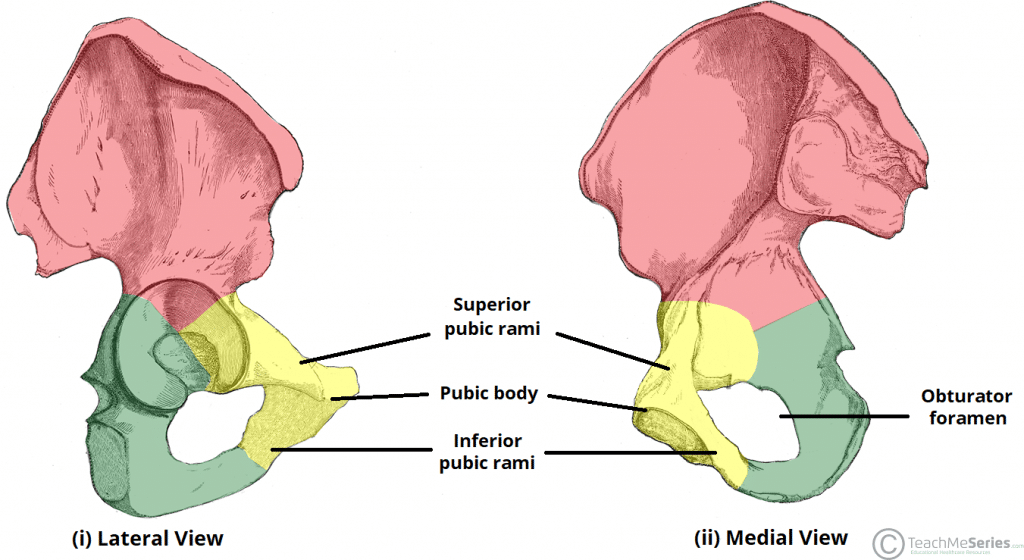 The left and right hip bones (innominate bones, pelvic bones) are two irregularly shaped bones that form part of the pelvic girdle – the bony structure that attaches the axial skeleton to the lower limbs. The hip bones have three main articulations: Sacroiliac joint – articulation with the sacrum. Pubic symphysis – articulation between the left and right hip bones. Hip joint – articulation with the head of femur. In this article, we shall look at the anatomy of the hip bones – their composition, bony landmarks, and clinical relevance. By Anatomography [CC-BY-SA-2.1-jp], via Wikimedia Commons Fig 1Overview of the anatomical position of the hip bones. Pro Feature - 3D Model You've Discovered a Pro Feature Access our 3D Model Library Explore, cut, dissect, annotate and manipulate our 3D models to visualise anatomy in a dynamic, interactive way. Learn More Composition of the Hip Bone The hip bone is comprised of the three parts; the ilium, pubis and ischium. Prior to puberty, the triradiate cartilage separates these parts – and fusion only begins at the age of 15-17. Together, the ilium, pubis and ischium form a cup-shaped socket known as the acetabulum (literal meaning in Latin is ‘vinegar cup‘). The head of the femur articulates with the acetabulum to form the hip joint. We shall now look at the individual parts of the hip bone, and their respective bony landmarks. By TeachMeSeries Ltd (2025) Fig 2The hip bone of a 5 year old, with triradiate cartilage still present. The Ilium The ilium is the widest and largest of the three parts of the hip bone, and is located superiorly. The body of the ilium forms the superior part of the acetabulum (acetabular roof). Immediately above the acetabulum, the ilium expands to form the wing (or ala). The wing of the ilium has two surfaces: Inner surface – has a concave shape, which produces the iliac fossa (site of origin of the iliacus muscle). External surface (gluteal surface) – has a convex shape and provides attachments to the gluteal muscles. The superior margin of the wing is thickened, forming the iliac crest. It extends from the anterior superior iliac spine (ASIS) to the posterior superior iliac spine (PSIS). On the posterior aspect of the ilium there is an indentation known as the greater sciatic notch. By TeachMeSeries Ltd (2025) Fig 3The bony landmarks of the ilium. Clinical Relevance Anterior Superior Iliac Spine The anterior superior iliac spine (ASIS) is an important anatomical landmark: Mid-inguinal point – halfway between the ASIS and the centre of the pubic symphysis. The femoral artery can be palpated here. Mid-point of the inguinal ligament – halfway between the ASIS and the pubic tubercle. In clinical practice, a patient’s “true” leg length is measured from the ASIS to the medial malleolus at the ankle joint. This is distinct from “apparent” leg length, which is measured from the umbilicus to the medial malleolus. True leg length discrepancy is a feature of various hip disorders, as well as being a potential complication of hip joint replacement (arthroplasty). The Pubis The pubis is the most anterior portion of the hip bone. It consists of a body, superior ramus and inferior ramus (ramus = branch). Pubic body – located medially, it articulates with the opposite pubic body at the pubic symphysis. Its superior aspect is marked by a rounded thickening (the pubic crest), which extends laterally as the pubic tubercle. Superior pubic ramus – extends laterally from the body to form part of the acetabulum. Inferior pubic ramus – projects towards the ischium. Together, the superior and inferior rami enclose part of the obturator foramen – through which the obturator nerve, artery and vein pass through to reach the lower limb. By TeachMeSeries Ltd (2025) Fig 4Bony landmarks of the pubis. By TeachMeSeries Ltd (2025) Fig 5The orientation of the hip bones within the pelvis. Clinical Relevance Pubic Rami Fractures Pubic rami fractures can sometimes be observed on x-rays in elderly patients who are investigated after simple low energy falls from standing height. In this context and provided they are the only injury a patient has sustained, these fractures are usually treated without surgery. Healing can be expected within 6-8 weeks and patients are encouraged to fully weight bear straightaway. The Ischium The ischium forms the posteroinferior part of the hip bone. Much like the pubis, it is composed of a body, an inferior ramus and superior ramus. The inferior ischial ramus combines with the inferior pubic ramus forming the ischiopubic ramus, which encloses part of the obturator foramen. The posterorinferior aspect of the ischium forms the ischial tuberosities and when sitting, it is these tuberosities on which our body weight falls. Near the junction of the superior ramus and body is a posteromedial projection of bone; the ischial spine. Two important ligaments attach to the ischium: Sacrospinous ligament – runs from the ischial spine to the sacrum, thus creating the greater sciatic foramen through which lower limb neurovasculature (including the sciatic nerve) transcends. Sacrotuberous ligament – runs from the sacrum to the ischial tuberosity, forming the lesser sciatic foramen. Read more about the greater and lesser sciatic foramen here. By TeachMeSeries Ltd (2025) Fig 6Bony landmarks of the ischium. Clinical Relevance Pelvic Fractures There are two broad groups of pelvic fractures: Low energy injuries: For example, a simple fall from standing height in an osteoporotic patient resulting in pubic rami fracture. These are usually ‘stable’ injuries, not requiring surgery. High energy injuries with direct or transmitted trauma: For example, after a high speed road traffic accident. These result in more extensive fractures which may include the acetabulum and sacroiliac joint. These can be ‘unstable’ injuries and may require urgent surgery. Higher energy injuries can be associated with soft tissue 