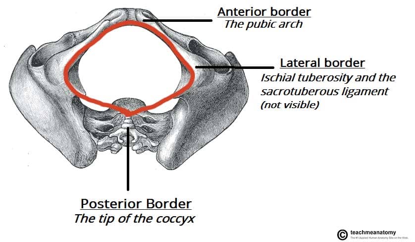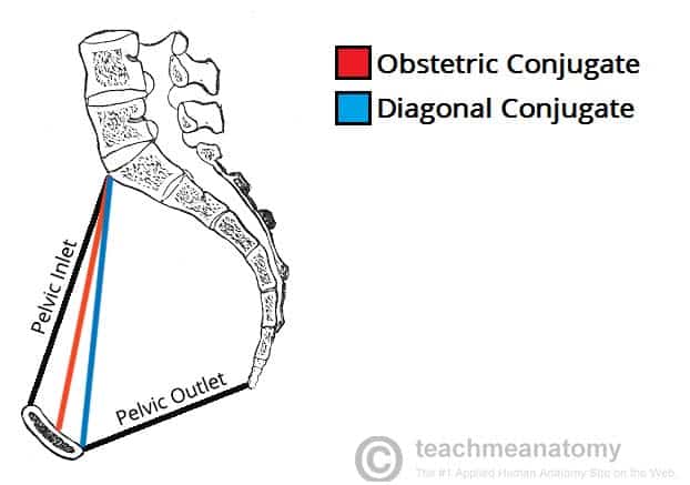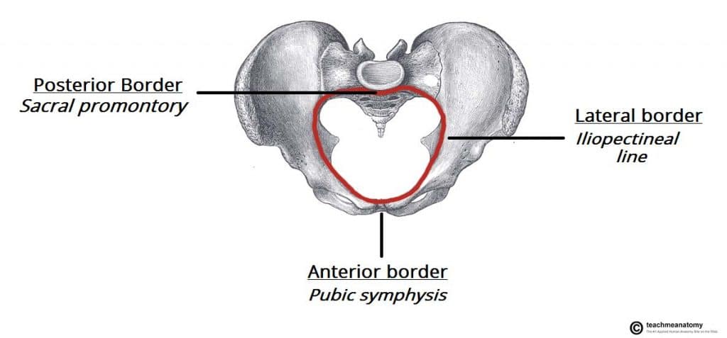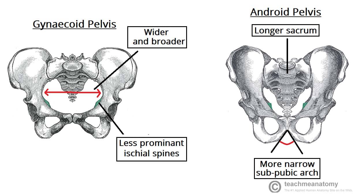 The pelvic girdle is a ring-like bony structure, located in the lower part of the trunk. It connects the axial skeleton to the lower limbs. In this article, we shall look at the anatomy of the pelvic girdle – its bony landmarks, functions, and its clinical relevance. Pro Feature - 3D Model You've Discovered a Pro Feature Access our 3D Model Library Explore, cut, dissect, annotate and manipulate our 3D models to visualise anatomy in a dynamic, interactive way. Learn More Structure of the Pelvic Girdle The bony pelvis consists of the two hip bones (also known as innominate or pelvic bones), the sacrum and the coccyx. There are four articulations within the pelvis: Sacroiliac joints (x2) – between the ilium of the hip bones, and the sacrum Sacrococcygeal symphysis – between the sacrum and the coccyx. Pubic symphysis – between the pubis bodies of the two hip bones. Ligaments attach the lateral border of the sacrum to various bony landmarks on the bony pelvis to aid stability. By TeachMeSeries Ltd (2025) Fig 1The pelvic girdle is formed by the hip bones, sacrum and coccyx. Functions of the Pelvis The strong and rigid pelvis is adapted to serve a number of roles in the human body. The main functions being: Transfer of weight from the upper axial skeleton to the lower appendicular components of the skeleton, especially during movement. Provides attachment for a number of muscles and ligaments used in locomotion. Contains and protects the abdominopelvic and pelvic viscera. The Greater and Lesser Pelvis The osteology of the pelvic girdle allows the pelvic region to be divided into two: Greater pelvis (false pelvis) – located superiorly, it provides support of the lower abdominal viscera (such as the ileum and sigmoid colon). It has little obstetric relevance. Lesser pelvis (true pelvis) – located inferiorly. Within the lesser pelvis reside the pelvic cavity and pelvic viscera. The junction between the greater and lesser pelvis is known as the pelvic inlet. The outer bony edges of the pelvic inlet are called the pelvic brim. By TeachMeSeries Ltd (2025) Fig 2The greater and lesser pelvis. The lesser pelvis is the ‘true’ pelvis and contains the pelvic cavity. Pelvic Inlet The pelvic inlet marks the boundary between the greater pelvis and lesser pelvis. Its size is defined by its edge, the pelvic brim. The borders of the pelvic inlet: Posterior – sacral promontory (the superior portion of the sacrum) and sacral wings (ala). Lateral – arcuate line on the inner surface of the ilium, and the pectineal line on the superior pubic ramus. Anterior – pubic symphysis. The pelvic inlet determines the size and shape of the birth canal, with the prominent ridges a key site for attachment of muscle and ligaments. Some alternative descriptive terminology can be used in describing the pelvic inlet: Linea terminalis – the combined pectineal line, arcuate line and sacral promontory. Iliopectineal line – the combined arcuate and pectineal lines. This represents the lateral border of the pelvic inlet. By TeachMeSeries Ltd (2025) Fig 3Looking down onto the pelvis, the borders of the pelvic brim. Pelvic Outlet The pelvic outlet is located at the end of the lesser pelvis, and the beginning of the pelvic wall. Its borders are: Posterior: The tip of the coccyx Lateral: The ischial tuberosities and the inferior margin of the sacrotuberous ligament Anterior: The pubic arch (the inferior border of the ischiopubic rami). The angle beneath the pubic arch is known as the sub-pubic angle and is of a greater size in women. By TeachMeSeries Ltd (2025) Fig 4The borders of the pelvic outlet. Adaptation for Childbirth The majority of women have a gynaecoid pelvis, as opposed to the male android pelvis. The slight differences in their structures creates a greater pelvic outlet, adapted to aid the process of childbirth. When comparing the two, the gynaecoid pelvis has: A wider and broader structure yet it is lighter in weight An oval-shaped inlet compared with the heart-shaped android pelvis. Less prominent ischial spines, allowing for a greater bispinous diameter A greater angled sub-pubic arch, more than 80-90 degrees. A sacrum which is shorter, more curved and with a less pronounced sacral promontory. In addition to the bony adaptations, the sacrotuberous and sacrospinous ligaments can stretch under the influence of progesterone and increase the size of the outlet further. By TeachMeSeries Ltd (2025) Fig 5Gynaecoid pelvis vs the android pelvis. Clinical Relevance: Assessment of the Female Bony Pelvis The lesser pelvis is the bony canal through which the fetus has to pass during childbirth. It is therefore of great importance to determine the diameter of this canal and therefore the childbearing capacity of the mother. The diameter can be determined by a pelvic examination or radiographically. There are two measurements that are of importance: Obstetric Conjugate In order to determine the narrowest fixed distance that the fetus would have to negotiate, the minimum antero-posterior diameter of the pelvic inlet is measured. This distance is between the sacral promontory and the midpoint of the pubic symphysis (where the pubic bone is thickest) and is known as the obstetric conjugate (or true conjugate). However, this measurement cannot be assessed clinically, due to the presence of the bladder. Diagonal Conjugate The diagonal conjugate is the alternative, measuring from the inferior border of the pubic symphysis to the sacral promontory and can be measured manually via the vagina. (To do this you use the tip of your middle finger to measure the sacral promontory and then using the other hand to mark the level of the inferior margin of the pubic symphysis on the examining hand. You then use the distance between the index finger and the pubic symphysis to measure the diagonal conjugate, ideally 11cm or greater) In addition to measuring the diagonal conjugate, a mid-pelvis check is carried out. Here, the clinician 