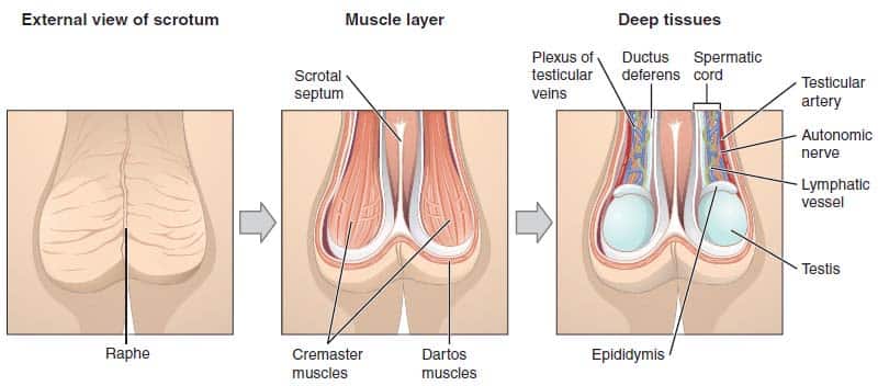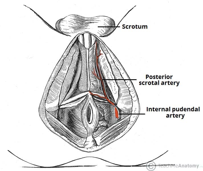 The scrotum is a fibromuscular cutaneous sac, located between the penis and anus. It is dual-chambered, forming an expansion of the perineum. Embryologically, the scrotum is derived from the paired genital swellings. During development, the genital swellings fuse in the midline – in the adult this fusion is marked by the scrotal raphe. The scrotum is biologically homologous to the labia majora. In this article, we shall look at the anatomy of the scrotum – its contents, blood supply and innervation. Pro Feature - 3D Model You've Discovered a Pro Feature Access our 3D Model Library Explore, cut, dissect, annotate and manipulate our 3D models to visualise anatomy in a dynamic, interactive way. Learn More Contents The scrotum contains three major (paired) structures: Testis – the site of sperm production. Epididymis – situated at the head of each testicle. It functions as a storage reservoir for sperm. Spermatic cord – a collection of muscle fibres, vessels, nerves and ducts that run to and from the testes. There are also muscle fibres located within the scrotum. The dartos muscle is a sheet of smooth muscle, situated immediately underneath the skin. It acts to help regulate the temperature of the scrotum, by wrinkling the skin – this decreases surface area, reducing heat loss. By OpenStax College [CC BY 3.0], via Wikimedia Commons Fig 1The scrotum, muscle layer and contents. Neurovascular Supply The scrotum receives neurovascular supply from the nearby vessels and nerves. This is in contrast to the testes – which carry their vessels, nerves and lymph drainage from the abdomen during their development. Blood Supply The scrotum receives arterial supply from the anterior and posterior scrotal arteries. The anterior scrotal artery arises from the external pudendal artery, while the posterior is derived from the internal pudendal artery. The scrotal veins follow the major arteries, draining into the external pudendal veins. Innervation The cutaneous innervation to the scrotum is supplied via several nerves, according to the topography: Anterior and anterolateral aspect – Anterior scrotal nerves derived from the genital branch of genitofemoral nerve and ilioinguinal nerve Posterior aspect – Posterior scrotal nerves derived from the perineal branches of the pudendal nerve and posterior femoral cutaneous nerve. By TeachMeSeries Ltd (2025) Fig 2The origin of the posterior scrotal artery. Lymphatics The lymphatic fluid from the scrotum drains to the nearby superficial inguinal nodes. Clinical Relevance Haematoma of the Scrotum A haematoma may develop in the scrotum as a result of scrotal surgery or trauma in the genital region (Figure 3). This results in swelling (oedema) and discolouration of the scrotal skin. Occasionally the origin of bleeding may not arise from the scrotal contents (i.e. spermatic cord and testis) but from the basal part of the penile urethra (the bulbar urethra) as in “straddle injuries” – direct perineal trauma like when falling onto a bicycle crossbar. Kostis Gyftopoulos MD, PhD Fig 3A scrotal haematoma. Do you think you’re ready? Take the quiz below Pro Feature - Quiz The Scrotum Question 1 of 3 Submitting... Skip Next Rate question: You scored 0% Skipped: 0/3 1800 More Questions Available Upgrade to TeachMeAnatomy Pro Challenge yourself with over 1800 multiple-choice questions to reinforce learning Learn More Rate This Article