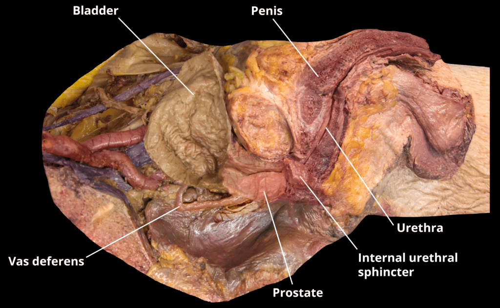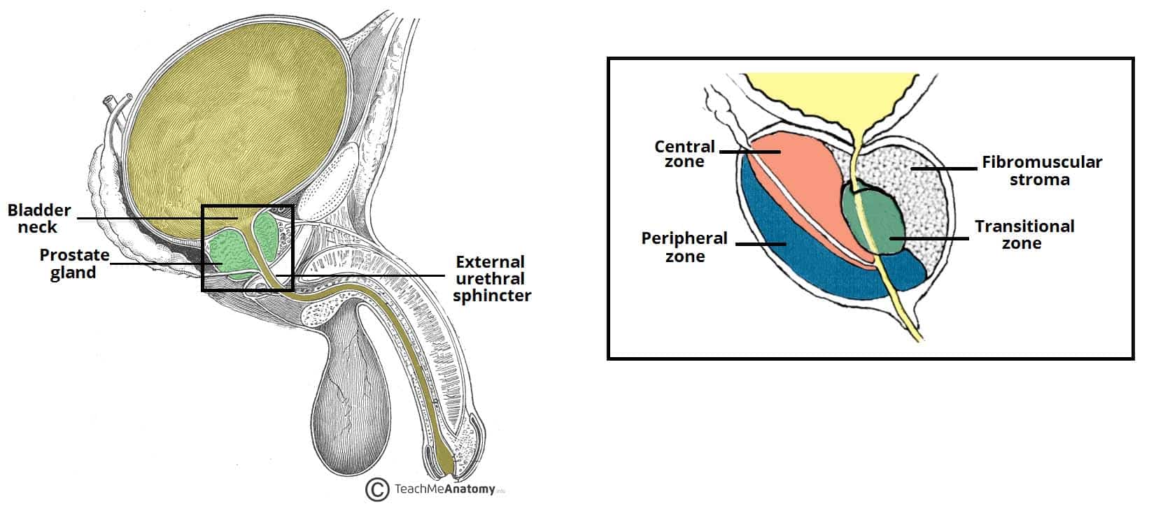 The prostate is the largest accessory gland in the male reproductive system. It secretes proteolytic enzymes into the semen, which act to break down clotting factors in the ejaculate. This allows the semen to remain in a fluid state, moving throughout the female reproductive tract for potential fertilisation. In this article, we shall look at the anatomy of the prostate – its structure, vasculature and innervation, We shall also consider its clinical correlations. Pro Feature - 3D Model You've Discovered a Pro Feature Access our 3D Model Library Explore, cut, dissect, annotate and manipulate our 3D models to visualise anatomy in a dynamic, interactive way. Learn More Anatomical Position The prostate is positioned inferiorly to the neck of the bladder and superiorly to the external urethral sphincter, with the levator ani muscle lying inferolateral to the gland. Posteriorly to the prostate lies the ampulla of the rectum – this anatomical arrangement is utilised during Digital Rectal Examinations (DRE), allowing physicians to examine the gland. The proteolytic enzymes leave the prostate via the prostatic ducts. These open into the prostatic portion of the urethra, through 10-12 openings at each side of the seminal colliculus (or verumontanum); secreting the enzymes into the semen immediately before ejaculation. By TeachMeSeries Ltd (2025) Fig 1Inferior view of the structures in the male reproductive system. Clinical Relevance Benign Prostatic Hyperplasia (BPH) Benign prostatic hyperplasia is the increase in size of the prostate, without the presence of malignancy. It is much more common with advancing age, although initial histological evidence of hyperplasia may be evident from much earlier ages (<40 years old). The enlarged prostate may compress the urethra, resulting in symptoms that refer to impaired storage of urine (urinary frequency, urinary urgency, nocturia) and symptoms that refer to impaired voiding (difficulty in initiating micturition, poor stream, intermittent urine stream and terminal dribbling of urine). BPH is usually caused by hyperplasia of the glands from the transitional zone of the prostate. Pro Feature - Dissection Images Sagittal section of the male pelvis. Sagittal section of the male pelvis. You've Discovered a Pro Feature Access our Dissection Image Library Enhance your understanding with high-resolution dissection images showcasing real-life anatomy. Learn More Anatomical Structure The prostate is commonly described as being the size of a walnut. Roughly two-thirds of the prostate is glandular in structure and the remaining third is fibromuscular. The gland itself is surrounded by a thin fibrous capsule of the prostate. This is not a real capsule; it rather resembles the thin connective tissue known as adventitia in the large blood vessels. Traditionally, the prostate is divided into anatomical lobes (inferoposterior, inferolateral, superomedial, and anteromedial) by the urethra and the ejaculatory ducts as they pass through the organ. However, more important clinically is the histological division of the prostate into three zones (according to McNeal): Central zone – surrounds the ejaculatory ducts, comprising approximately 25% of normal prostate volume. The ducts of the glands from the central zone are obliquely emptying in the prostatic urethra, thus being rather immune to urine reflux. Transitional zone – located centrally and surrounds the urethra, comprising approximately 5-10% of normal prostate volume. The glands of the transitional zone are those that typically undergo benign hyperplasia (BPH) Peripheral zone – makes up the main body of the gland (approximately 65%) and is located posteriorly. The ducts of the glands from the peripheral zone are vertically emptying in the prostatic urethra; that may explain the tendency of these glands to permit urine reflux. That also explains the high incidence of acute and chronic inflammation found in these compartments, a fact that may be linked to the high incidence of prostate carcinoma at the peripheral zone. The peripheral zone is mainly the area felt against the rectum on DRE, which is of irreplaceable value. The fibromuscular stroma (or fourth zone for some) is situated anteriorly in the gland. It merges with the tissue of the urogenital diaphragm. This part of the gland is actually the result of interaction of the prostate gland budding around the urethra during prostate embryogenesis and the common horseshoe-like muscle precursor of the smooth and striated muscle that will eventually form the internal and external urethra sphincter. By TeachMeSeries Ltd (2025) Fig 2The anatomical position and zones of the prostate. By TeachMeSeries Ltd (2025) Fig 3The prostate can be felt anteriorly during a digital rectal examination. The peripheral zone is mainly palpated. Vasculature The arterial supply to the prostate comes from the prostatic arteries, which are mainly derived from the internal iliac arteries. Some branches may also arise from the internal pudendal and middle rectal arteries. Venous drainage of the prostate is via the prostatic venous plexus, draining into the internal iliac veins. However, the prostatic venous plexus also connects posteriorly by networks of veins, including the Batson venous plexus, to the internal vertebral venous plexus. Innervation The prostate receives sympathetic, parasympathetic and sensory innervation from the inferior hypogastric plexus. The smooth muscle of the prostate gland is innervated by sympathetic fibres, which activate during ejaculation. Neurovascular Bundles The prostate is flanked by the two neurovascular bundles that travel through the pelvic floor towards the penis, supplying it with nerve fibres and blood vessels for the corpora cavernosa. The integrity of these bundles is critical for normal erection. During surgery for prostate cancer (radical prostatectomy), damage is often inevitable to one or both of these bundles, resulting in impairment of erecti