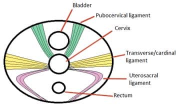 The ligaments of the female reproductive tract are a series of structures that support the internal female genitalia in the pelvis. The ligaments of the female reproductive tract can be divided into three categories: Broad ligament – a sheet of peritoneum, associated with both the uterus and ovaries. Uterine ligaments – ligaments primarily associated with the uterus. Ovarian ligaments – ligaments primary associated with the ovaries. Collectively, these ligaments are tough and non-extensible. They act to support the female viscera and provide a conduit for neurovascular structures. In this article, we shall look at the attachments and anatomical relations of the ligaments of the female reproductive tract. Pro Feature - 3D Model You've Discovered a Pro Feature Access our 3D Model Library Explore, cut, dissect, annotate and manipulate our 3D models to visualise anatomy in a dynamic, interactive way. Learn More Broad Ligament The broad ligament is a flat sheet of peritoneum, associated with the uterus, fallopian tubes and ovaries. It extends from the lateral pelvic walls on both sides, and folds over the internal female genitalia, covering their surface anteriorly and posteriorly. Subdivisions Anatomically, the broad ligament can be divided into three regions: Mesometrium – Surrounds the uterus and is the largest subsection of the broad ligament. It runs laterally to cover the external iliac vessels, forming a distinct fold over them. The mesometrium also encloses the proximal part of the round ligament of the uterus. Mesovarium – Part of the broad ligament associated with the ovaries. It projects from the posterior surface of the broad ligament and attaches to the hilum of the ovary, enclosing its neurovascular supply. It does not, however, cover the surface of the ovary itself. Mesosalpinx – Originates superiorly to the mesovarium, enclosing the fallopian tubes. By TeachMeSeries Ltd (2025) Fig 1The three parts of the broad ligament. Anatomical Relations The broad ligament is related to many structures within the female pelvis. It is attached to the uterus, fallopian tubes and ovaries. These organs are supplied by the ovarian and uterine arteries, which are also contained within the broad ligament. Three other ligaments of the female reproductive tract are located within the broad ligament: Ovarian ligament. Round ligament of uterus. Suspensory ligament of ovary (also known as the infundibulopelvic ligament). (These ligaments shall be explored in more detail later in the article). Ligaments Associated with the Ovary There are two main ligaments that attach to the ovary – the ovarian ligament and suspensory ligament of ovary. Ovarian Ligament The ovarian ligament is attached to the ovary inferiorly. It connects the ovary to the side of the uterus. Structurally, it is a fibrous band of tissue that lies within the broad ligament. It joins the uterus just below the origin of the fallopian tubes. Suspensory Ligament of Ovary The suspensory ligament of ovary extends outwards from the ovary to the lateral abdominal wall. It consists of a fold of peritoneum, thus some sources consider it to be part of the broad ligament. The function of this ligament is to contain the ovarian vessels and nerves (ovarian artery, ovarian vein, ovarian nerve plexus and lymphatic vessels). By TeachMeSeries Ltd (2025) Fig 2The major ligaments of the ovary. Ligaments Associated with the Uterus There are a number of ligamentous structures that attach to the uterus. They can be divided by where they attach to the uterus: Superior aspect – supported by the broad ligament and the round ligaments. Middle aspect – supported by the cardinal, pubocervical and uterosacral ligaments. The inferior aspect of uterus is supported by the structures in the pelvic floor – the levator ani, perineal membrane and perineal body. Round Ligament The round ligament is a remnant of the embryonic gubernaculum. It originates at the uterine horns (the points at which the fallopian tubes enter the uterus), and attaches to the labia majora, passing through the inguinal canal. The round ligament can be a source of pain during pregnancy, due to the increased force placed on the ligament by the expanding uterus. Cardinal Ligaments The cardinal ligaments are also known as the lateral, transverse cervical, or Mackenrodt’s ligaments. They are situated along the inferior border of the broad ligament and house the uterine artery and uterine veins. These ligaments arise from the side of the cervix and the lateral fornix of the vagina. They provide an extensive attachment on the lateral pelvic wall at the level of the ischial spines. Some fibres of the cardinal ligaments interdigitate with fibres from the uterosacral ligaments. When a hysterectomy is being performed due to a malignancy, the cardinal ligaments are often removed as they are common reservoir of cancerous cells. Pubocervical Ligaments The pubocervical ligaments are bilateral structures, which attach the cervix to the posterior surface of the pubic symphysis. They function to support the uterus within the pelvic cavity. Uterosacral Ligaments The uterosacral ligaments are also bilateral fibrous bands, which attach the cervix to the sacrum. They are also known as the recto-uterine ligaments or sacrocervical ligaments. This supports the uterus and holds it in place. By TeachMeSeries Ltd (2025) Fig 3Overview of the uterus and fallopian tubes, and associated ligaments By TeachMeSeries Ltd (2025) Fig 4The major ligaments of the cervix. Do you think you’re ready? Take the quiz below Pro Feature - Quiz Ligaments of the Female Reproductive Tract Question 1 of 3 Submitting... Skip Next Rate question: You scored 0% Skipped: 0/3 1800 More Questions Available Upgrade to TeachMeAnatomy Pro Challenge yourself with over 1800 multiple-choice questions to reinforce learning Learn More Rate This Article