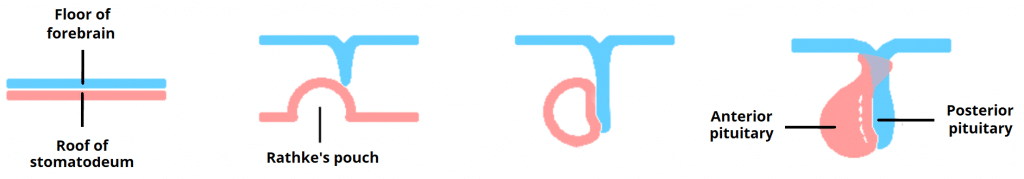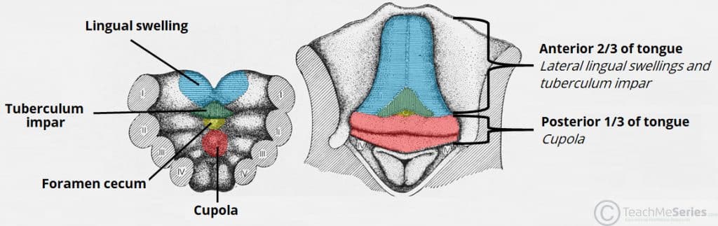 The pituitary gland, tongue and thyroid gland are midline structures located within the head and neck. In this article, we will look at the embryology of the pituitary, tongue and thyroid gland – their origin, development and clinical correlations. Pro Feature - 3D Model You've Discovered a Pro Feature Access our 3D Model Library Explore, cut, dissect, annotate and manipulate our 3D models to visualise anatomy in a dynamic, interactive way. Learn More Pituitary Gland The pituitary gland is an endocrine gland located within the middle cranial fossa of the skull base. Anatomically, the pituitary is a ‘’two-in-one’’ structure consisting of the anterior pituitary gland and the posterior pituitary gland – which develop from two different sources: Rathke’s pouch – outpocketing of the ectoderm of the stomatodeum (future oral cavity). Becomes the anterior pituitary gland. Infundibulum – downward growth of the forebrain. Becomes the pituitary stalk and posterior pituitary gland. Development begins at week 3 of gestation. Rathke’s pouch appears and extends upwards towards the infundibulum. By week 8, it has detached from the oral cavity and lies tightly against the infundibulum – forming the pituitary gland. Adapted from work by Giosantoro [CC BY-SA 4.0] Fig 1Development of the anterior and posterior pituitary gland. Tongue The tongue begins development in the 4th week of gestation. It is derived from pharyngeal arches 1-4 (forms the mucosa of the tongue) and the occipital somites (forms the musculature of the tongue). Pharyngeal Arches (Mucosa) In the first stage of development, lingual and medial swellings appear: Lateral lingual swellings (x2) – derived from the 1st pharyngeal arch. Contributes to the mucosa of the anterior 2/3 of the tongue. Medial swellings (x3): Tuberculum impar – derived from the 1st pharyngeal arch. Contributes to the mucosa of the anterior 2/3 of the tongue. Cupola (hypobranchial eminence) – derived from the 2nd, 3rd and 4th pharyngeal arches. Forms the mucosa of the posterior 1/3 of the tongue. Epiglottal swelling – derived from the 4th pharyngeal arch. Forms the epiglottis. During the 4th week, the lateral lingual swellings overgrow the tuberculum impar and merge together – forming the mucosa of the anterior 2/3 of the tongue. Their line of fusion is marked by the median sulcus of the tongue. Within the cupola, the 3rd pharyngeal arch component overgrows the 2nd arch, and forms the mucosa of the posterior 1/3 of the tongue. The anterior 2/3 and posterior 1/3 fuse – forming a V-shaped groove known as the terminal sulcus. At the centre of this groove is the foramen cecum, a pit which represents the place of origin of the thyroid gland. As the tongue forms, it is initially is tethered to the floor of the oral cavity. A process of carefully programmed cell death known as sculpting apoptosis releases the tongue, leaving in place the lingual frenulum to anchor the tongue in the mouth. By TeachMeSeries Ltd (2025) Fig 2Development of the tongue mucosa from the pharyngeal arches. Occipital Somites (Musculature) The intrinsic and extrinsic muscles of the tongue are derived from occipital somites, which are segments of mesoderm in the region of the upper neck. The somites migrate from the neck anteriorly to give rise to the muscles of the tongue. Thyroid Gland The thyroid gland begins development as a proliferation of endodermal cells between the cupola and tuberculum impar of the primitive tongue (the site of the future foramen cecum). This proliferation of cells bifurcates and descends into the neck as a two-lobed diverticulum. By week 7, it has reached its destination in the anterior neck, and is formed of two lateral lobes connected by a central isthmus. The descent of the developing thyroid gland forms the thyroglossal duct – an epithelialised tract that connects the gland to its origin at the foramen cecum. It usually regresses by the 10th week of gestation but can persist in some individuals. Clinical Relevance Thyroglossal Cyst The thyroglossal duct is an epithelialised tract which connects the thyroid gland to the foramen cecum of the tongue. If it fails to regress, the duct can give rise to cysts or fistulae. A thyroglossal cyst results from a build-up of secretions within the duct. It typically presents as a midline lump in the anterior neck, and characteristically rises on tongue protrusion. If left untreated, this cyst can become infected, and form a cutaneous fistula – discharging out onto the skin of the anterior neck. Thyroglossal cysts and fistulae are usually treated with complete excision. Recurrence is quoted at approximately 2.5%. Do you think you’re ready? Take the quiz below Pro Feature - Quiz Development of the Pituitary, Tongue and Thyroid Question 1 of 3 Submitting... Skip Next Rate question: You scored 0% Skipped: 0/3 1800 More Questions Available Upgrade to TeachMeAnatomy Pro Challenge yourself with over 1800 multiple-choice questions to reinforce learning Learn More Rate This Article