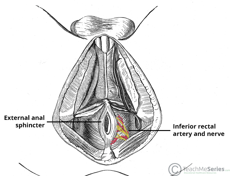 The inferior rectal nerve (inferior anal nerve, inferior haemorrhoidal nerve) is a nerve of the perineal region. It supplies motor innervation to the external anal sphincter and sensation to the lower anal canal and perianal skin. Pro Feature - 3D Model You've Discovered a Pro Feature Access our 3D Model Library Explore, cut, dissect, annotate and manipulate our 3D models to visualise anatomy in a dynamic, interactive way. Learn More Course The inferior rectal nerve arises from the pudendal nerve within the pudendal canal. It passes medially, crossing the medial wall of the pudendal canal and the ischioanal fossa – accompanied by the inferior rectal artery and vein. At the anal canal, the inferior rectal nerve terminates as motor fibres to the external anal sphincter, as well as sensory fibres to the anal canal and perianal skin. By TeachMeSeries Ltd (2025) Fig 1The inferior rectal nerve arises from the pudendal nerve within the pudendal canal. Motor Supply The inferior rectal nerve supplies somatic motor fibres to the external anal sphincter. By TeachMeSeries Ltd (2025) Fig 2- The inferior rectal nerve supplies somatic motor innervation to the external anal sphincter. Sensory Supply The inferior rectal neve supplies sensation to the lower half of the anal canal and the perianal skin. In females, it may also contribute to the innervation of the lower vaginal wall. Rate This Article