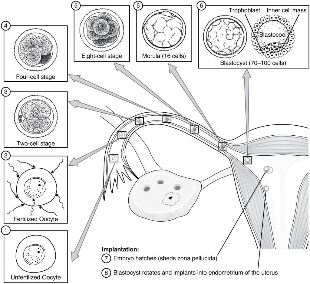 Embryology is the branch of medicine concerned with the study of embryos and their development. In this article, we outline the processes that take place within weeks 1-3 of embryonic development – cellular division, differentiation and gastrulation. We shall also look at the clinical applications of this knowledge. Pro Feature - 3D Model You've Discovered a Pro Feature Access our 3D Model Library Explore, cut, dissect, annotate and manipulate our 3D models to visualise anatomy in a dynamic, interactive way. Learn More Week 1 and 2 Initial Cellular Divisions The first stage in the development of a embryo is fertilisation – the process by which the male sperm and female oocyte (egg) join together. Approximately thirty hours after fertilisation, the fertilised oocyte splits into two cells of equal size; called blastomeres. After three more divisions, there are 16 cells. At this point, the group of cells is referred to as the morula. Within the first week, the cells of the morula reorganise to form a cavity, known as the blastocyst cavity (blastocoel). From this point, the morula is known as the blastocyst. It is comprised of two different cell types: Outer cell mass (trophoblast) – contacts with the endometrium of the uterus to facilitate implantation and the formation of the placenta. Inner cell mass (embryoblast) – responsible for the formation of the embryo itself. During the second week, the trophoblast and embryoblast divide into increasingly specialised cell types. The trophoblast divides into the syncytiotrophoblast and cytotrophoblast. The embryoblast divides into the epiblast and hypoblast, forming a two-layered structure; the bilaminar disc. The amniotic cavity forms within the epiblast. By OpenStax [CC BY 4.0], via Wikimedia Commons Fig 1The initial cellular divisions after fertilisation. Implantation After the initial rounds of cellular divisions, the embryo must implant into the endometrium of the uterus. During this process, the syncytiotrophoblast becomes continuous with the uterus – such that maternal blood vessels (known as sinusoids) invade the spaces within the syncytiotrophoblast (known as lacunae). At this point, uteroplacental circulation has begun; and further embryonic development can occur. Clinical Relevance Placenta Praevia In placenta praevia, the embryo implants in the lower uterine segment rather than the upper posterior uterine wall. A low-lying placenta is more vulnerable to haemorrhage, either spontaneously or following minor trauma (e.g. vaginal examination). Later in pregnancy, the placenta may also be damaged as the presenting fetal part descends into the lower uterine segment. Week 3: Gastrulation In the 3rd week of embryonic development, the cells of the bilaminar disc (epiblast and hypoblast) undergo a highly specialised process called gastrulation. During this process, the two cell layers become three germ cell layers, and the bodily axes observed in the mature adult are created. Gastrulation is a process of cellular rearrangement which involves migration, invagination and differentiation of the epiblast. It is largely controlled and orchestrated by the primitive streak. The primitive streak is a groove in the midline of the epiblast which appears during the third week. Within the primitive streak lies a primitive node at the cranial end, and within the primitive node lies the primitive pit. Cells of the epiblast layer break off and migrate toward the primitive pit. Here, they detach and penetrate through the epiblast layer to form three new germ cell layers: Endoderm – formed by epiblast cells that migrate through the primitive pit and displace the hypoblast cells. Mesoderm – formed by epiblast cells that migrate through the primitive pit and lie between the epiblast layer and the newly created endoderm. Ectoderm – formed by the epiblast cells that remain in position. These three cell layers are then responsible for forming the different tissues of the fetus. By OpenStax [CC BY 4.0], via Wikimedia Commons Fig 2Formation of the three primary germ layers occurs during the third week of development. The embryo at this stage is only a few millimetres in length. Cell Layer Structures Derived Endoderm Epithelial lining of digestive and respiratory tracts, Lining of urethra, bladder and reproductive System Liver and pancreas Mesoderm Notochord Musculoskeletal system Muscular layer of stomach, intestine etc Circulatory system Ectoderm Epidermis of skin Cornea and lens of eye Nervous system Do you think you’re ready? Take the quiz below Pro Feature - Quiz Embryology: Weeks 1-3 Question 1 of 3 Submitting... Skip Next Rate question: You scored 0% Skipped: 0/3 1800 More Questions Available Upgrade to TeachMeAnatomy Pro Challenge yourself with over 1800 multiple-choice questions to reinforce learning Learn More Rate This Article