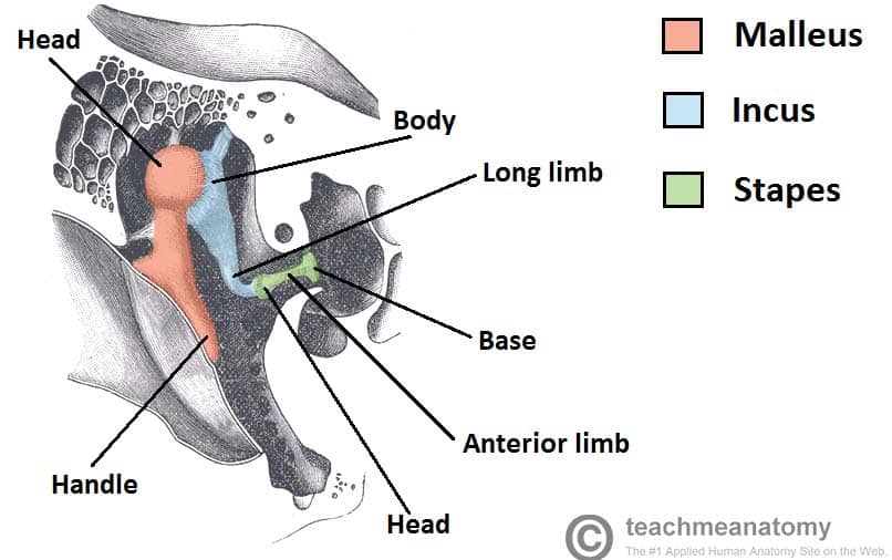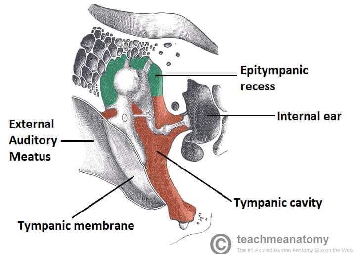 The ear can be split into three parts; external, middle and inner. The middle ear lies within the temporal bone, and extends from the tympanic membrane to the lateral wall of the inner ear. The main function of the middle ear is to transmit vibrations from the tympanic membrane to the inner ear via the auditory ossicles. This article will focus on the anatomy of the middle ear – its structure, neurovasculature, and its clinical correlations. By TeachMeSeries Ltd (2025) Fig 1Overview of the ear Pro Feature - 3D Model You've Discovered a Pro Feature Access our 3D Model Library Explore, cut, dissect, annotate and manipulate our 3D models to visualise anatomy in a dynamic, interactive way. Learn More Parts of the Middle Ear The middle ear can be divided into two parts: Tympanic cavity – located medially to the tympanic membrane. It contains three small bones known as the auditory ossicles: the malleus, incus and stapes. They transmit sound vibrations through the middle ear. Epitympanic recess – a space superior to the tympanic cavity, which lies next to the mastoid air cells. The malleus and incus partially extend upwards into the epitympanic recess. By TeachMeSeries Ltd (2025) Fig 2The middle ear. The two main parts of the middle ear have been labelled. Borders The middle ear can be visualised as a rectangular box, with a roof and floor, medial and lateral walls and anterior and posterior walls. Roof – formed by a thin bone from the petrous part of the temporal bone. It separates the middle ear from the middle cranial fossa. Floor – known as the jugular wall, it consists of a thin layer of bone, which separates the middle ear from the internal jugular vein Lateral wall – made up of the tympanic membrane and the lateral wall of the epitympanic recess. Medial wall – formed by the lateral wall of the internal ear. It contains a prominent bulge, produced by the facial nerve as it travels nearby. Anterior wall – a thin bony plate with two openings; for the auditory tube and the tensor tympani muscle. It separates the middle ear from the internal carotid artery. Posterior wall (mastoid wall) – it consists of a bony partition between the tympanic cavity and the mastoid air cells. Superiorly, there is a hole in this partition, allowing the two areas to communicate. This hole is known as the aditus to the mastoid antrum. Bones The bones of the middle ear are the auditory ossicles – the malleus, incus and stapes. They are connected in a chain-like manner, linking the tympanic membrane to the oval window of the internal ear. Sound vibrations cause a movement in the tympanic membrane which then creates movement, or oscillation, in the auditory ossicles. This movement helps to transmit the sound waves from the tympanic membrane of external ear to the oval window of the internal ear. The malleus is the largest and most lateral of the ear bones, attaching to the tympanic membrane, via the handle of malleus. The head of the malleus lies in the epitympanic recess, where it articulates with the next auditory ossicle, the incus. The next bone – the incus – consists of a body and two limbs. The body articulates with the malleus, the short limb attaches to the posterior wall of the middle, and the long limb joins the last of the ossicles; the stapes. The stapes is the smallest bone in the human body. It joins the incus to the oval window of the inner ear. It is stirrup-shaped, with a head, two limbs, and a base. The head articulates with the incus, and the base joins the oval window. By TeachMeSeries Ltd (2025) Fig 3Bones of the middle ear. Mastoid Air Cells The mastoid air cells are located posterior to epitympanic recess. They are a collection of air-filled spaces in the mastoid process of the temporal bone. The air cells are contained within a cavity called the mastoid antrum. The mastoid antrum communicates with the middle ear via the aditus to mastoid antrum. The mastoid air cells act as a ‘buffer system‘ of air – releasing air into the tympanic cavity when the pressure is too low. By TeachMeSeries Ltd (2025) Fig 4Coronal section of temporal bone, showing the mastoid air cells in more detail Muscles There are two muscles which serve a protective function in the middle ear; the tensor tympani and stapedius. They contract in response to loud noise, inhibiting the vibrations of the malleus, incus and stapes, and reducing the transmission of sound to the inner ear. This action is known as the acoustic reflex. The tensor tympani originates from the auditory tube and attaches to the handle of malleus, pulling it medially when contracting. It is innervated by the tensor tympani nerve, a branch of the mandibular nerve. The stapedius muscle attaches to the stapes, and is innervated by the facial nerve. By TeachMeSeries Ltd (2025) Fig 5The tensor tympani muscle of the middle ear. Auditory Tube The auditory tube (eustachian tube) is a cartilaginous and bony tube that connects the middle ear to the nasopharynx. It acts to equalise the pressure of the middle ear to that of the external auditory meatus. It extends from the anterior wall of the middle ear, in an anterior, medioinferior direction, opening onto the lateral wall of the nasopharynx. In joining the two structures, it is a pathway by which an upper respiratory infection can spread into the middle ear. The tube is shorter and straighter in children, therefore middle ear infections tend to be more common in children than adults. Clinical Relevance Otitis Media with Effusion Otitis media with effusion is commonly known as glue ear. It arises from persistent dysfunction of the auditory tube. If the auditory tube is unable to equalise middle ear pressure (due to blockage, inflammation, genetic mutation), a negative pressure develops inside the middle ear This negative pressure draws out a transudate from the mucosa of the middle ear, creating an environment suitable for pathogens to replicate and cause infection. Upon inspection of a p