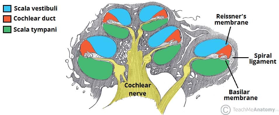 The ear can be divided into three parts: the outer ear, middle ear and inner ear. The inner ear is the innermost part of the ear, and houses the vestibulocochlear organs. It has two main functions: To convert mechanical signals from the middle ear into electrical signals, which can transfer information to the auditory pathway in the brain. To maintain balance by detecting position and motion. In this article, we shall look at the anatomy of the inner ear – its position, structure, and neurovascular supply. By TeachMeSeries Ltd (2025) Fig 1Overview of the ear Pro Feature - 3D Model You've Discovered a Pro Feature Access our 3D Model Library Explore, cut, dissect, annotate and manipulate our 3D models to visualise anatomy in a dynamic, interactive way. Learn More Anatomical Position and Structure The inner ear is located within the petrous part of the temporal bone. It lies between the middle ear and the internal acoustic meatus, which lie laterally and medially respectively. The inner ear has two main components – the bony labyrinth and membranous labyrinth. Bony labyrinth – consists of a series of bony cavities within the petrous part of the temporal bone. It is composed of the cochlea, vestibule and three semi-circular canals. All these structures are lined internally with periosteum and contain a fluid called perilymph. Membranous labyrinth – lies within the bony labyrinth. It consists of the cochlear duct, semi-circular ducts, utricle and the saccule. The membranous labyrinth is filled with fluid called endolymph. The inner ear has two openings into the middle ear, both covered by membranes. The oval window lies between the middle ear and the vestibule, whilst the round window separates the middle ear from the scala tympani (part of the cochlear duct). Bony Labyrinth The bony labyrinth is a series of bony cavities within the petrous part of the temporal bone. It consists of three parts – the cochlea, vestibule and the three semi-circular canals. Vestibule The vestibule is the central part of the bony labyrinth. It is separated from the middle ear by the oval window, and communicates anteriorly with the cochlea and posteriorly with the semi-circular canals. Two parts of the membranous labyrinth; the saccule and utricle, are located within the vestibule. Cochlea The cochlea houses the cochlea duct of the membranous labyrinth – the auditory part of the inner ear. It twists upon itself around a central portion of bone called the modiolus, producing a cone shape which points in an anterolateral direction. Branches from the cochlear portion of the vestibulocochlear (VIII) nerve are found at the base of the modiolus. Extending outwards from the modiolus is a ledge of bone known as spiral lamina, which attaches to the cochlear duct, holding it in position. The presence of the cochlear duct creates two perilymph-filled chambers above and below: Scala vestibuli: Located superiorly to the cochlear duct. As its name suggests, it is continuous with the vestibule. Scala tympani: Located inferiorly to the cochlear duct. It terminates at the round window. Semi-circular Canals There are three semi-circular canals: anterior, lateral and posterior. They contain the semi-circular ducts, which are responsible for balance (along with the utricle and saccule). The canals are situated superoposterior to the vestibule, at right angles to each other. They have a swelling at one end, known as the ampulla. By TeachMeSeries Ltd (2025) Fig 2The three parts of the bony labyrinth. Membranous Labyrinth The membranous labyrinth is a continuous system of ducts filled with endolymph. It lies within the bony labyrinth, surrounded by perilymph. It is composed of the cochlear duct, three semi-circular ducts, saccule and the utricle. The cochlear duct is situated within the cochlea and is the organ of hearing. The semi-circular ducts, saccule and utricle are the organs of balance (also known as the vestibular apparatus). Cochlear Duct The cochlear duct is located within the bony scaffolding of the cochlea. It is held in place by the spiral lamina. The presence of the duct creates two canals above and below it – the scala vestibuli and scala tympani respectively. The cochlear duct can be described as having a triangular shape: Lateral wall – Formed by thickened periosteum, known as the spiral ligament. Roof – Formed by a membrane which separates the cochlear duct from the scala vestibuli, known as the Reissner’s membrane. Floor – Formed by a membrane which separates the cochlear duct from the scala tympani, known as the basilar membrane. The basilar membrane houses the epithelial cells of hearing – the Organ of Corti. A more detailed description of the Organ of Corti is beyond the scope of this article. By TeachMeSeries Ltd (2025) Fig 3Structure of the cochlea, and borders of the cochlear duct. Saccule and Utricle The saccule and utricle are two membranous sacs located in the vestibule. They are organs of balance which detect movement or acceleration of the head in the vertical and horizontal planes, respectively. The utricle is the larger of the two, receiving the three semi-circular ducts. The saccule is globular in shape and receives the cochlear duct. Endolymph drains from the saccule and utricle into the endolymphatic duct. The duct travels through the vestibular aqueduct to the posterior aspect of the petrous part of the temporal bone. Here, the duct expands to a sac where endolymph can be secreted and absorbed. Semi-circular Ducts The semi-circular ducts are located within the semi-circular canals, and share their orientation. Upon movement of the head, the flow of endolymph within the ducts changes speed and/or direction. Sensory receptors in the ampullae of the semi-circular canals detect this change, and send signals to the brain, allowing for the processing of balance. By TeachMeSeries Ltd (2025) Fig 4The components of the membranous labyrinth. Vasculature The bony labyrinth and membranous 