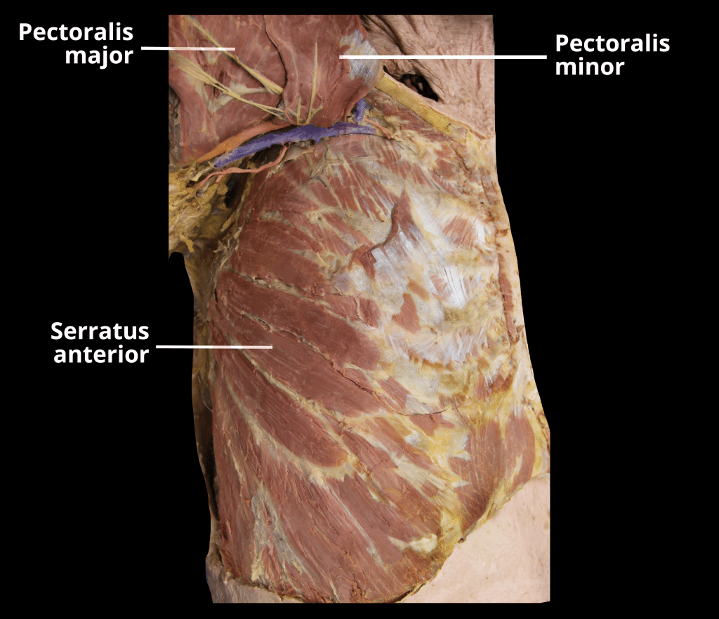 The long thoracic nerve is a somatic motor nerve of the thoracic wall. It supplies innervation to the serratus anterior muscle. Pro Feature - 3D Model You've Discovered a Pro Feature Access our 3D Model Library Explore, cut, dissect, annotate and manipulate our 3D models to visualise anatomy in a dynamic, interactive way. Learn More Course The long thoracic nerve originates from the brachial plexus, recieving fibres directly from the anterior rami of spinal nerves C5-7. It descends posteriorly to the brachial plexus and anteriorly to the posterior scalene muscle. The nerve continues distally deep to the clavicle and superficial to the first and second ribs before continuing along the anterolateral thoracic wall. It divides into its terminal branches at the surface of the serratus anterior muscle. Adobe Stock, Licensed to TeachMeSeries Ltd Fig 1Course of the long thoracic nerve. Pro Feature - Dissection Images You've Discovered a Pro Feature Access our Dissection Image Library Enhance your understanding with high-resolution dissection images showcasing real-life anatomy. Learn More Motor Functions The long thoracic nerve supplies motor innervation to the serratus anterior muscle. This muscle rotates the scapula, allowing the arm to be raised over 90 degrees. It also holds the scapula against the ribcage. Damage to the long thoracic nerve can result in weakness of the serratus anterior, producing a characteristic “winged scapula” appearance. By TeachMeSeries Ltd (2025) Fig 2The serratus anterior and pectoralis minor muscles. Rate This Article