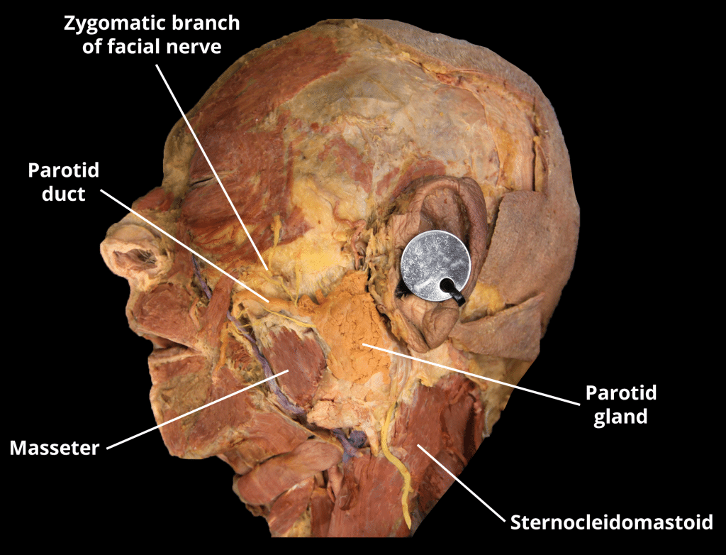 The parotid gland is a bilateral salivary gland located in the face. It produces serous saliva – a watery solution rich in enzymes – which is then secreted into the oral cavity, where it lubricates and aids in the breakdown of food. In this article, we shall look at the anatomy of the parotid gland – its location, neurovascular supply and any clinical correlations. Pro Feature - 3D Model You've Discovered a Pro Feature Access our 3D Model Library Explore, cut, dissect, annotate and manipulate our 3D models to visualise anatomy in a dynamic, interactive way. Learn More Anatomical Position The parotid gland is a bilateral structure, which displays a lobular and irregular morphology. Anatomically, it can be divided into deep and superficial lobes, which are separated by the facial nerve. It lies within a deep hollow, known as the parotid region. The parotid region is bounded as follows: Superiorly – Zygomatic arch. Inferiorly – Inferior border of the mandible. Anteriorly – Masseter muscle. Posteriorly – External ear and sternocleidomastoid. The secretions of the parotid gland are transported to the oral cavity by the Stensen duct. It arises from the anterior surface of the gland, traversing the masseter muscle. The duct then pierces the buccinator, moving medially. It opens out into the oral cavity near the second upper molar. By TeachMeSeries Ltd (2025) Fig 1Position of the parotid gland and borders of the parotid region. Pro Feature - Dissection Images Prosection of the parotid gland and surrounding structures. Note the close anatomical relationship between the parotid gland and the facial nerve. Prosection of the parotid gland and surrounding structures. Note the close anatomical relationship between the parotid gland and the facial nerve. You've Discovered a Pro Feature Access our Dissection Image Library Enhance your understanding with high-resolution dissection images showcasing real-life anatomy. Learn More Anatomical Relationships The anatomical relationships of the parotid gland are of great clinical importance – particularly during parotid gland surgery. Several important neurovascular structures pass through the gland: Facial nerve (CN VII) – gives rise to five terminal branches within the parotid gland. These branches innervate the muscles of facial expression. External carotid artery – gives rise to the posterior auricular artery within the parotid gland. It then divides into its two terminal branches – the maxillary artery and superficial temporal artery. Retromandibular vein – formed within the parotid gland by the convergence of the superficial temporal and maxillary veins. It is one of the major structures responsible for venous drainage of the face. By TeachMeSeries Ltd (2025) Fig 2Innervation to the muscles of facial expression via the facial nerve (CN VII) Vasculature Blood is supplied by the posterior auricular and superficial temporal arteries. They are both branches of the external carotid artery, which arise within the parotid gland itself. Venous drainage is achieved via the retromandibular vein. It is formed by unification of the superficial temporal and maxillary veins. Innervation The parotid gland receives sensory and autonomic innervation. The autonomic innervation controls the rate of saliva production. Sensory innervation is supplied by the auriculotemporal nerve (gland) and the great auricular nerve (fascia). The parasympathetic innervation to the parotid gland has a complex path. It begins with the glossopharyngeal nerve (cranial nerve IX). This nerve synapses with the otic ganglion (a collection of neuronal cell bodies). The auriculotemporal nerve then carries parasympathetic fibres from the otic ganglion to the parotid gland. Parasympathetic stimulation causes an increase in saliva production. Sympathetic innervation originates from the superior cervical ganglion, part of the paravertebral chain. Fibres from this ganglion travel along the external carotid artery to reach the parotid gland. Increased activity of the sympathetic nervous system inhibits saliva secretion, via vasoconstriction. By TeachMeSeries Ltd (2025) Fig 3Path of the parasympathetic fibres to the parotid gland. Clinical Relevance Disorders of the Parotid Gland Parotid Gland Tumours The parotid gland is the most common site of a salivary gland tumour. These tumours are usually benign, such as an adenolymphoma. In contrast, tumours of the submandibular and sublingual glands are less common, but more likely to be malignant. Treatment usually involves surgical excision of the tumour and parotid gland, known as a parotidectomy. During this procedure, it is critical to identify and preserve the facial nerve and its branches. Damage to facial nerve or its branches will cause paralysis of the facial muscles. The affected muscles will lose tone, and the area will ‘sag’. The inferior eyelid can be particularly affected, falling away from the eyeball (known as ectropion). Parotitis Parotitis refers to inflammation of the parotid gland, usually as a result of an infection. The parotid gland is enclosed in a tough fibrous capsule. This restricts swelling of the gland, producing pain. The pain produced can be referred to the external ear. This is because the auriculotemporal nerve provides sensory innervation to the parotid gland and the external ear. Do you think you’re ready? Take the quiz below Pro Feature - Quiz The Parotid Gland Question 1 of 3 Submitting... Skip Next Rate question: You scored 0% Skipped: 0/3 1800 More Questions Available Upgrade to TeachMeAnatomy Pro Challenge yourself with over 1800 multiple-choice questions to reinforce learning Learn More Rate This Article