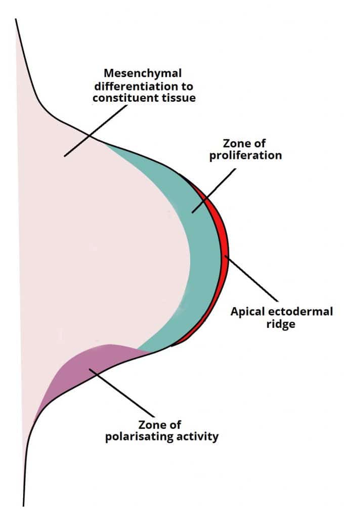 The upper and lower limbs (including the shoulder girdle and pelvic girdle) begin development in the 4th week of gestation. Usually the upper limb begins development first, with the lower limb often lagging 2-3 days behind. The limbs are well differentiated by week 8. In this article we shall cover the basic embryological development of the limbs, as well as some important clinical conditions. Pro Feature - 3D Model You've Discovered a Pro Feature Access our 3D Model Library Explore, cut, dissect, annotate and manipulate our 3D models to visualise anatomy in a dynamic, interactive way. Learn More Formation of Limb Buds The limb buds are the precursor structures of the limbs. Their formation begins in the 4th week, with the activation of mesenchymal cells in the somatic layer of lateral plate mesoderm. The limb buds first appear on the ventrolateral body wall initially and extend ventrally. They consist of a central core of undifferentiated mesenchyme tipped with a layer of ectoderm, the apical ectodermal ridge (AER). Elongation occurs through proliferation of the underlying mesenchyme core, in which the AER plays a crucial role in ensuring that the mesenchyme immediately underneath it remains undifferentiated. As growth proceeds, the proximal mesenchyme loses signals from the AER and begins to differentiate into the constituent tissues of the limbs. The AER itself is maintained by the Zone of Polarising Activity (ZPA) which is found in the posterior base of the limb bud. The ZPA’s secondary responsibility is to ensure asymmetry in the limbs. The position of the AER is important as it marks the boundary between the dorsal and ventral limb ectoderm – the ectoderm is able to exert ‘dorsalising and ventralising’ influences over the mesenchyme core. For example, it removes hair follicles from the palms and soles of the feet. By Terrasigillata [CC BY-SA 3.0], via Wikimedia Commons Fig 1Development of the limb bud showing the apical ectodermal ridge and underlying tissues. Formation of the Digits As elongation continues, the mesenchyme condenses into plates forming the cartilaginous models of the future digital bones. The AER then breaks up and is maintained only over the tips of the future digits. The interdigital spaces are then progressively sculpted by cellular apoptosis. Clinical Relevance Limb Abnormalities Congenital limb and digit defects occur in between 1 in 500 and 1 in 1000 live births. They are often associated with other birth defects, such as congenital heart malformations. The common limb abnormalities are: Amelia – complete absence of a limb. Meromelia – partial absence of one or more limb structures. The common digit abnormalities are: Syndactyly – fusion of digits, which occurs due to a lack of apoptosis between the digits during development. Polydactyly – increased number of digits. By Drgnu23 [CC BY-SA 3.0] via Wikimedia Commons Fig 2An example of polydactyly on x-ray. This patient had a duplication of their middle finger. Do you think you’re ready? Take the quiz below Pro Feature - Quiz Development of the Limbs Question 1 of 3 Submitting... Skip Next Rate question: You scored 0% Skipped: 0/3 1800 More Questions Available Upgrade to TeachMeAnatomy Pro Challenge yourself with over 1800 multiple-choice questions to reinforce learning Learn More Rate This Article
