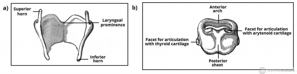 The larynx (voice box) is an organ located in the anterior neck. It is a component of the respiratory tract, and has several important functions, including phonation, the cough reflex, and protection of the lower respiratory tract. There are nine cartilages located within the larynx; three unpaired, and six paired. They form the laryngeal skeleton, which provides rigidity and stability. In this article, we shall examine the anatomy of the laryngeal cartilages. Pro Feature - 3D Model You've Discovered a Pro Feature Access our 3D Model Library Explore, cut, dissect, annotate and manipulate our 3D models to visualise anatomy in a dynamic, interactive way. Learn More Unpaired Cartilages The three unpaired cartilages are the epiglottis, thyroid and cricoid cartilages. Thyroid Cartilage The thyroid cartilage is a large, prominent structure which is easily visible in adult males. It is composed of two sheets (laminae), which join anteriorly to form the laryngeal prominence (Adam’s apple). The posterior border of each sheet project superiorly and inferiorly to form the superior and inferior horns (also known as cornu). The superior horns are connected to the hyoid bone via the lateral thyrohyoid ligament, while the inferior horns articulate with the cricoid cartilage. Cricoid Cartilage The cricoid cartilage is a complete ring of hyaline cartilage, consisting of a broad sheet posteriorly and a much narrower arch anteriorly (said to resemble a signet ring in shape). The cartilage completely encircles the airway, marking the inferior border of the larynx at the level of C6. It articulates with the paired arytenoid cartilages posteriorly, as well as providing an attachment for the inferior horns of the thyroid cartilage. The cricoid is the only complete circle of cartilage in the larynx or trachea. This is of clinical relevance during emergency intubation – as pressure can be applied to the cricoid to occlude the oesophagus, and thus prevent regurgitation of gastric contents (known as cricoid pressure or Sellick’s manoeuvre). Epiglottis The epiglottis is a leaf shaped plate of elastic cartilage which marks the entrance to the larynx. Its ‘stalk’ is attached to the back of the anterior aspect of the thyroid cartilage. During swallowing, the epiglottis flattens and moves posteriorly to close off the larynx and prevent aspiration. By TeachMeSeries Ltd (2025) Fig 1Structure of the (a) thyroid cartilage and (b) cricoid cartilage. Pro Feature - Dissection Images The thyroid gland and surrounding structures. The thyroid gland and surrounding structures. You've Discovered a Pro Feature Access our Dissection Image Library Enhance your understanding with high-resolution dissection images showcasing real-life anatomy. Learn More Paired Cartilages There are three paired cartilages – the arytenoid, corniculate and cuneiform. They are situated bilaterally in the larynx. Arytenoid Cartilages The arytenoid cartilages are pyramidal shaped structures that sit on the cricoid cartilage. They consist of an apex, base, three sides and two processes, and provides an attachment point for various key structures in the larynx: Apex – articulates with the corniculate cartilage. Base – articulates with the superior border of the cricoid cartilage. Vocal process – provides attachment for the vocal ligament. Muscular process – provides attachment for the posterior and lateral cricoarytenoid muscles. Corniculate Cartilages The corniculate cartilages are minor cartilaginous structures. They articulate with the apices of the arytenoid cartilages. Cuneiform Cartilages The cuneiform cartilages are located within the aryepiglottic folds. They have no direct attachment, but act to strengthen the folds. By TeachMeSeries Ltd (2025) Fig 2The major cartilages in the laryngeal skeleton. Do you think you’re ready? Take the quiz below Pro Feature - Quiz Laryngeal Cartilages Question 1 of 3 Submitting... Skip Next Rate question: You scored 0% Skipped: 0/3 1800 More Questions Available Upgrade to TeachMeAnatomy Pro Challenge yourself with over 1800 multiple-choice questions to reinforce learning Learn More Rate This Article