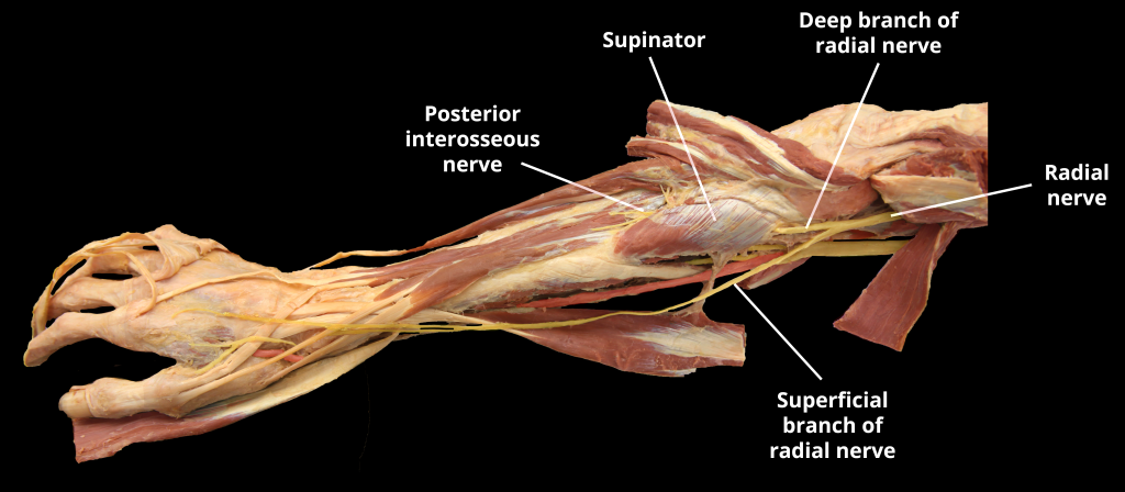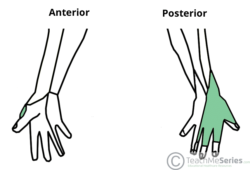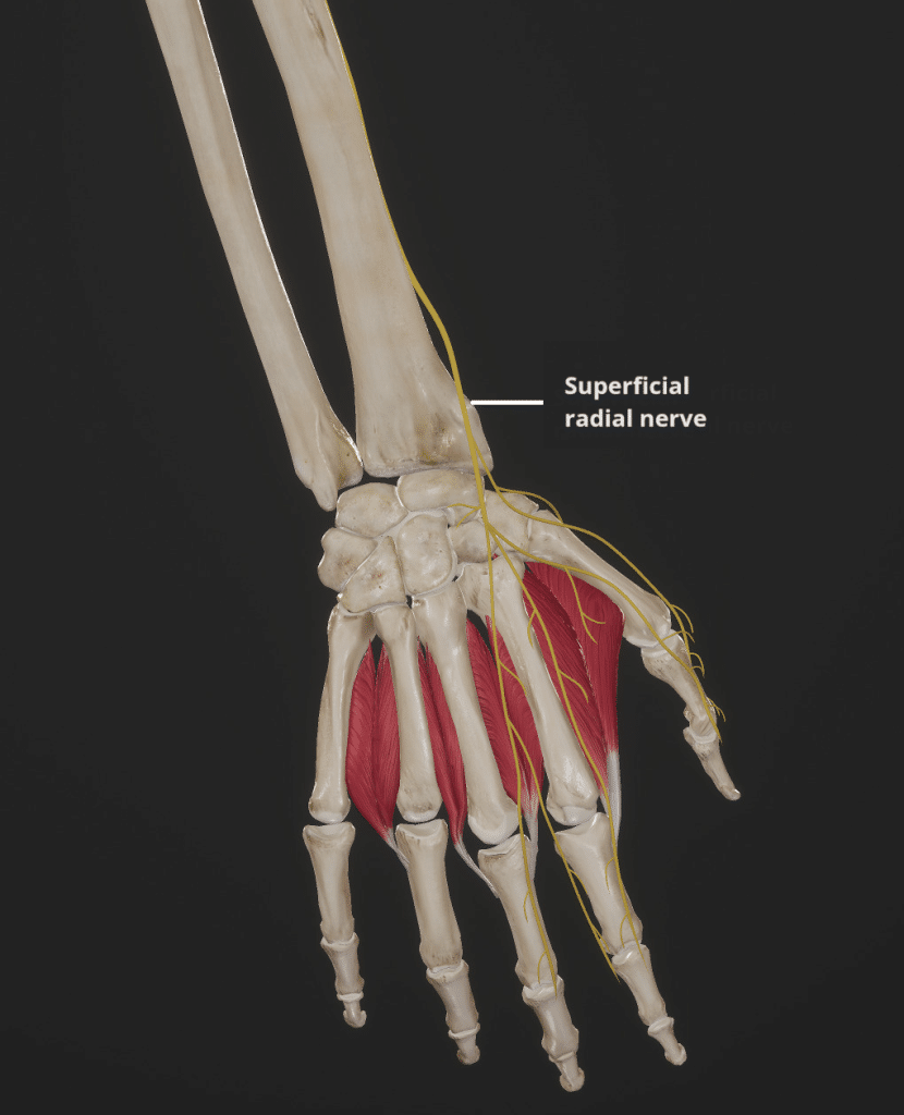 The superficial radial nerve is a sensory nerve branch of the radial nerve that arises in the cubital fossa. It supplies sensory cutaneous innervation to the lateral portion of the dorsum of the hand. Pro Feature - 3D Model You've Discovered a Pro Feature Access our 3D Model Library Explore, cut, dissect, annotate and manipulate our 3D models to visualise anatomy in a dynamic, interactive way. Learn More Course The superficial radial nerve originates in the cubital fossa as the radial nerve divides into superfical and deep branches at the level of the lateral epicondyle. It continues down the anterior aspect of the forearm, lateral to the radial artery, and concealed in a plane between the brachioradialis and pronator teres muscles. About 7cm proximal to the wrist, it pierces the deep fascia of the forearm to wind around the radius, pass over the anatomical snuffbox, and branch off into the dorsum of the hand. By TeachMeSeries Ltd (2025) Fig 1The superficial branch of the radial nerve. Adobe Stock, Licensed to TeachMeSeries Ltd Fig 2Dorsal course of the supeficial radial nerve in the distal forearm and hand. Pro Feature - Dissection Images Prosection of the radial nerve in the forearm. It divides into superficial and deep branches within the proximal forearm. Prosection of the radial nerve in the forearm. It divides into superficial and deep branches within the proximal forearm. You've Discovered a Pro Feature Access our Dissection Image Library Enhance your understanding with high-resolution dissection images showcasing real-life anatomy. Learn More Sensory Functions The superficial radial nerve is a purely cutaneous sensory nerve. It has four dorsal digital branches which supply: Dorsal skin on lateral side of the hand Proximal dorsal surfaces of the thumb, index, and lateral half of the middle finger. By TeachMeSeries Ltd (2025) Fig 3Cutaneous innervation of the superficial branch of the radial nerve. Rate This Article