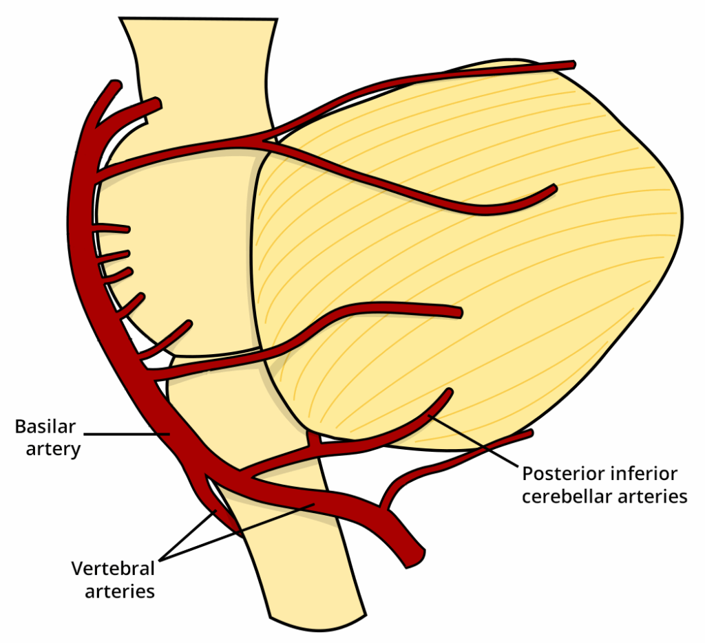 The posterior inferior cerebellar artery (PICA) is an artery of the hindbrain. It is the largest branch of the vertebral artery. It supplies blood to the inferior cerebellum, medulla oblongata, and parts of the fourth ventricle. Pro Feature - 3D Model You've Discovered a Pro Feature Access our 3D Model Library Explore, cut, dissect, annotate and manipulate our 3D models to visualise anatomy in a dynamic, interactive way. Learn More Course The posterior inferior cerebellar artery arises from the vertebral artery at the level of the medulla oblongata. From here, it ascends posteriorly, passing behind the origin of the glossopharyngeal and vagus nerves to reach the inferior border of the pons. It then curves medially and descends along the margin of the fourth ventricle, before turning laterally into the cerebellomedullary fissure (the space between the cerebellum and medulla). Within the fissure, the PICA divides into two main terminal branches: Medial branch – courses along the inferior vermis (midline of the cerebellum), supplying the cerebellum and adjacent medullary structures. Lateral branch – extends over the inferior surface of the cerebellar hemisphere, supplying the cerebellar cortex and tonsils. Adapted from work by Petit B [CC BY-SA 4.0], via Wikimedia Commons Fig 1The origin of the posterior inferior cerebellar artery from the vertebral artery. Supply The posterior inferior cerebellar artery supplies the following structures: Dorsolateral medulla Inferior surface of the cerebellum, including the tonsils and vermis Choroid plexus of the fourth ventricle Rate This Article