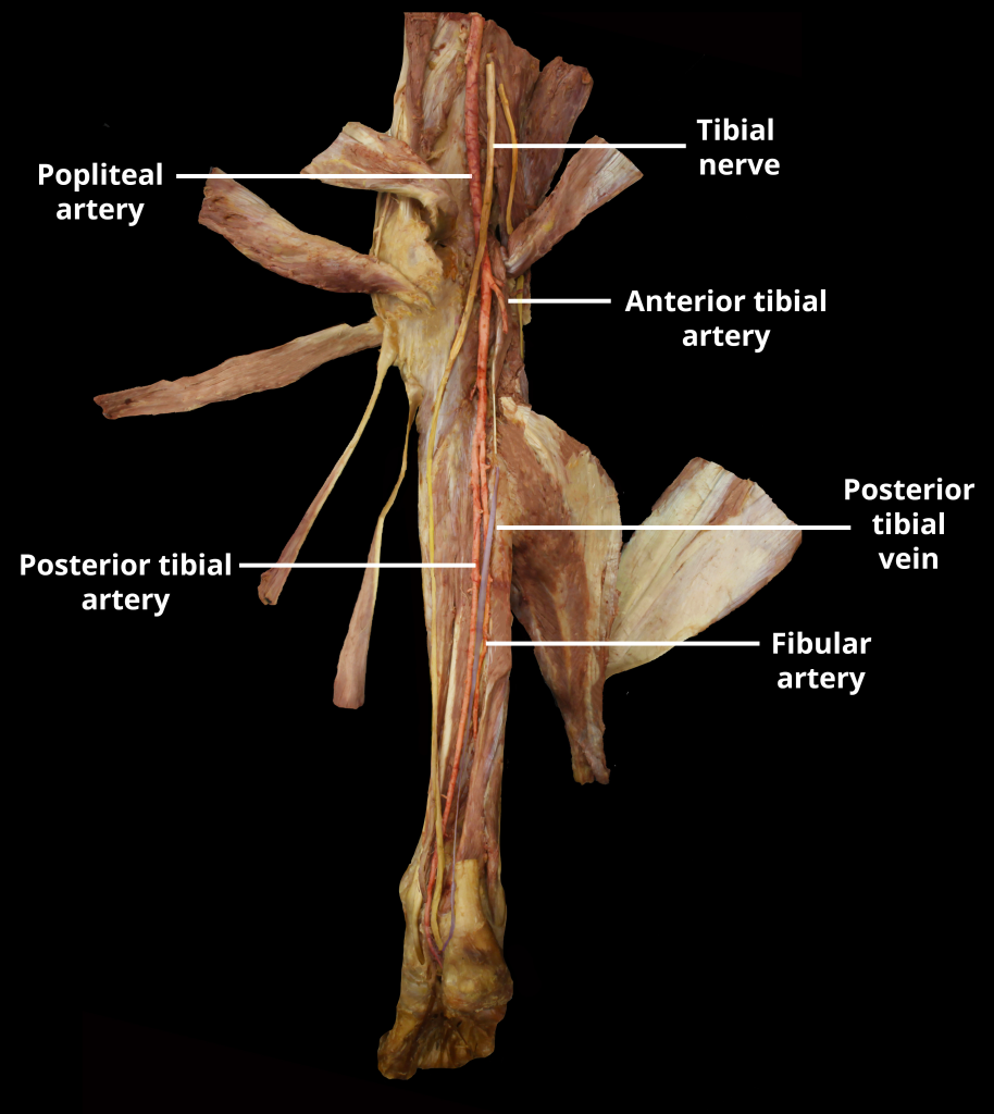 The posterior tibial artery is an artery of the leg. It is a branch of the popliteal artery. It supplies the posterior compartment of the leg and the plantar aspect of the foot. Pro Feature - 3D Model You've Discovered a Pro Feature Access our 3D Model Library Explore, cut, dissect, annotate and manipulate our 3D models to visualise anatomy in a dynamic, interactive way. Learn More Course The posterior tibial artery begins at the distal border of the popliteus muscle in the posterior leg. Its origin can be described in one of two ways: Arising as a branch of the tibioperoneal trunk at the same time as the fibular artery, or Arising as a direct branch of the popliteal artery and then giving rise to the fibular artery. It then descends along the medial aspect of the posterior compartment of the leg, between the flexor digitorum longus and tibialis posterior. The soleus and gastrocnemius muscles lie superficial to the artery. As the artery passes between the medial malleolus and calcaneal tubercle, it bifurcates into the medial and lateral plantar arteries, which supply the plantar aspect of the foot. By TeachMeSeries Ltd (2025) Fig 1Arterial supply to the anterior and posterior leg is via the popliteal artery and its branches. By Y. Yang, M. L. Du, Y. S. Fu, W. Liu, Q. Xu, X. Chen, Y. J. Hao, Z. Liu & M. J. Gao, [CC BY 4.0], via Wikimedia Commons Fig 2The posterior tibial artery (4) travels posteriorly to the medial malleolus at the ankle joint. Pro Feature - Dissection Images Prosection of the deep posterior leg, with the overlying muscles cut and reflected away to display the neurovascular structures. Prosection of the deep posterior leg, with the overlying muscles cut and reflected away to display the neurovascular structures. You've Discovered a Pro Feature Access our Dissection Image Library Enhance your understanding with high-resolution dissection images showcasing real-life anatomy. Learn More Supply The posterior tibial artery supplies the posterior compartment of the leg and plantar aspect of the foot through the following branches: Circumflex fibular artery – passes around the fibular neck and through the soleus to supply the proximal fibula and proximal tibiofibular joint. Nutrient artery of the tibia – supplies the tibia distal to the soleal line. Muscular branches – supply the muscles within the posterior compartment of the leg. Perforating branches – supply the periosteum and overlying skin. Communicating branch – anastomoses with the communicating branch from the peroneal artery. Medial malleolar branches – supply the skin via the medial malleolar network. Calcaneal branches – supply the heel area and medial plantar muscles of the foot. Medial plantar artery – travels distally to the medial border of the hallux to join with a branch of the first plantar metatarsal artery. Lateral plantar artery – descends distally to the reach the lateral aspect of the fifth metatarsal before travelling medially to reach the space between the first and second metatarsal bases. Here it joins the deep plantar artery to form the plantar arch. Rate This Article