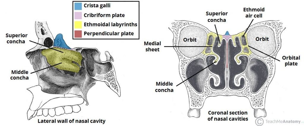 The ethmoid bone is a small unpaired bone, located in the midline of the anterior cranium – the superior aspect of the skull that encloses and protects the brain. The term ‘ethmoid’ originates from the Greek ‘ethmos’, meaning sieve. This is reflected in its lightweight, spongy structure. In this article, we shall look at the anatomy of the ethmoid bone – its location, relations, and structure. Pro Feature - 3D Model You've Discovered a Pro Feature Access our 3D Model Library Explore, cut, dissect, annotate and manipulate our 3D models to visualise anatomy in a dynamic, interactive way. Learn More Anatomical Structure The ethmoid bone is one of the 8 bones of the cranium. It is situated at the roof of the nasal cavity, and between the two orbital cavities. It contributes to the medial wall of the orbit and forms part of the anterior cranial fossa, where it separates the nasal cavity (inferiorly) from the cranial cavity (superiorly). It also forms a significant portion of the nasal septum and lateral nasal wall. The olfactory nerve (CN I) has a close anatomical relationship with the ethmoid bone. Its numerous nerve fibres pass through the cribriform plate of the ethmoid bone to innervate the nasal cavity with the sense of smell. By TeachMeSeries Ltd (2025) Fig 1The anatomical position and relations of the ethmoid bone. The ethmoid bone is made up of three parts – the cribriform plate, the perpendicular plate, and the ethmoidal labyrinth. The cribriform plate forms the roof of the nasal cavity. It is pierced by numerous olfactory nerve fibres, which gives it a sieve-like structure. Projecting superiorly from the cribriform plate is the crista galli, which provides an attachment point for the falx cerebri (sheet of dura mater that separates the two cerebral hemispheres). Another projection of bone descends from the cribriform plate – the perpendicular plate. It forms the superior two-thirds of the nasal septum. Lastly, the ethmoid bone contains two ethmoidal labyrinths. These are large masses located at either side of the perpendicular plate, which contain the ethmoidal air cells (sinuses). Two sheets of bone form each labyrinth: Orbital plate – the lateral sheet of bone, which also forms the medial wall of the orbit Medial sheet – forms the upper lateral wall of the nasal cavity, from which the superior and middle conchae extend into the nasal cavity. By TeachMeSeries Ltd (2025) Fig 2The ethmoid bone within the nasal cavity. Articulations The ethmoid bone articulates with 13 others: Paired – nasal bones, maxillae, lacrimal bones, palatine bones, inferior conchae. Unpaired – frontal, vomer and sphenoid bones. Clinical Relevance Ethmoid Fracture The ethmoid bone can be fractured in cases of facial trauma – most commonly hitting the dashboard in a collision, or a fall from height. Some signs and symptoms of fracture are related to the anatomy of the ethmoid bone: Fracture of cribriform plate – branches of the olfactory bulb may be sheared. This may cause anosmia (loss of sense of smell). Fracture of the labyrinth – may allow communication between the nasal cavity and the orbit. It is then possible for air to enter the orbit and cause orbital emphysema. Clinical Relevance CSF Rhinorrhoea A fracture to the cribriform plate may allow communication between the nasal cavity and the central nervous system. Consequently, cerebrospinal fluid (CSF) can enter the nasal cavity and drain out from the nose. This manifests clinically as a clear watery discharge from one side of the nose – and is known as CSF rhinorrhoea. The leaks normally stop spontaneously and can be managed conservatively, however surgery is sometimes required. Spontaneous CSF rhinorrhoea can also occur due to congenital or acquired defects in the ethmoid bone. Do you think you’re ready? Take the quiz below Pro Feature - Quiz The Ethmoid Bone Question 1 of 3 Submitting... Skip Next Rate question: You scored 0% Skipped: 0/3 1800 More Questions Available Upgrade to TeachMeAnatomy Pro Challenge yourself with over 1800 multiple-choice questions to reinforce learning Learn More Rate This Article
