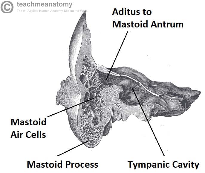 The temporal bone contributes to the lower lateral walls of the skull. It contains the middle and inner portions of the ear, and is crossed by the majority of the cranial nerves. The lower portion of the bone articulates with the mandible, forming the temporomandibular joint of the jaw. In this article, we shall look at the anatomy of the temporal bone – its component parts, articulations, and clinical correlations. By TeachMeSeries Ltd (2025) Fig 1Lateral view of the skull. The temporal bone has been highlighted. Pro Feature - 3D Model You've Discovered a Pro Feature Access our 3D Model Library Explore, cut, dissect, annotate and manipulate our 3D models to visualise anatomy in a dynamic, interactive way. Learn More Anatomical Structure The temporal bone itself is comprised of five constituent parts. The squamous, tympanic and petromastoid parts make up the majority of the bone, with the zygomatic and styloid processes projecting outwards. By TeachMeSeries Ltd (2025) Fig 1.1The constituent parts of the temporal bone. We shall now examine the constituent parts of the temporal bone in more detail. Squamous Also known as the squama temporalis, this is the largest part of the temporal bone. It is flat and plate-like, located superiorly. The outer facing surface of the squamous bone is convex in shape, forming part of the temporal fossa. The lower part of the squamous bone is the site of origin of the temporalis muscle The bone articulates with the sphenoid bone anteriorly, and parietal bone laterally. Zygomatic Process The zygomatic process arises from the lower part of the squama temporalis. It projects anteriorly, articulating with the temporal process of the zygomatic bone. These two structures form the zygomatic arch (palpable as ‘cheek bones’). One of the zygomatic processes’ attachments to the temporal bone forms the articular tubercle – the anterior boundary of the mandibular fossa, part of the temporomandibular joint The masseter muscles attaches some fibres to the lateral surface of the zygomatic process. Tympanic The tympanic part of the temporal bone lies inferiorly to the squamous, and anteriorly to the petromastoid part. It surrounds the external auditory opening, which leads into the external auditory meatus of the external ear. Styloid Process The styloid process located immediately underneath the opening to the auditory meatus. It acts as an attachment point for muscles and ligaments, such as the stylomandibular ligament of the TMJ. Petromastoid This portion of the temporal bone is located posteriorly. It can be split into a mastoid and petrous parts. There are two items of note on the mastoid. The first is the mastoid process, an inferior projection of bone, palpable just behind the ear. It is a site of attachment for many muscles, such as the sternocleidomastoid. Also of clinical importance are the mastoid air cells. These are hollowed out areas within the temporal bone. They act as a reservoir of air, equalising the pressure within the middle ear in the case of auditory tube dysfunction. The mastoid air cells can also become infected, known as mastoiditis. The petrous part is pyramidal shaped, and lies at the base of temporal bone. It contains the inner ear. By TeachMeSeries Ltd (2025) Fig 2Coronal section of temporal bone, showing the mastoid air cells in more detail Muscular Attachments The temporal bone serves as a point of attachment for many muscles. Due to the involvement of the temporal bone in forming the temporomandibular joint (i.e. joint of the jaw) some fibres from muscles of mastication such as the temporalis and masseter muscles attach to the temporal bone. In addition to this the mastoid process of the temporal bone is a major site of muscle attachment. Some key muscular attachments are outlined in the table below. Muscle Site of Attachment Description Temporalis Originates from the lower part of squamous Muscle of mastication Masseter Lateral zygomatic surface Muscle of mastication Sternocleidomastoid Mastoid process Superficial muscle of the neck. Involved in rotation of head and flexion of neck. Important landmark for the anterior and posterior cervical triangles. Posterior belly of digastric Mastoid process A suprahyoid muscle. Involved in processes such as swallowing. Splenius capitis Mastoid process Strap-like muscle in the back of the neck. Involved in movements such as shaking the head. Articulations A major articulation of the temporal bone is with the mandible (i.e. jaw bone) to form the temporomandibular joint which is covered in detail here. The squamous part of the temporal bone also articulates with the sphenoid bone anteriorly and the parietal bone laterally. The zygomatic process of the temporal bone also articulates with the zygomatic bone to form the zygomatic arch (i.e. cheekbones). Clinical Relevance Mastoiditis Middle ear infections (otitis media) can spread to the mastoid air cells. Due to their porous nature, they are a suitable site for pathogenic replication. The mastoid process itself can get infected, and this can spread to the middle cranial fossa, and into the brain, causing meningitis. If mastoiditis is suspected, the pus must be drained from the air cells. When doing so, care must be taken not the damage the nearby facial nerve. Clinical Relevance Temporal Bone Fractures The temporal bone is relatively strong, and thus it is usually only fractured as a result of blunt trauma to the skull. It has a varied presentation. Ear-related disorders are commonly seen, such as vertigo or hearing loss. As the facial nerve travels through the temporal bone, it can be damaged, with paralysis resulting. Other symptoms include bleeding from the ear and bruising around the mastoid process. Clinical Relevance Fractures of the Pterion Where the temporal, parietal, frontal and sphenoid bones meet, the skull is at its weakest, and susceptible to fracture. This point is known as the pterion. The middle meningeal artery (MMA) supplies the 