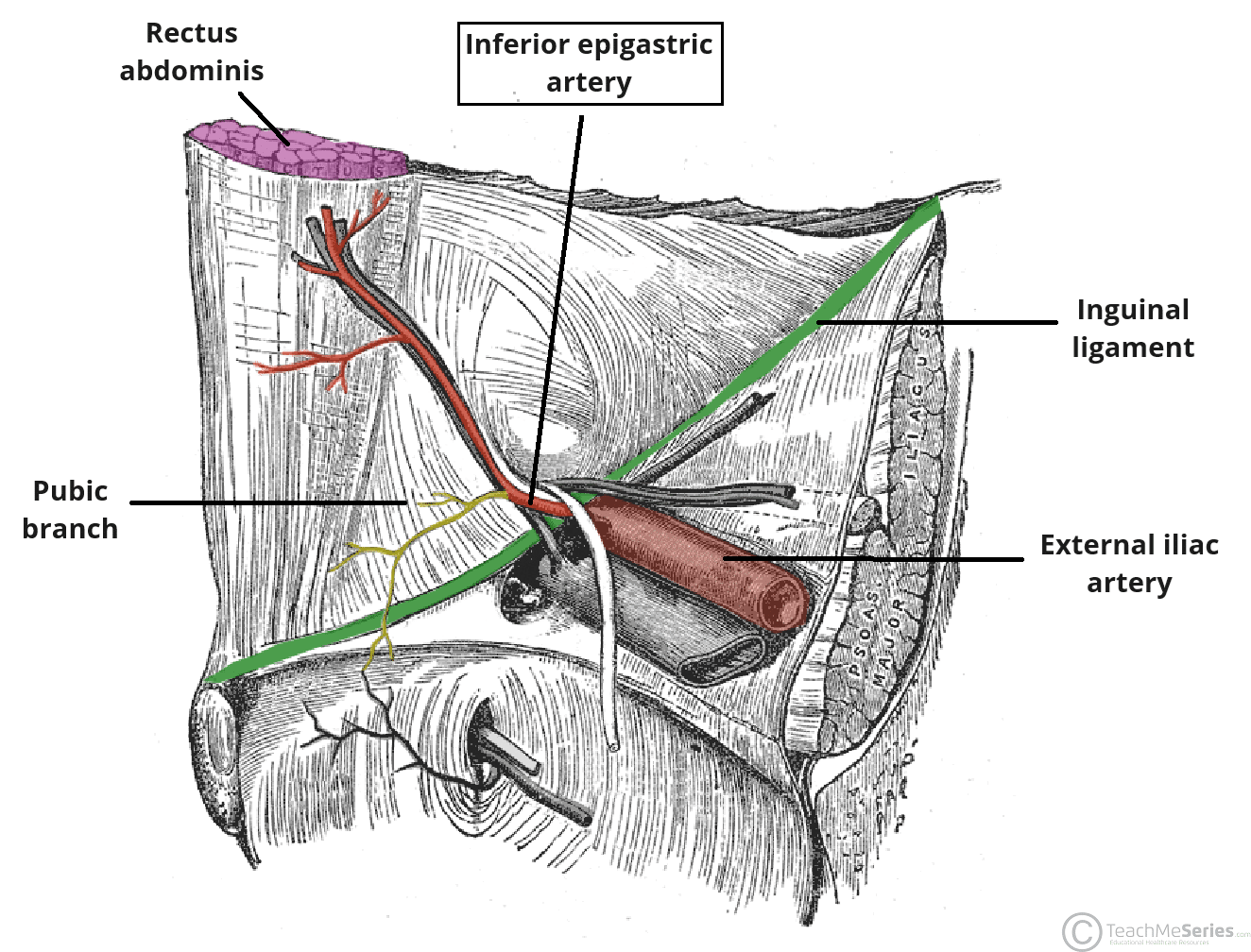 The inferior epigastric artery is an artery of the anterior abdominal wall. It arises from the external iliac artery. It contributes to the blood supply of the muscles, subcutaneous tissue and skin of the anterior abdominal wall. Pro Feature - 3D Model You've Discovered a Pro Feature Access our 3D Model Library Explore, cut, dissect, annotate and manipulate our 3D models to visualise anatomy in a dynamic, interactive way. Learn More Course The inferior epigastric artery arises from the external iliac artery, immediately superior to the inguinal ligament. After its origin, the inferior epigastric artery travels superiorly in an oblique path, passing the medial border of the deep inguinal ring. It then pierces the transversalis fascia to travel within the rectus sheath, posterior to the rectus abdominis muscle. It gives rise to several branches along its course, including the cremasteric artery, pubic branch and muscular branches. At the level of the umbilicus, the inferior epigastric artery terminates by dividing into numerous branches which anastomose with the superior epigastric artery. Note: As it passes the deep inguinal ring, the inferior epigastric artery forms the lateral border of Hesselbach’s triangle – the anatomical landmark for the site of direct inguinal hernia formation. By TeachMeSeries Ltd (2025) Fig 1The origin of the inferior epigastric artery from the external iliac artery, immediately superior to the inguinal ligament. By TeachMeSeries Ltd (2025) Fig 2Course of the inferior epigastric artery after its origin from the external iliac artery. Pro Feature - Dissection Images Dissection of the inferior epigastric artery arising from the external iliac artery. It then ascends on the posterior surface of the rectus abdominis. Dissection of the inferior epigastric artery arising from the external iliac artery. It then ascends on the posterior surface of the rectus abdominis. You've Discovered a Pro Feature Access our Dissection Image Library Enhance your understanding with high-resolution dissection images showcasing real-life anatomy. Learn More Supply The inferior epigastric artery gives rise to the following branches: Muscular branches – supply the parietal peritoneum, muscles of the anterior abdominal wall, subcutaneous tissue and skin. Cremasteric artery – supplies the cremaster muscle and spermatic cord. Public branch – supplies the pubic bones and pubic symphysis. By OpenStax [CC BY 4.0], via Wikimedia Commons Fig 3The muscles of the anterolateral abdominal wall. Note how the flat muscles form aponeuroses medially. Rate This Article
