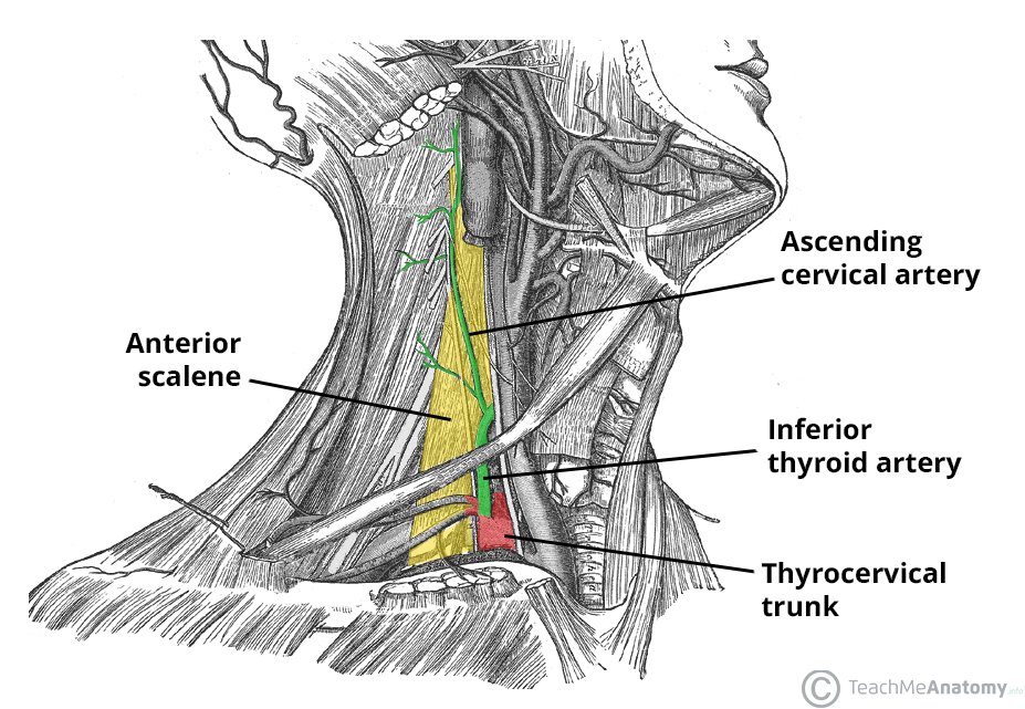The inferior thyroid artery is an artery of the anterolateral neck. It is the largest branch of the thyrocervical trunk, and the dominant blood supply to the neck. It supplies the thyroid gland and surrounding structures in the neck. Pro Feature - 3D Model You've Discovered a Pro Feature Access our 3D Model Library Explore, cut, dissect, annotate and manipulate our 3D models to visualise anatomy in a dynamic, interactive way. Learn More Course The inferior thyroid artery arises from the thyrocervical trunk at the root of the neck. It initially ascends along the surface of the scalenus anterior muscle. At the transverse process of the sixth cervical vertebrae, the vessel turns medially to head towards the thyroid gland. The inferior thyroid artery continues its medial course, passing anterior to the vertebral artery and posterior to the carotid sheath. At the level of the cricoid cartilage, the inferior thyroid artery penetrates the capsule of the thyroid gland on its posterior surface. By TeachMeSeries Ltd (2025)Fig 1The inferior thyroid artery arises from the thyrocervical trunk. Branches and Supply The inferior thyroid artery supplies structures in the neck via numerous branches: Ascending cervical artery – supplies the deep neck muscles and forms an anastomotic network which branches of the vertebral artery. Inferior laryngeal artery – supplies the laryngeal muscles and laryngeal mucosa. Muscular branches – supplies the infrahyoid muscles longus colli, scalenus anterior, and inferior pharyngeal constrictor. In addition, pharyngeal branches supply the pharynx, oesophagus, trachea, thyroid and parathyroid glands. Rate This Article