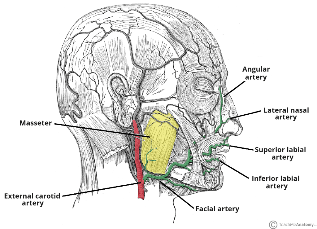 The facial artery is an artery of the head and neck region. It is the fourth main branch of the external carotid artery. It contributes to the blood supply of structures in the neck and superficial face. Pro Feature - 3D Model You've Discovered a Pro Feature Access our 3D Model Library Explore, cut, dissect, annotate and manipulate our 3D models to visualise anatomy in a dynamic, interactive way. Learn More Course The facial artery arises from the external carotid artery within the carotid triangle of the neck. It travels superiorly and obliquely, underneath the digastric and stylohyoid muscles, and closely associated with the posterior surface of the submandibular gland (it can pass through the gland itself in some individuals). It gives rise to several branches in the neck – ascending palatine, tonsillar, submental, and glandular. The facial artery then curves upwards, passing over the body of the mandible and along the inferior border of the masseter, deep to the platysma muscle. It then takes a tortuous course towards the angle of the mouth, supplying superior and inferior labial branches to the lips. It terminates by ascending along the side of the nose in the nasolabial fold, as the angular artery. By TeachMeSeries Ltd (2025) Fig 1Anatomical course of the facial artery. Pro Feature - Dissection Images The carotid bifurcation and proximal branches of the external carotid artery. Note how the hypoglossal nerve crosses anteriorly over the external carotid artery. The carotid bifurcation and proximal branches of the external carotid artery. Note how the hypoglossal nerve crosses anteriorly over the external carotid artery. You've Discovered a Pro Feature Access our Dissection Image Library Enhance your understanding with high-resolution dissection images showcasing real-life anatomy. Learn More Supply The facial artery supplies branches to numerous structures in the head and neck: Neck Ascending palatine – supplies the soft palate and palatine tonsils. Tonsillar – supplies the palatine tonsils. Submental – supplies the floor of the mouth and sublingual gland. Glandular – supplies the submandibular gland. Face: Superior and inferior labial artery – supply the upper and lower lips. Lateral nasal artery – supplies the external nose. Angular artery – supplies the external nose, lower eyelid, orbicularis oculi and lacrimal sac. By TeachMeSeries Ltd (2025) Fig 2The facial artery contributes to the blood supply of the submandibular and sublingual glands. Rate This Article