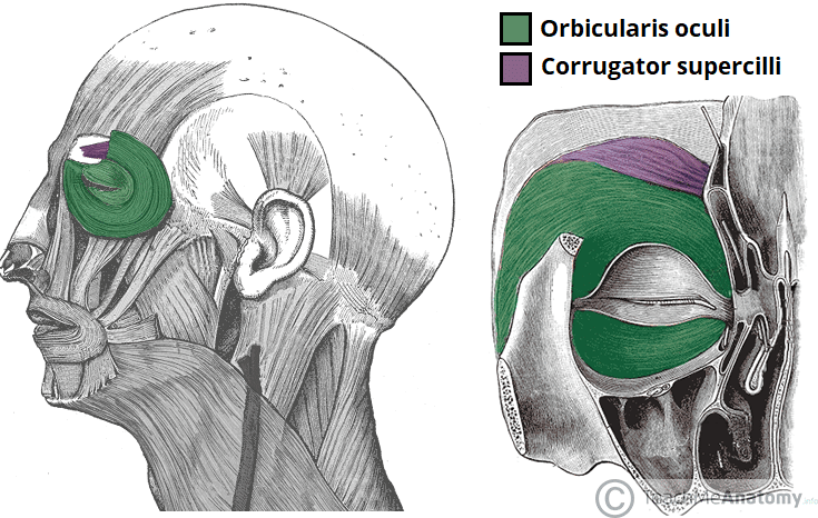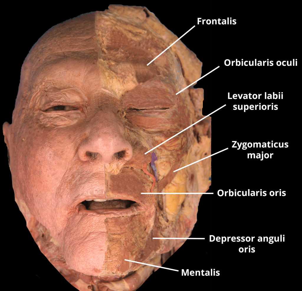 The muscles of facial expression are located within the subcutaneous tissue of the face. They originate from bone or fascia and insert onto the skin. As they contract, the muscles pull on the skin to exert their effects. These muscles all develop from the second pharyngeal arch. As they migrate from the arch, they take their nerve supply with them. As such, they are all innervated by branches of the facial nerve. The facial muscles can broadly be categorised into three groups – orbital, nasal and oral. In this article, we shall look at the anatomy of the muscles of facial expression – their attachments, actions and clinical relevance. By TeachMeSeries Ltd (2025) Fig 1Innervation to the muscles of facial expression via the facial nerve (CN VII) Pro Feature - 3D Model You've Discovered a Pro Feature Access our 3D Model Library Explore, cut, dissect, annotate and manipulate our 3D models to visualise anatomy in a dynamic, interactive way. Learn More Orbital Group The orbital group of facial muscles contains two muscles associated with the eye socket. These muscles control the movements of the eyelids, important in protecting the cornea from damage. They are both innervated by the facial nerve. Orbicularis Oculi The orbicularis oculi muscle surrounds the eye socket and extends into the eyelid. It has three distinct parts – palpebral, lacrimal, and orbital. Attachments – Originates from the medial orbital margin, the medial palpebral ligament, and the lacrimal bone. It inserts onto the skin around the margin of the orbit as well as the tarsal plates of the eyelid. Actions: Palpebral part – gently closes the eyelids. Lacrimal part – involved in the drainage of tears. Orbital part – tightly closes the eyelids. Innervation – Temporal and zygomatic branches of the facial nerve Corrugator Supercilii The corrugator supercilii is a much smaller muscle and is located posteriorly to the orbicularis oculi. Attachments – Originates from the medial aspect of the superciliary arch and inserts onto the skin of the eyebrow. Actions – Draws the eyebrows together, creating vertical wrinkles on the bridge of the nose (associated with frowning). Innervation – Temporal branches of the facial nerve. By TeachMeSeries Ltd (2025) Fig 2The two orbital muscles of facial expression. Clinical Relevance Paralysis to the Orbital Muscles If the facial nerve becomes damaged, the orbital muscles will cease to function. As they are the only muscles that can close the eyelids, this has some serious clinical consequences. The eye cannot shut – this can cause the cornea to dry out. This is known as exposure keratitis. The lower eyelid droops, called ectropion. Lacrimal fluid pools in the lower eyelid and cannot be spread across the surface of the eye. This can result in a failure to remove debris, and ulceration of the corneal surface. The test for facial nerve palsy involves raising the eyebrows and closing the eyelids. Pro Feature - Dissection Images Prosection of the face, demonstrating the anterior facial muscles. Prosection of the face, demonstrating the anterior facial muscles. You've Discovered a Pro Feature Access our Dissection Image Library Enhance your understanding with high-resolution dissection images showcasing real-life anatomy. Learn More Nasal Group The nasal group of facial muscles are associated with movements of the nose and the skin surrounding it. Nasalis The nasalis is the largest of the nasal muscles and is comprised of two parts: transverse and alar. Attachments: Transverse part – originates from the maxilla, immediately lateral to the nose. It attaches onto an aponeurosis across the dorsum of the nose. Alar part – originates from the maxilla overlying the lateral incisor. It attaches to the alar cartilage of the nasal skeleton. Actions: Transverse part – compresses the nasal opening. Alar part – widens the nasal opening. Innervation – Buccal branches of the facial nerve. Procerus The procerus is the most superior of the nasal muscles. It lies superficially to the other muscles of facial expression. Attachments – Originates from the nasal bone and inserts onto the skin of the lower medial forehead. Actions – Pulls the eyebrows downward to produce transverse wrinkles over the nose (associated with frowning) Innervation – Buccal branches of the facial nerve Depressor Septi Nasi The depressor septi nasi muscle assists the alar part of the nasalis in opening the nostrils. Attachments – Originates from the maxilla (above the medial incisor tooth) and inserts onto the nasal septum. Actions – Pulls the nasal septum inferiorly to widen the nasal opening. Innervation – Buccal branches of the facial nerve. By TeachMeSeries Ltd (2025) Fig 3The nasal muscles of facial expression. Note the nasalis muscle is comprised of two parts. Oral Group The oral muscles of facial expression are responsible for the movements of the mouth and lips. They are required in singing and whistling and add emphasis to vocal communication. The group consists of the orbicularis oris, buccinator, and various smaller muscles. Orbicularis Oris The orbicularis oris is the main sphincter muscle of the lips. Attachments – Arises from the maxilla and from the other muscles of the cheek. It inserts onto the skin and mucous membrane of the lips. Action – Closes the lips to narrow the oral opening. Innervation – Buccal branches of the facial nerve. Buccinator The buccinator is a thin, square-shaped muscle. It is located between the mandible and maxilla, deep to the other muscles of the face. Attachments – Originates from the maxilla and mandible. The fibres run in an inferomedial direction, blending with the orbicularis oris muscle and the skin of the lips. Actions – Pulls the cheek inwards against the teeth, preventing accumulation of food in that area. Innervation – Buccal branches of the facial nerve. Minor Oral Muscles There are other minor muscles that act on the lips and mouth. They can