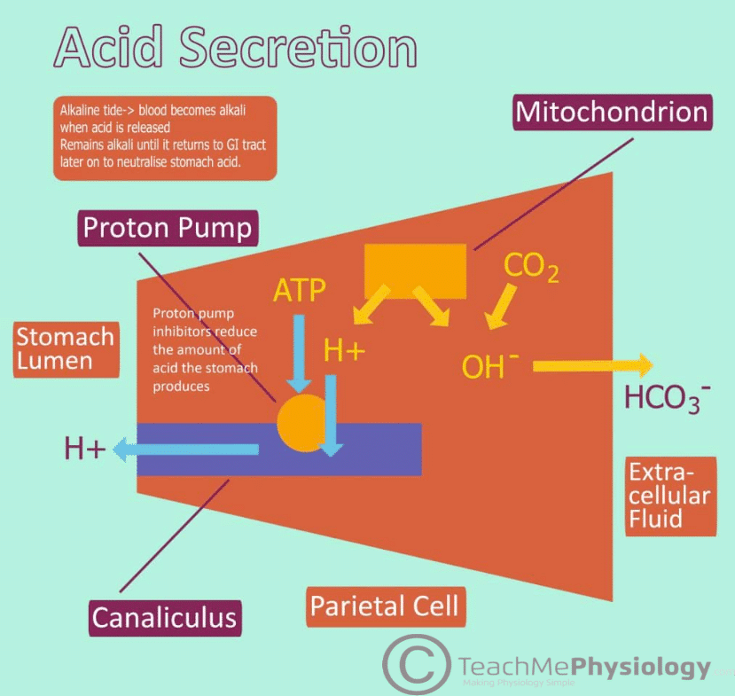 The stomach is a gastrointestinal organ that is responsible for preliminary digestion and destroying any potential pathogenic microorganisms that may have been ingested. It is an acidic environment with a pH that can vary between 1.5-3.5. This article will outline the production of gastric acid, the regulation of this and some clinical conditions that result from this process going wrong. Pro Feature - 3D Model You've Discovered a Pro Feature Access our 3D Model Library Explore, cut, dissect, annotate and manipulate our 3D models to visualise anatomy in a dynamic, interactive way. Learn More Hydrochloric Acid Production HCl is produced by the parietal cells of the stomach. To begin with, water (H2O) and carbon dioxide (CO2) combine within the parietal cell cytoplasm to produce carbonic acid (H2CO3), which is catalysed by carbonic anhydrase. Carbonic acid then spontaneously dissociates into a hydrogen ion (H+) and a bicarbonate ion (HCO3–). The hydrogen ion that is formed is transported into the stomach lumen via the H+– K+ ATPase ion pump. This pump uses ATP as an energy source to exchange potassium ions into the parietal cells of the stomach with H+ ions. The bicarbonate ion is transported out of the cell into the blood via a transporter protein called anion exchanger which transports the bicarbonate ion out the cell in exchange for a chloride ion (Cl–). This chloride ion is then transported into the stomach lumen via a chloride channel. This results in both hydrogen and chloride ions being present within the stomach lumen. Their opposing charges leads to them associating with each other to form hydrochloric acid (HCl). By TeachMeSeries Ltd (2025) Fig 1Diagram showing the production of Hydrochloric acid within the stomach. Control of Gastric Acid Production At rest, the number of H+– K+ ATPases present within the parietal cell membrane is minimal. The rest are sequestered within tubulovesicles in the parietal cell. Upon stimulation the vesicles fuse with the cell membrane which leads to the increased insertion of H+– K+ ATPase into the membrane, hence allowing for the increased movement of hydrogen ions into the stomach thus increasing acid production. Increasing Gastric Acid Production There are three ways in which acid production is increased. The first of these is via ACh, which is released from the vagus nerve. This is released firstly during the cephalic phase of digestion, which is activated upon seeing or chewing food, leading to direct stimulation of parietal cells via the vagus nerve. It is also produced during the gastric phase of digestion when intrinsic nerves detect distension of the stomach, stimulating the production of ACh by the vagus nerve. The main regulation pathway involves the hormone gastrin which is secreted from G cells in the stomach. G cells are activated by the vagus nerve, gastrin related peptide, and by peptides in the stomach lumen produced via protein digestion. Activation of the G cells leads to the production of gastrin which is released into the blood and travels through the blood until it reaches the parietal cells. Gastrin binds to CCK receptors on the parietal cells which also elevates calcium levels causing increased vesicular fusion. Finally, enterochromaffin-like cells in the stomach secrete histamine which binds to H2 receptors on the parietal cells. These cells release histamine in response to the presence of gastrin and ACh. This leads to increased fusion however it is via the secondary messenger cAMP as opposed to calcium in the other methods. Decreasing Gastric Acid Production There are a number of ways in which acid production can be decreased. The first of these is via accumulation of acid in the empty stomach between meals. This increase in acid leads to a lower pH within the stomach, which inhibits the secretion of gastrin, via the production of somatostatin from D cells. Once food has been broken down into chyme, it passes into the duodenum, triggering the enterogastric reflex. This reflex can be stimulated by distention of the small bowel, if there is excess acid in the upper intestine, the presence of protein breakdown products as well as excess irritation to the mucosa. Inhibitory signals are sent to the stomach via the enteric nervous system, as well as signals to the medulla – reducing vagal stimulation of the stomach. The enterogastric reflex is important in slowing down gastric emptying when the intestines are already filled. The presence of chyme within the duodenum also stimulates entero-endocrine cells to release cholecystokinin and secretin, both of which play a variety of important roles in completing digestion, but also inhibit gastric acid secretion. Secretin is released by the S cells of the duodenum when there is excessive acid production in the stomach. Other hormones including glucose-dependent insulinotropic peptide (GIP) and vasoactive intestinal polypeptide also work to decrease acid production in the stomach. Clinical Relevance Hypersecretion Excessive secretion of stomach acid can lead to the formation of peptic ulcers. Potential complications of peptic ulcers include excessive bleeding due to erosion through a blood vessel. There are two main drugs used to prevent excessive acid formation. H2 antagonists such as ranitidine bind to the H2 receptors preventing the binding of histamine and thus reduce acid secretion. It is important to note that the other two pathways for stomach acid secretion still operate, thus acid secretion is only reduced and not completely inhibited. Proton pump inhibitors (PPIs) such as omeprazole bind to the H+– K+ ATPase (proton pump), hence preventing the transportation of hydrogen ions into the stomach lumen. PPIs completely prevent stomach acid formation due to hydrogen ions not being able to react with chloride ions in the stomach. Clinical Relevance Achlorhydria This is a state where there is a decrease in the volume of stomach acid produced. Achlorhydria can result in 