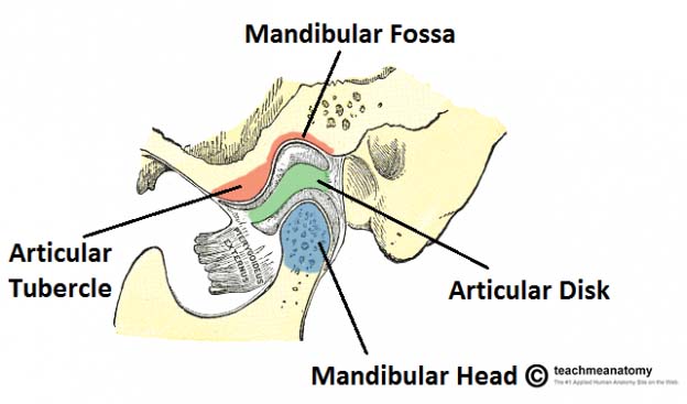 The key joint of the head is the temporomandibular joint (TMJ). The temporomandibular joint is formed by a bilateral articulation between the mandible and the temporal bones. The articulating bony structures are lined with fibrocartilage and separated by an articular disc to form two synovial joint cavities.